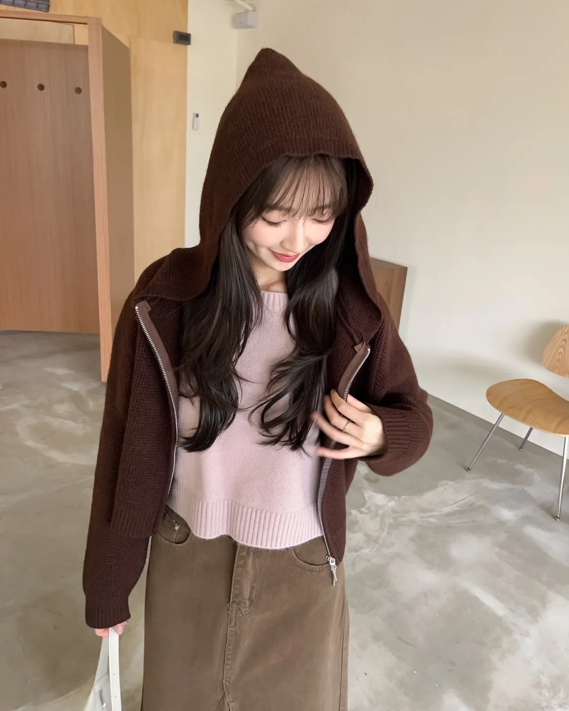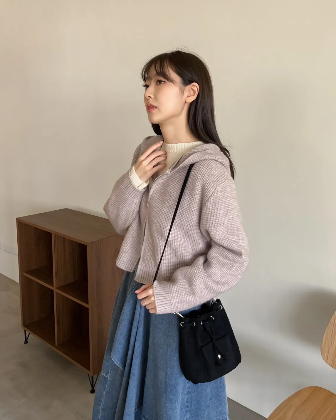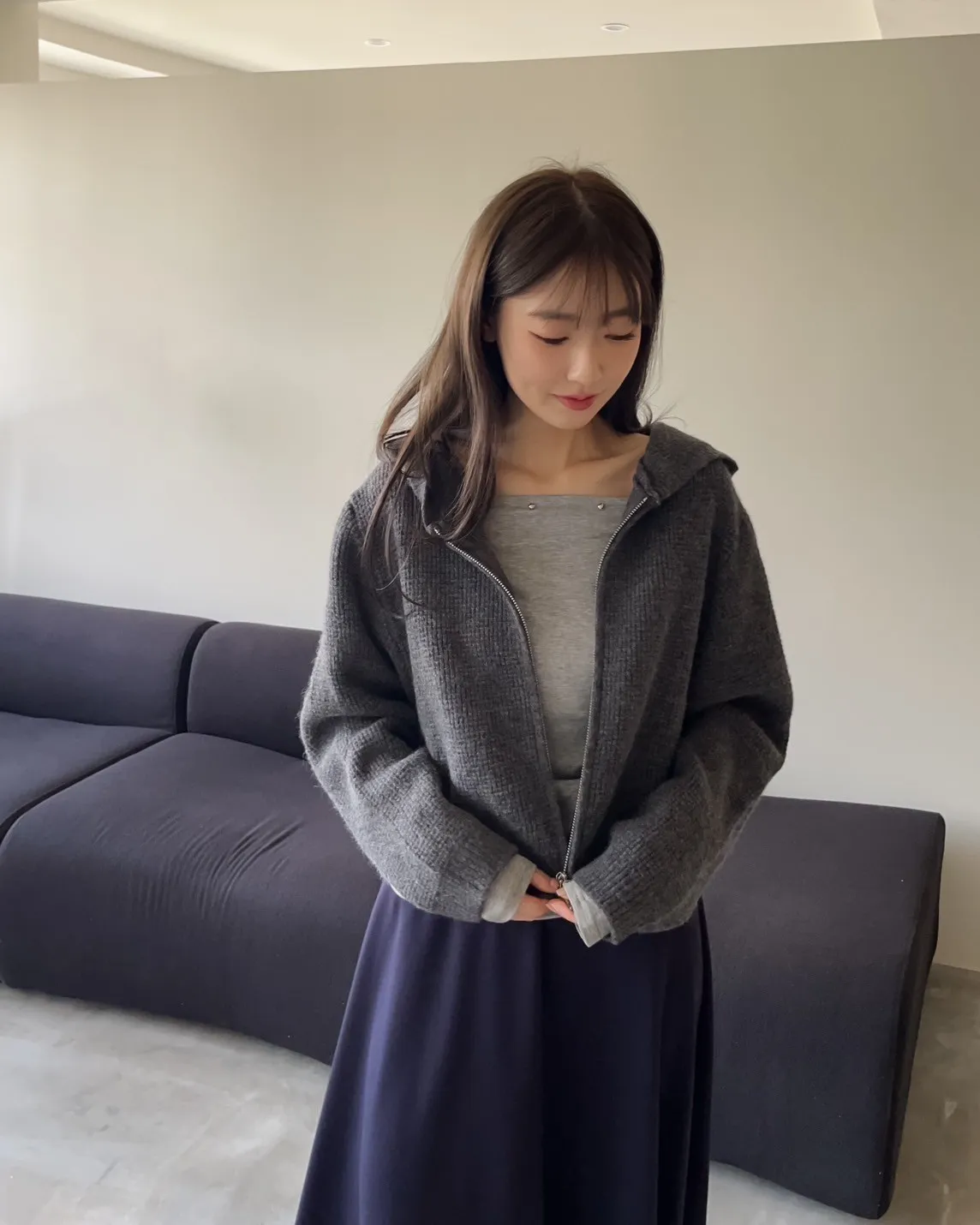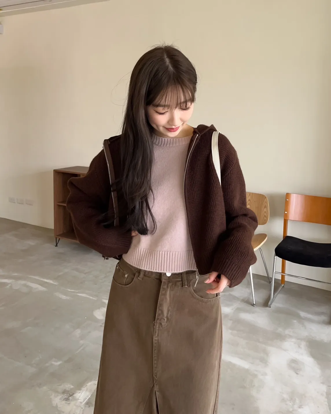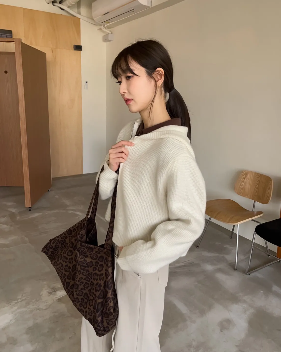 V0076(七色)華夫格雙拉鏈連帽針織外套(米白/咖啡/藍/粉紅/淺灰/深灰/黑)