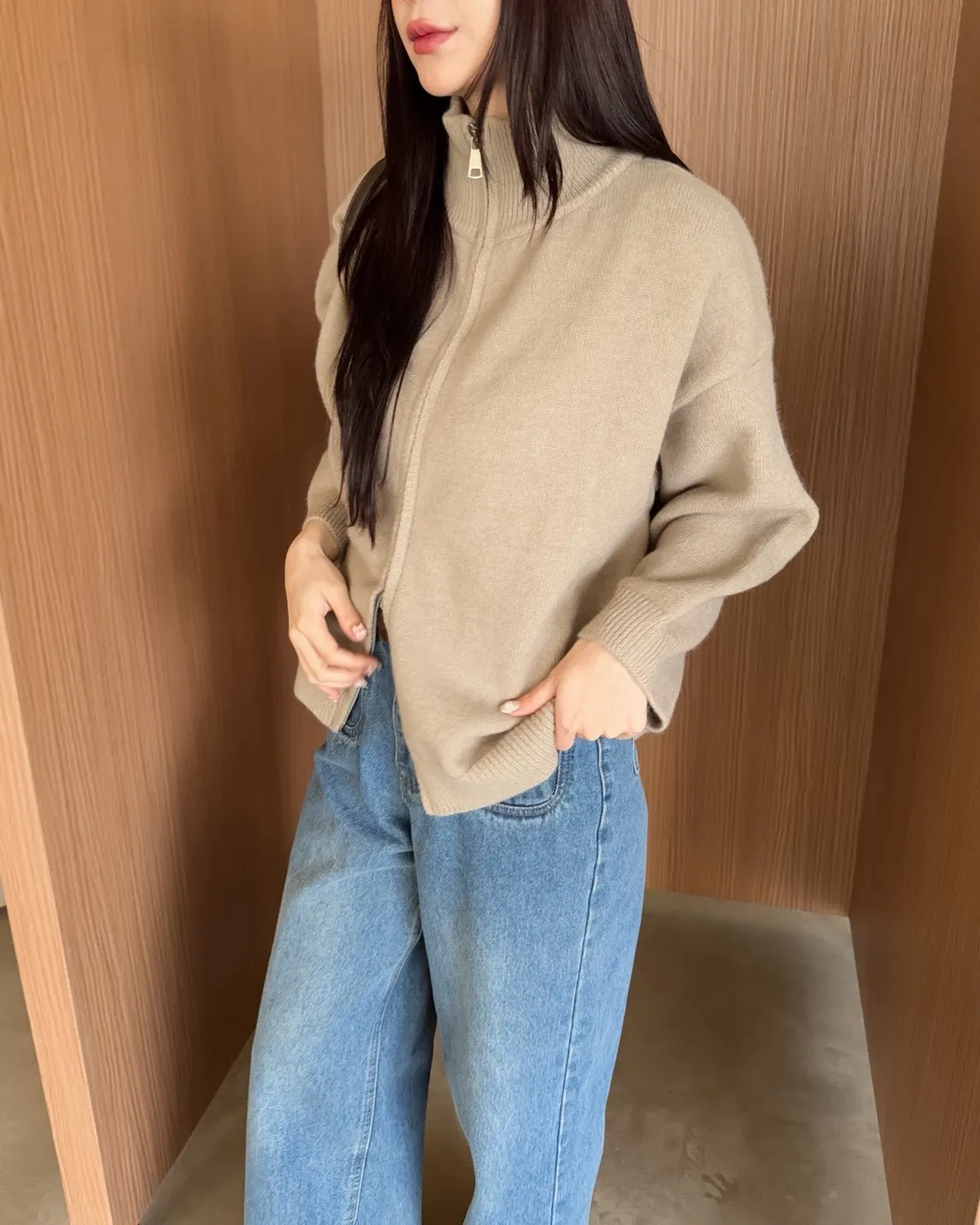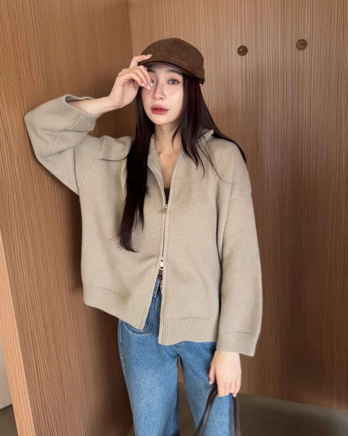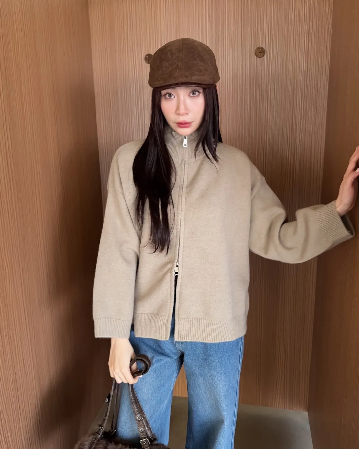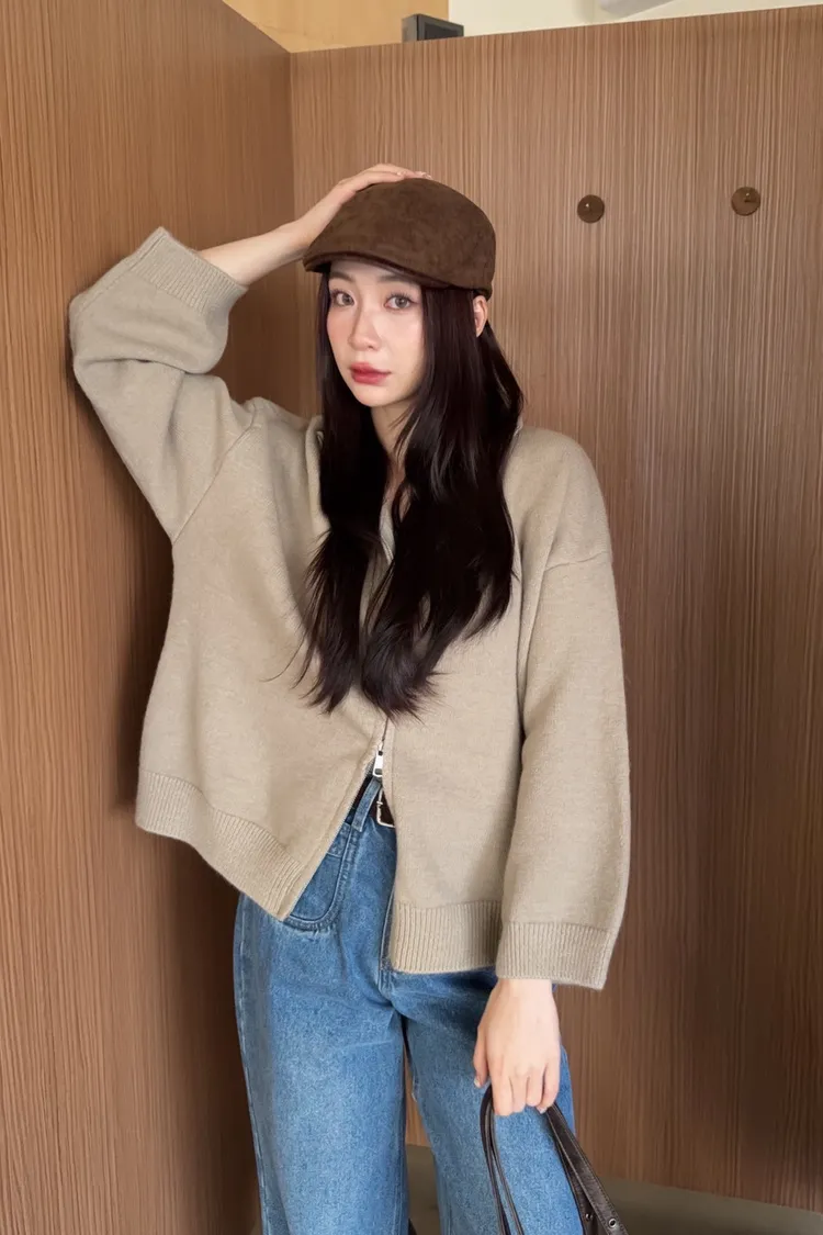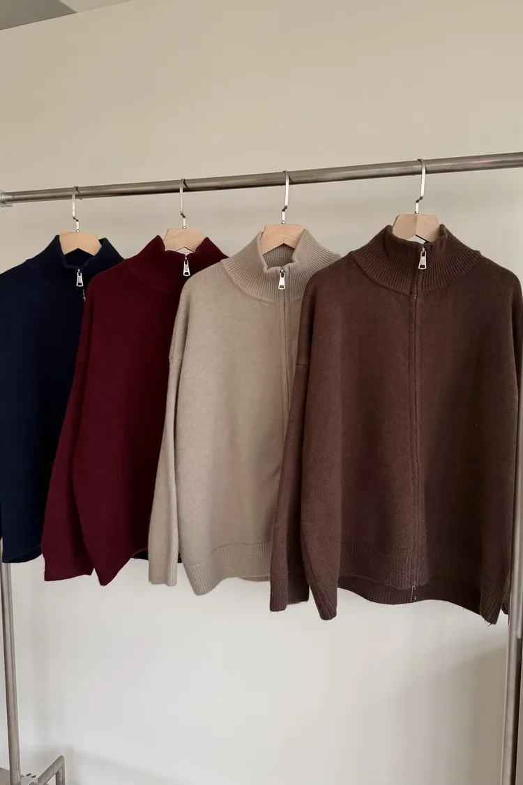 X0003俐落雙拉鍊立領毛衣外套(卡其/咖啡/深藍/紅)