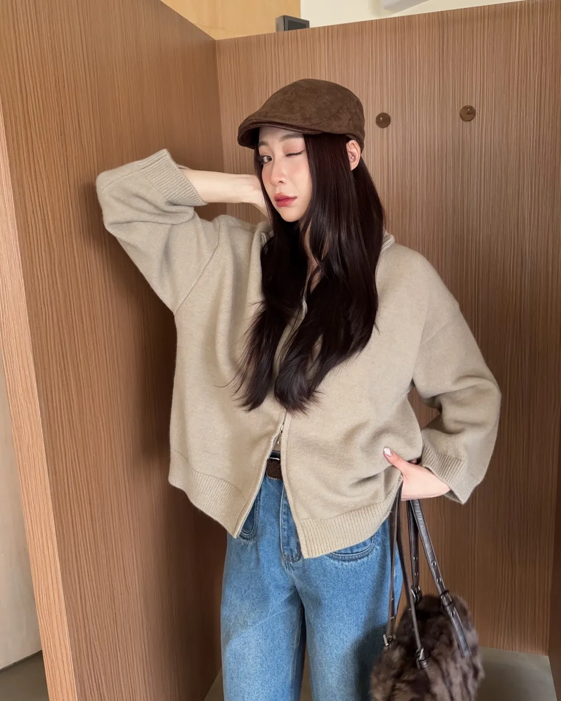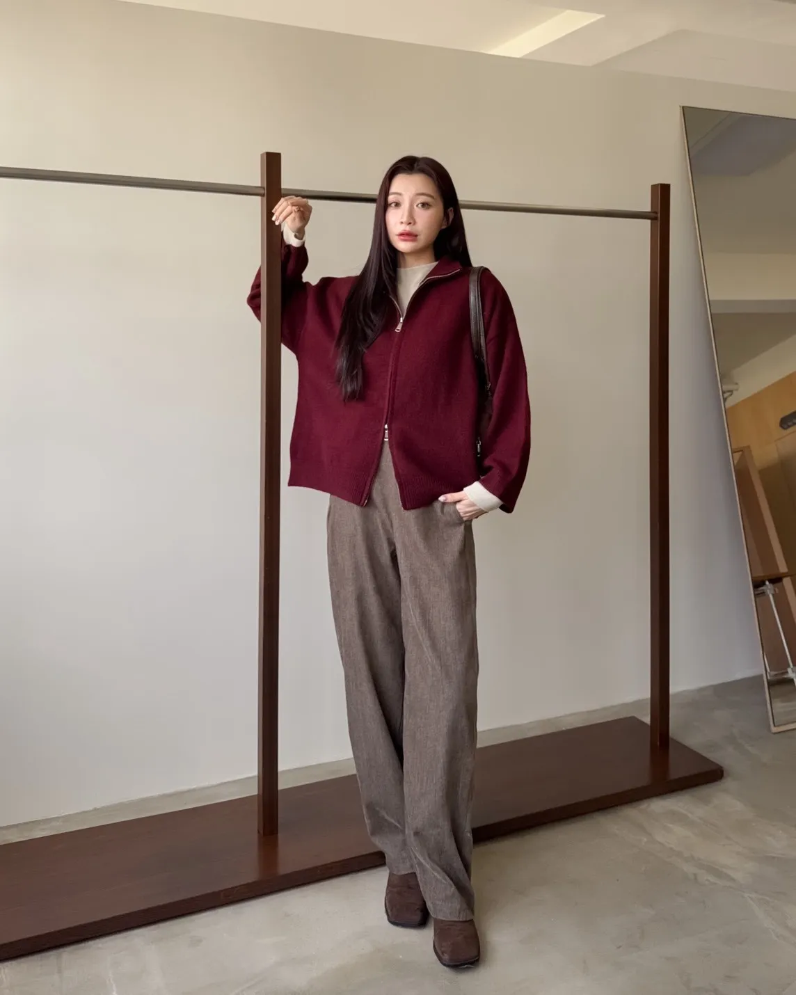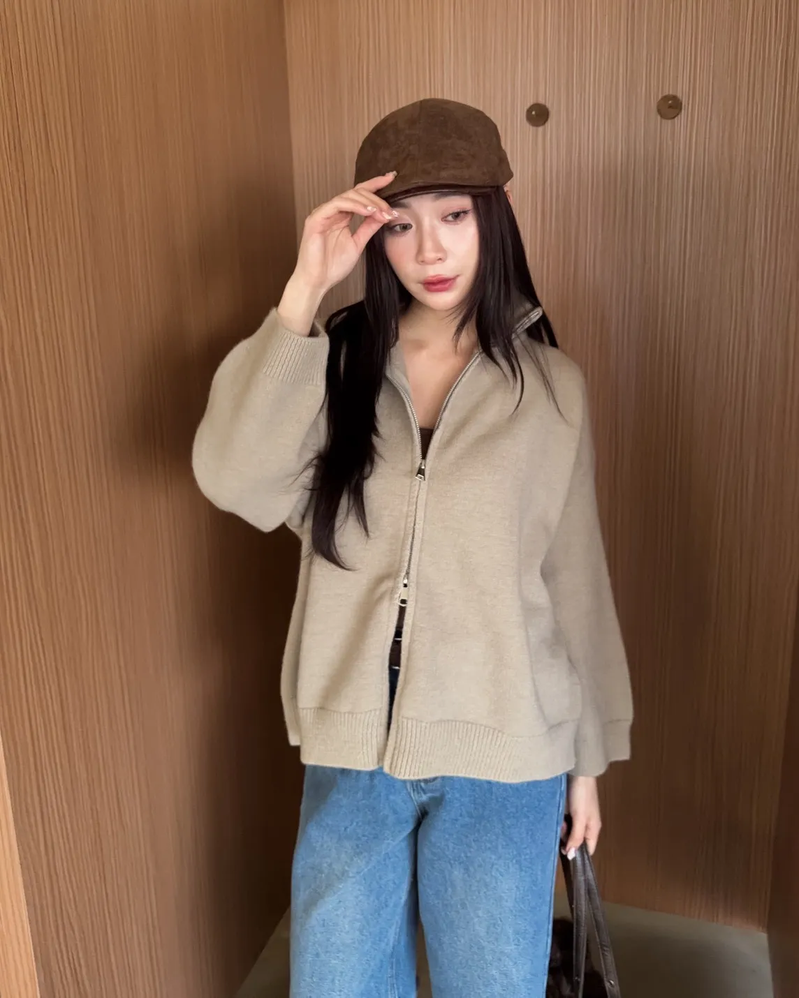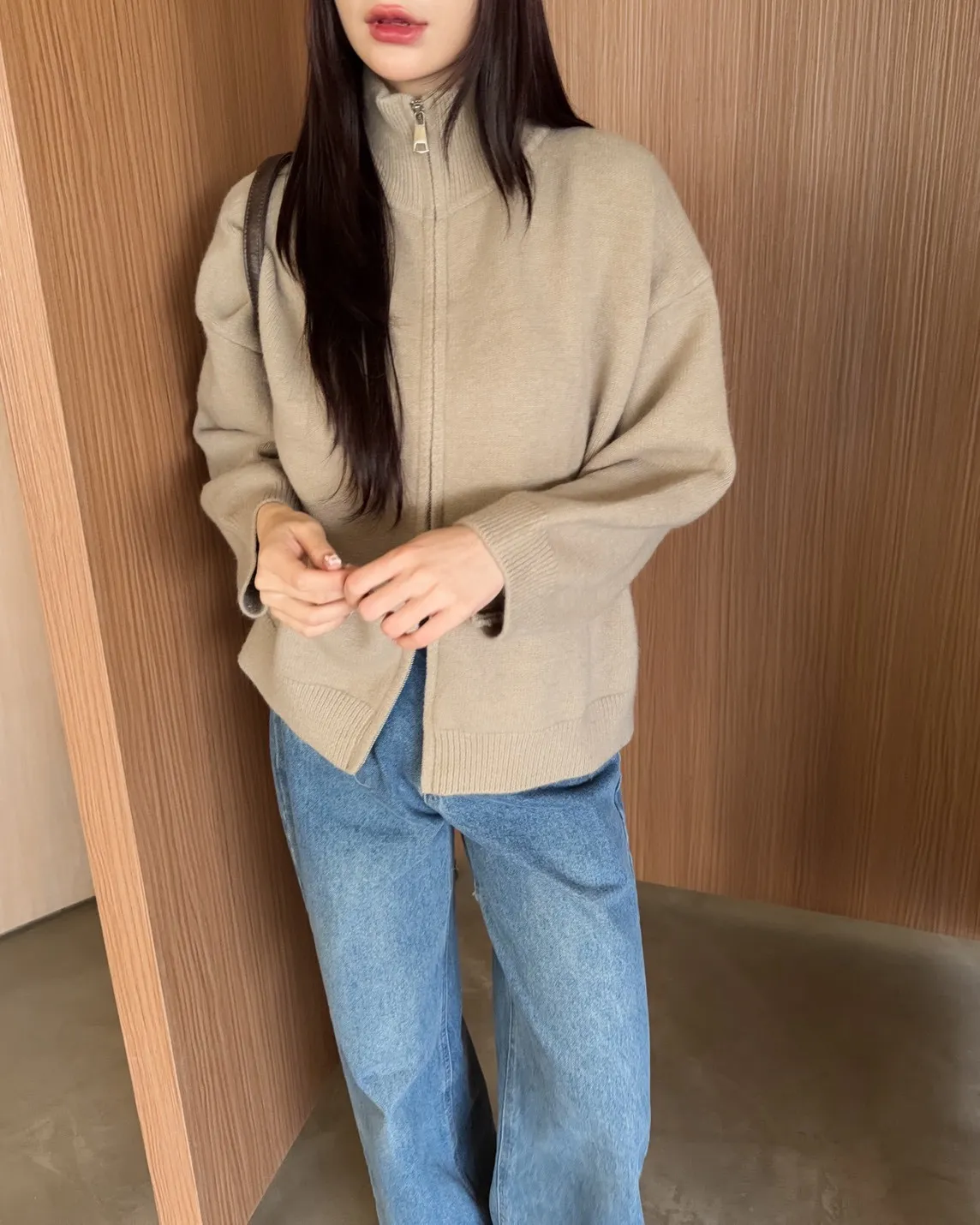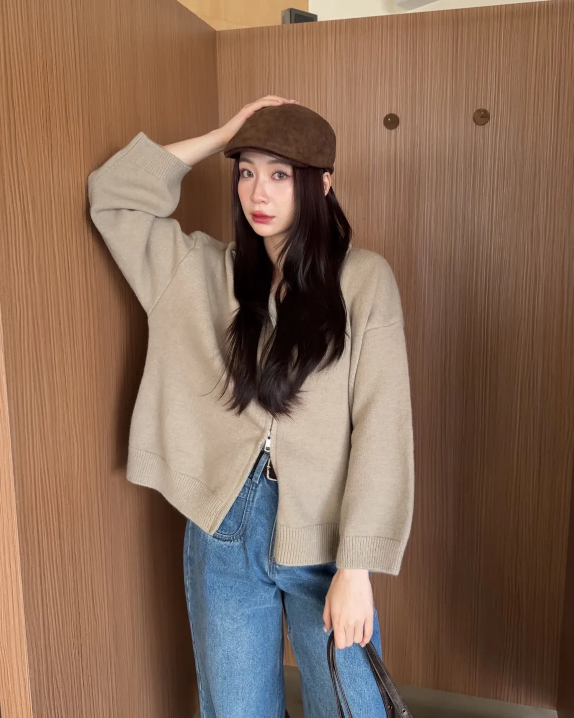 X0003俐落雙拉鍊立領毛衣外套(卡其/咖啡/深藍/紅)