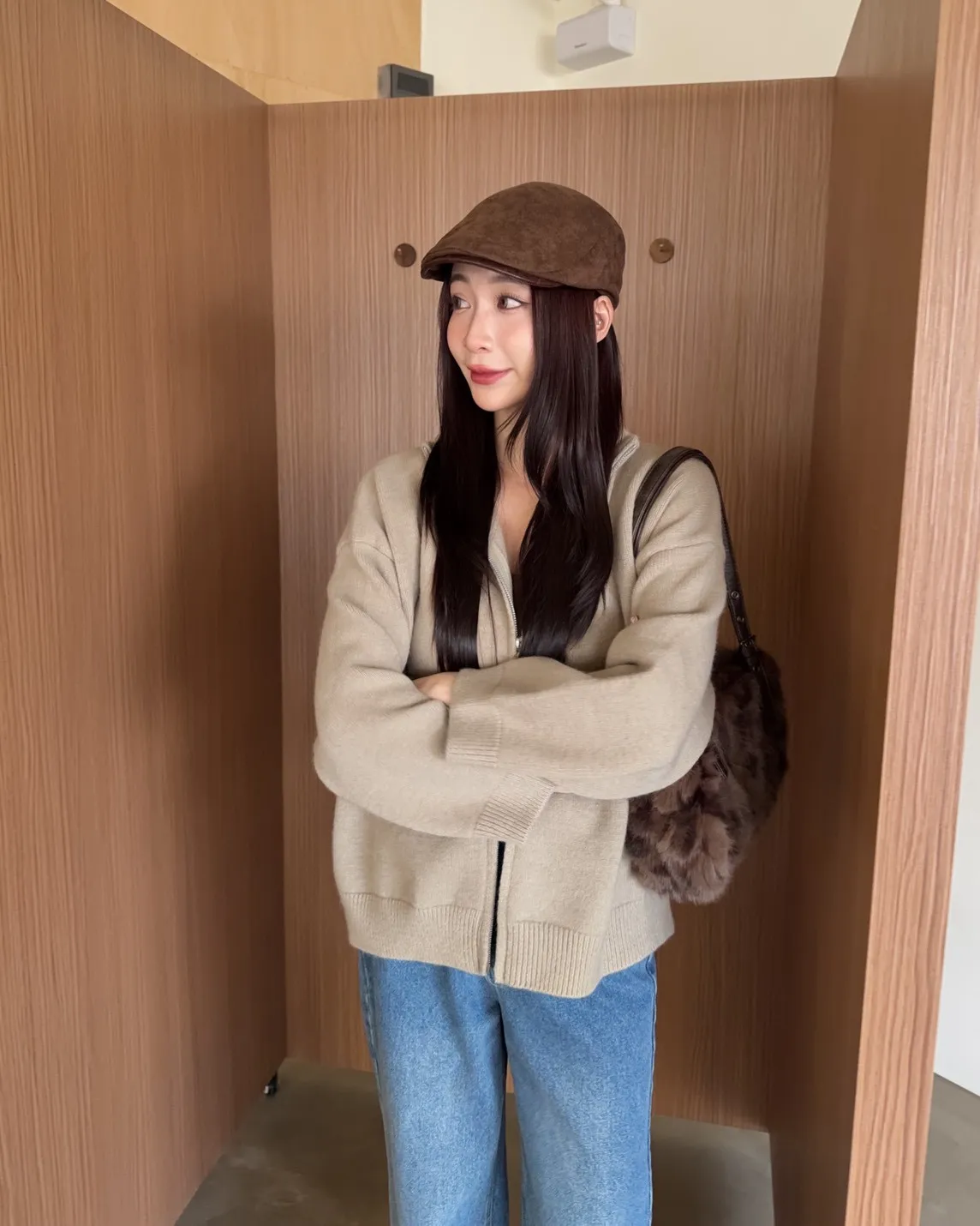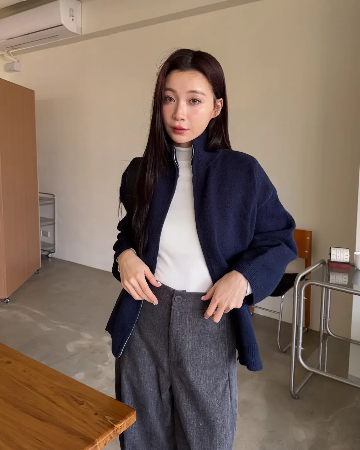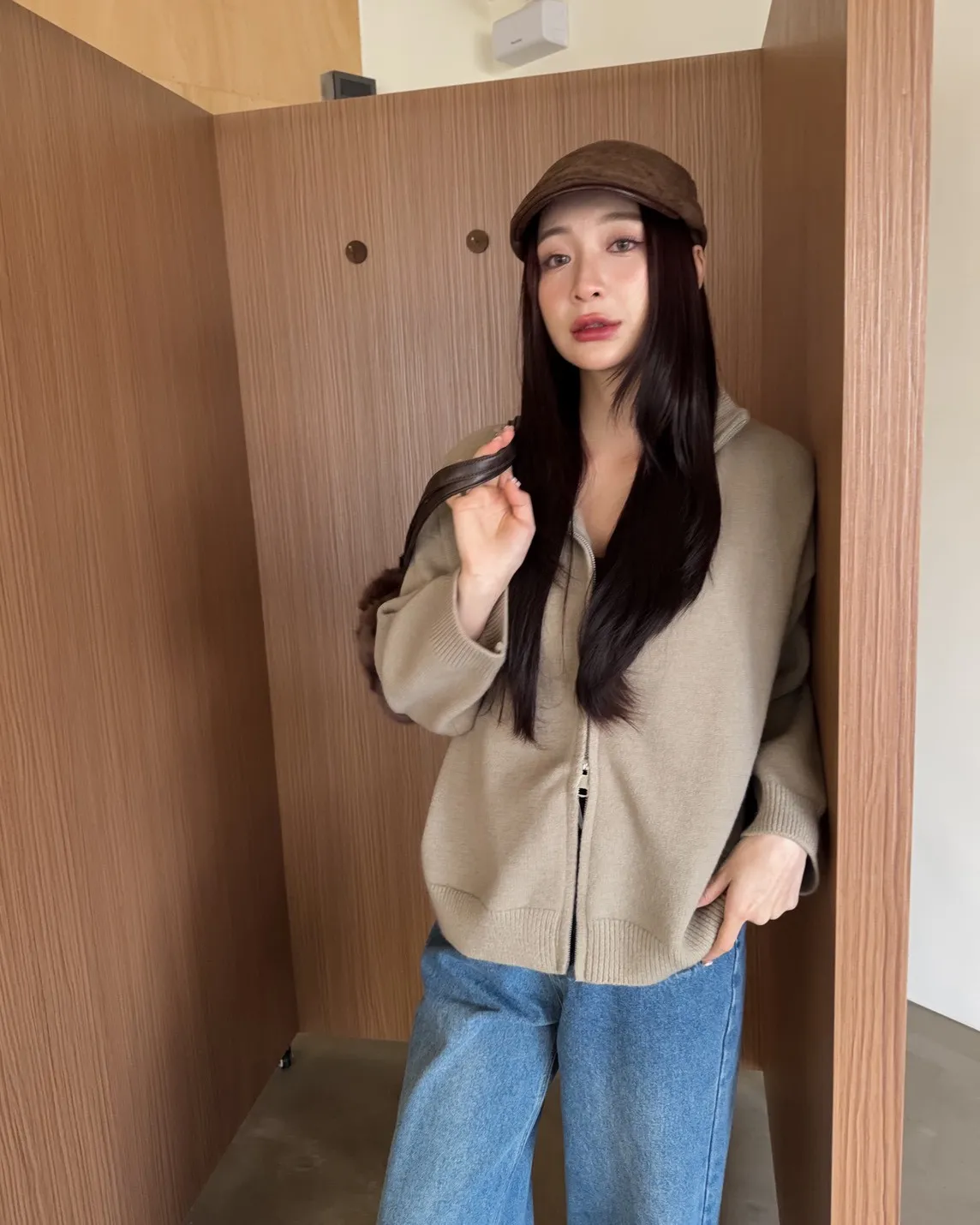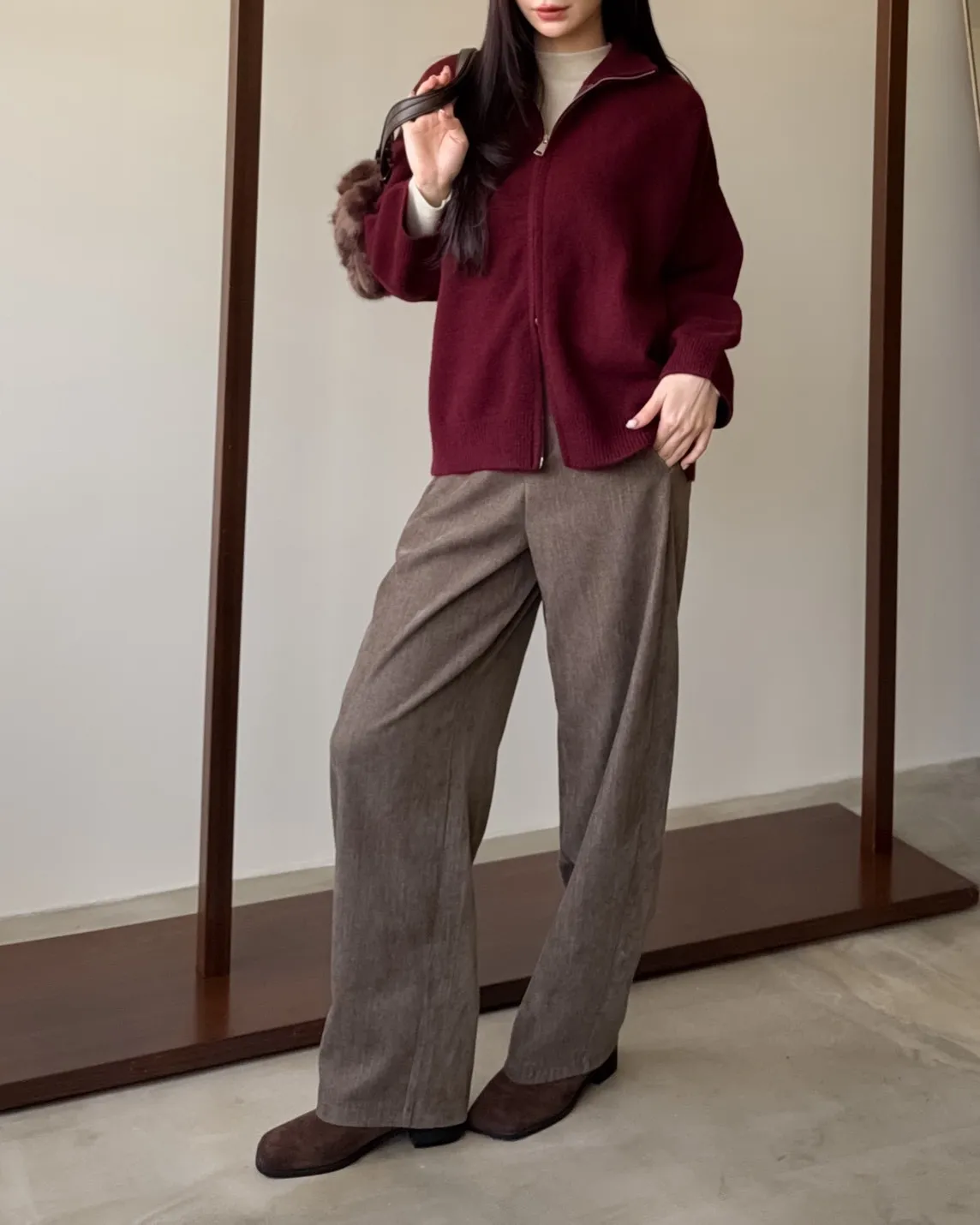 X0003俐落雙拉鍊立領毛衣外套(卡其/咖啡/深藍/紅)