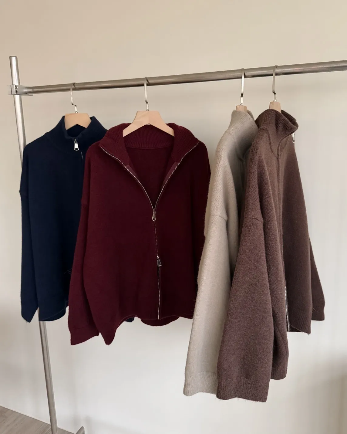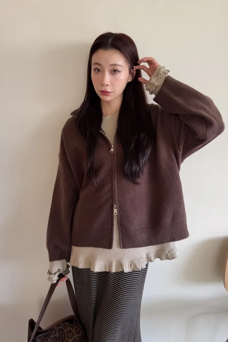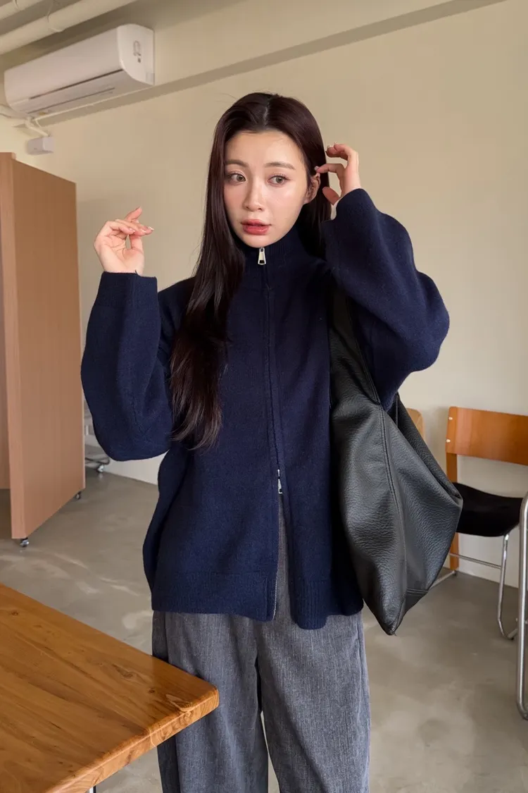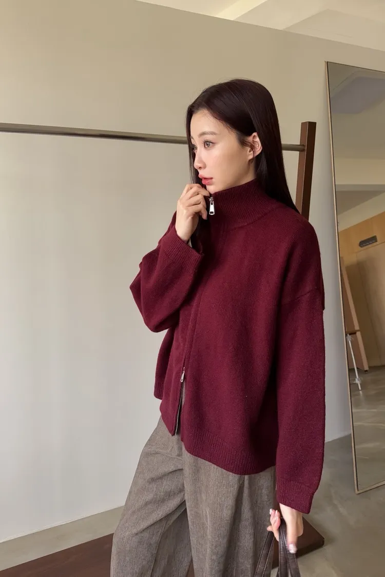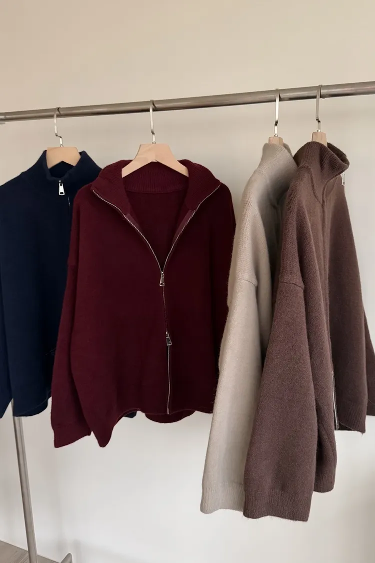 雙拉鍊 立領 厚實針織 寬鬆落肩 飽和色系