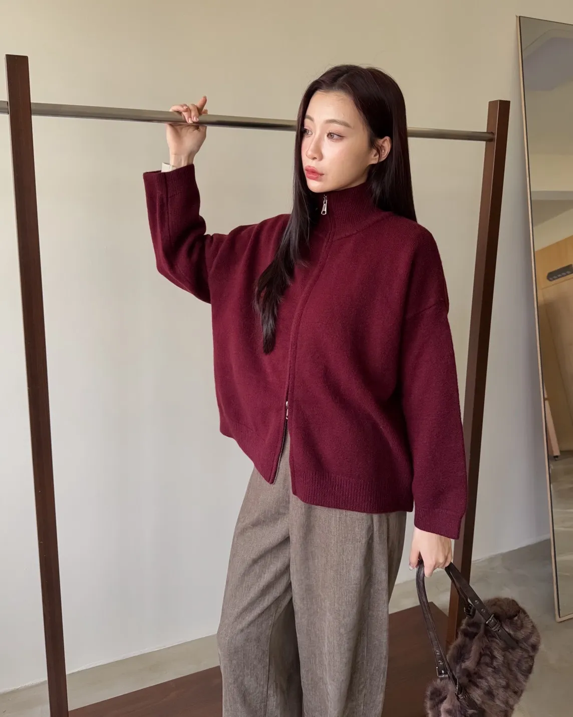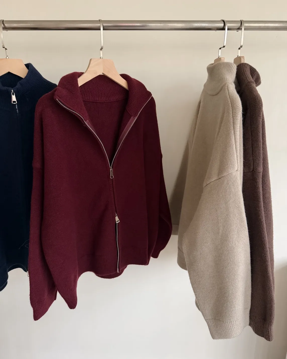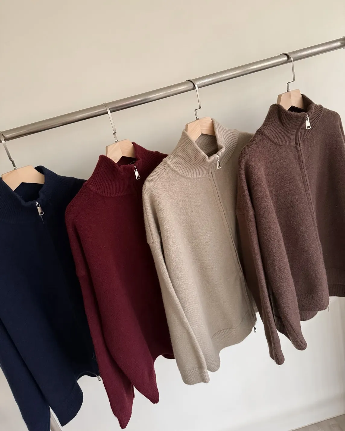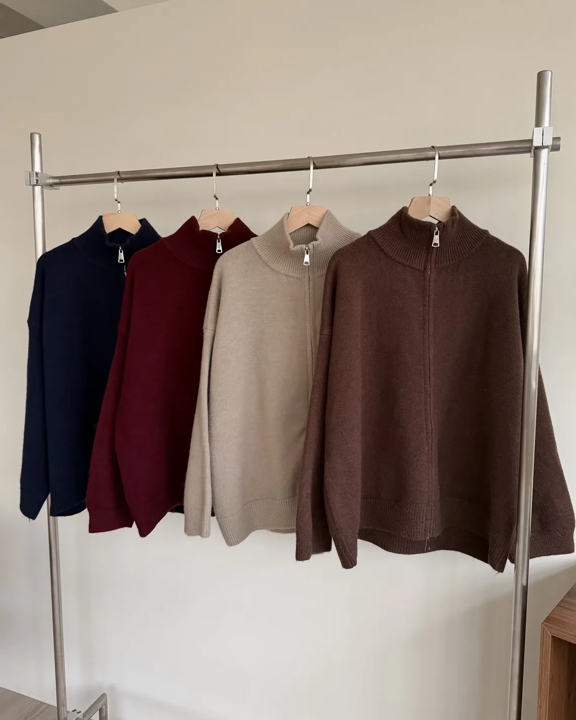 雙拉鍊 立領 厚實針織 寬鬆落肩 飽和色系