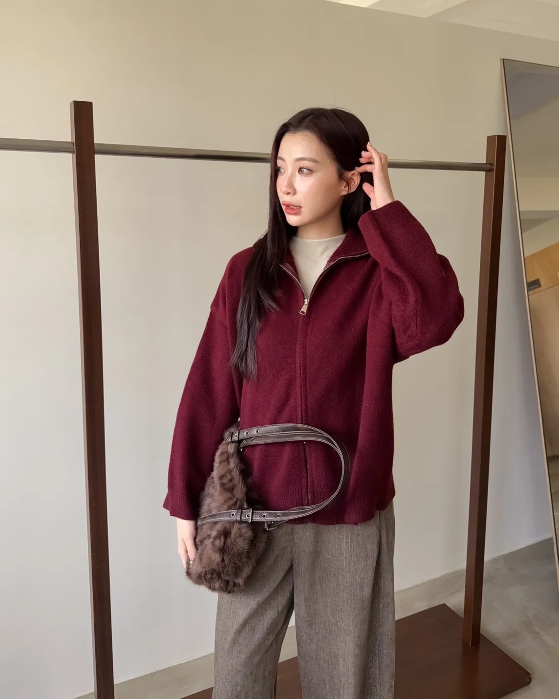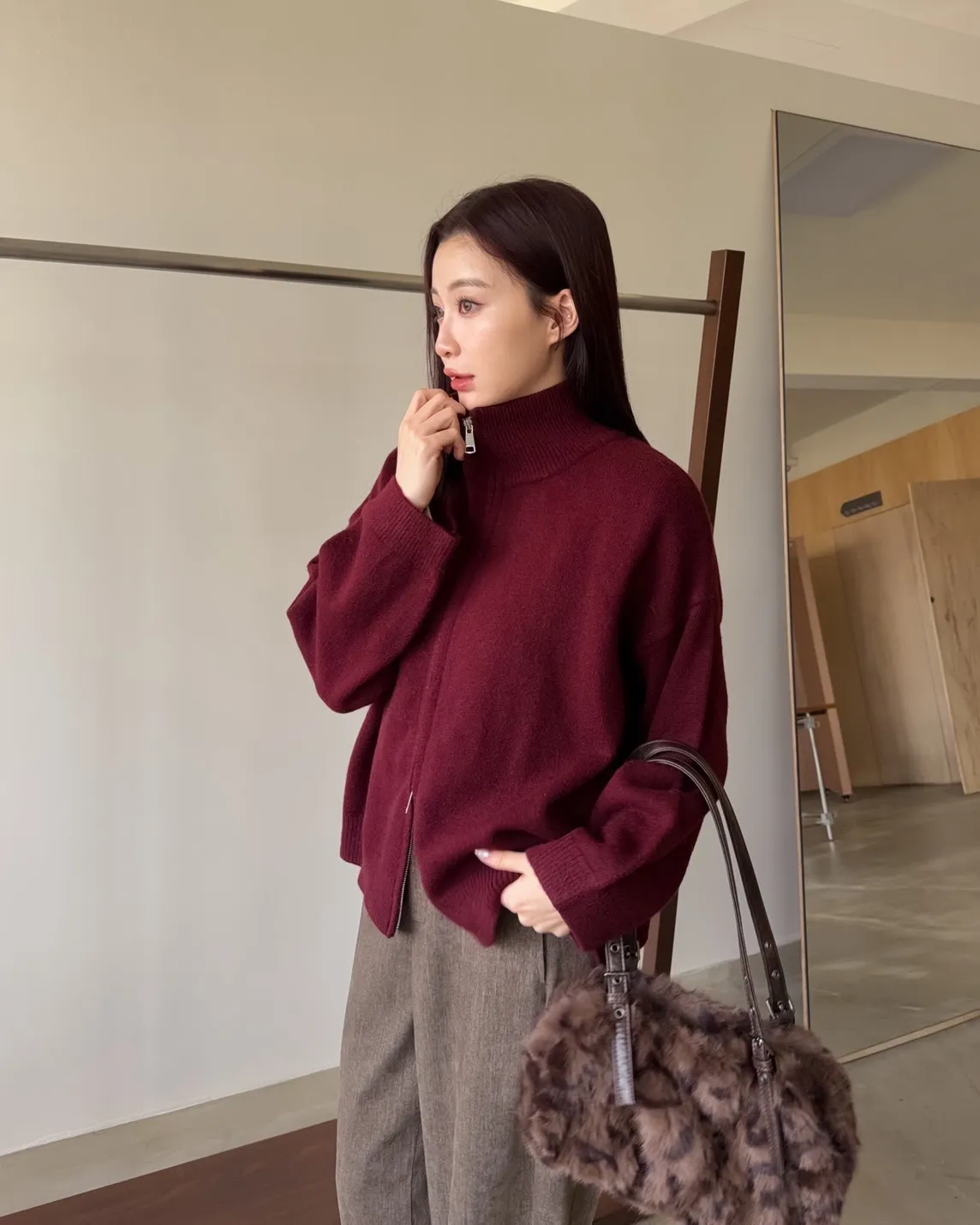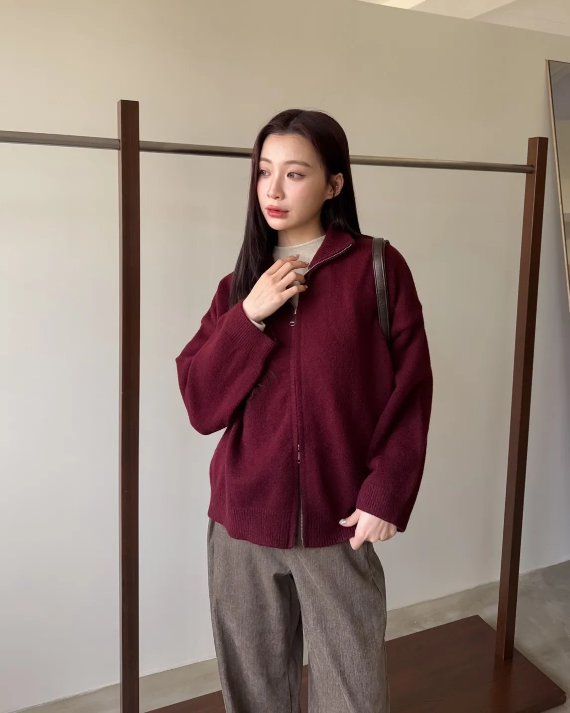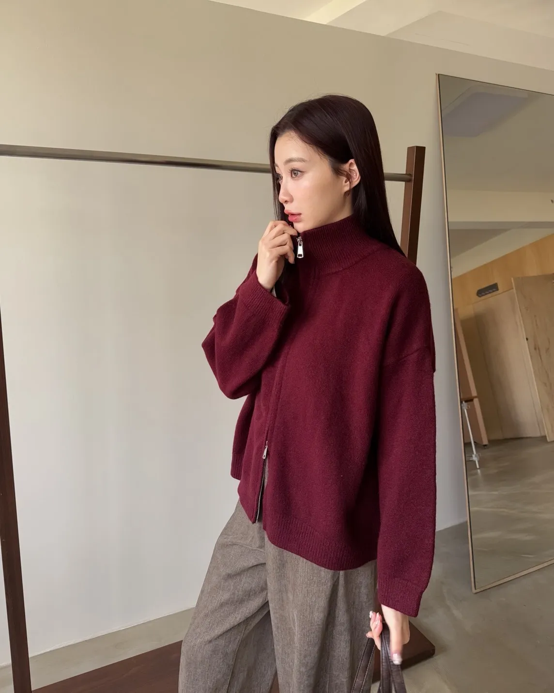 雙拉鍊 立領 厚實針織 寬鬆落肩 飽和色系