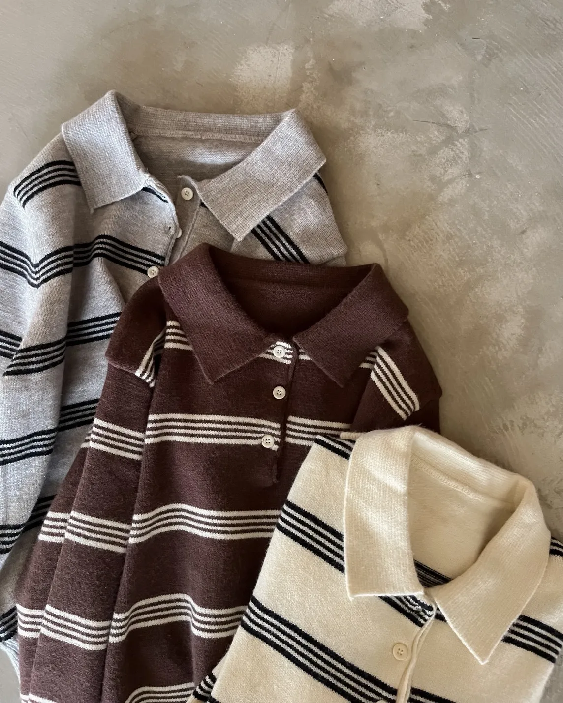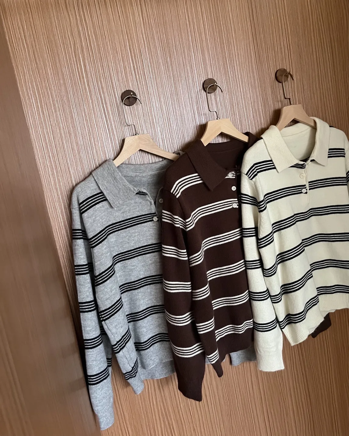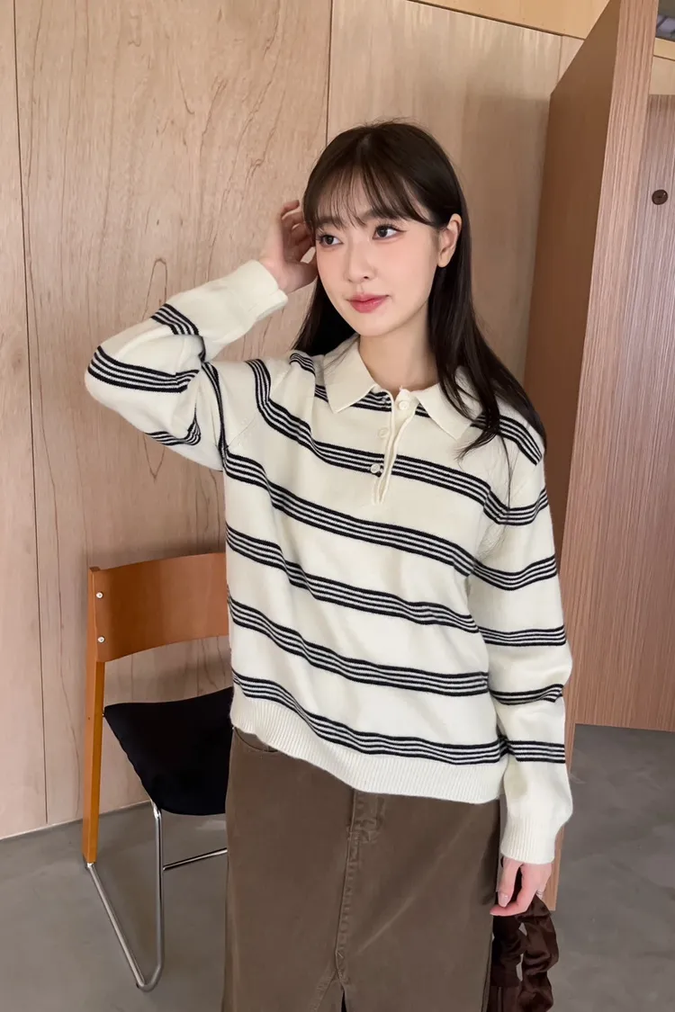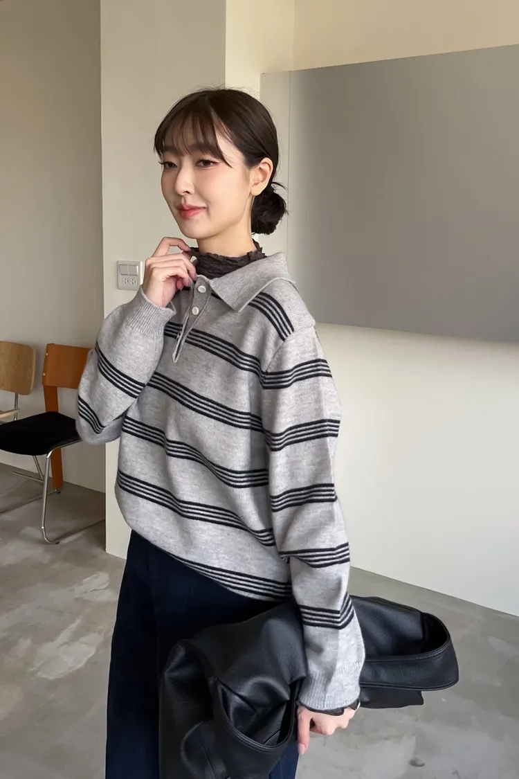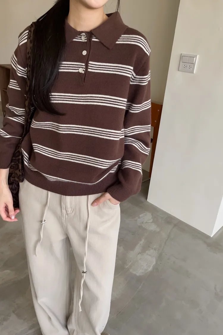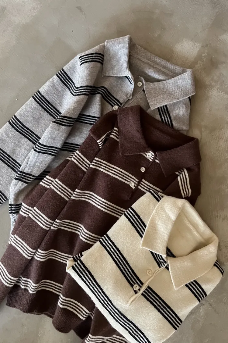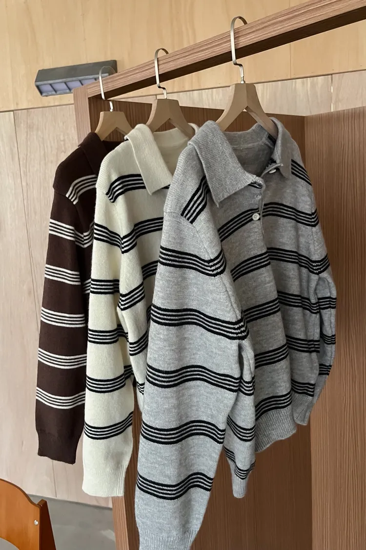 V0086小鈕扣POLO領橫紋毛衣(米/咖啡/灰)
