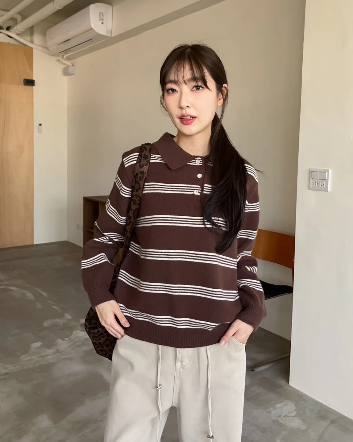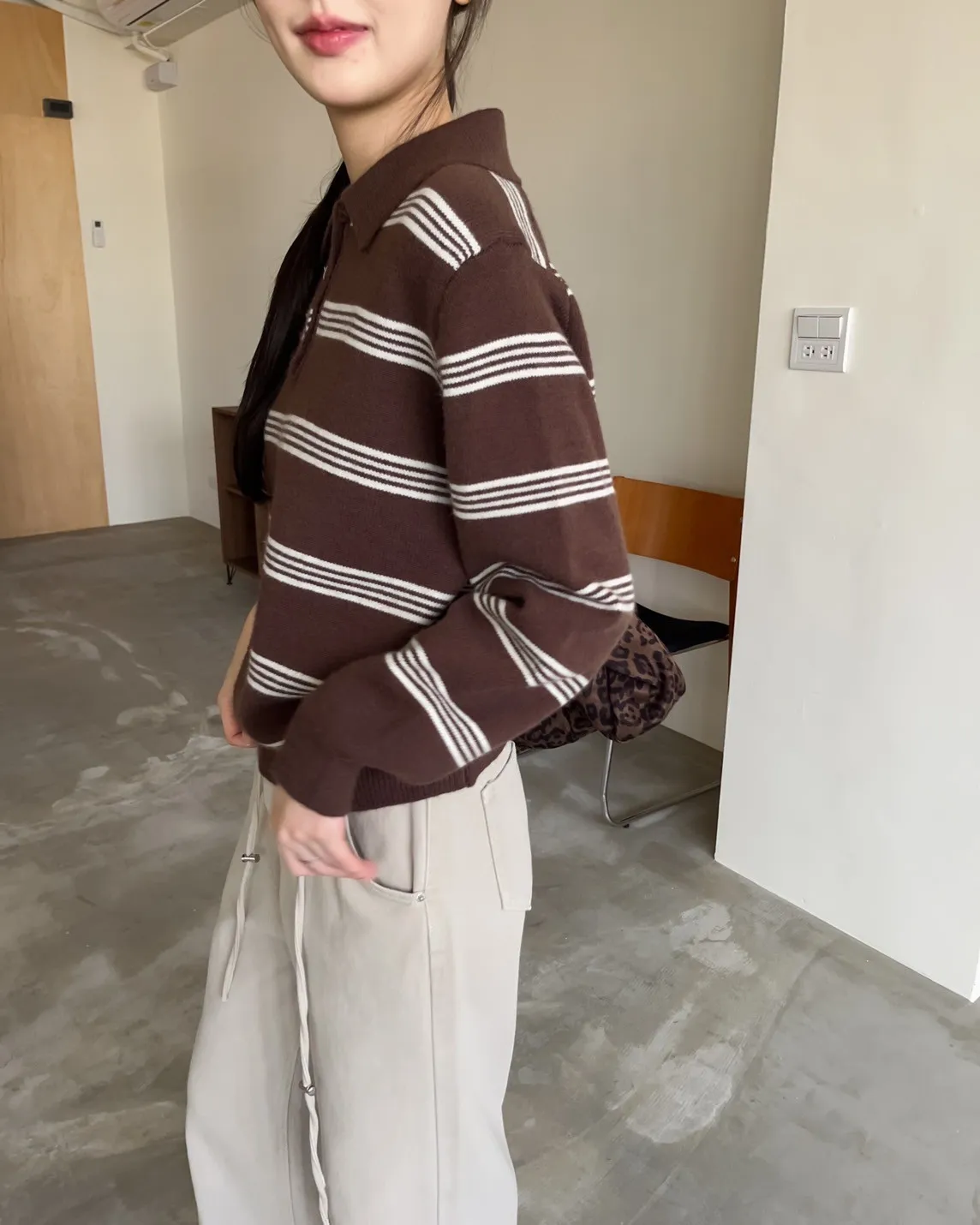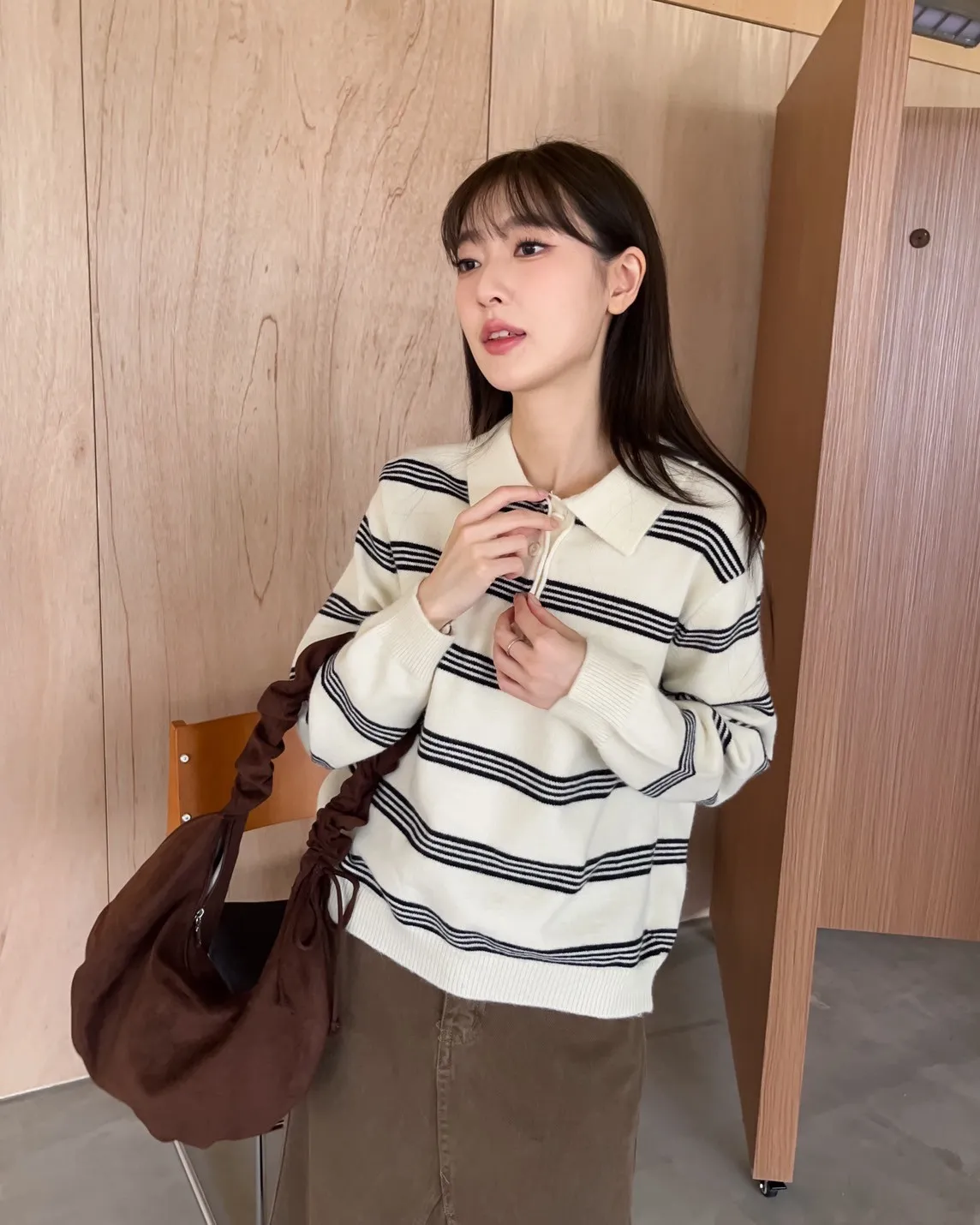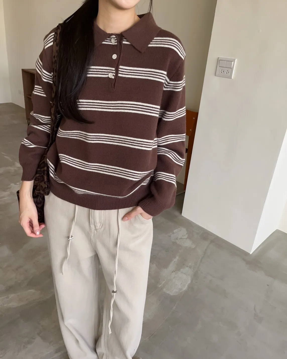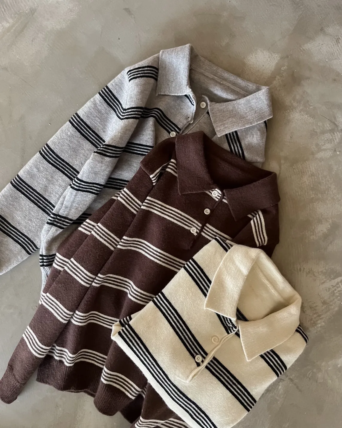 V0086小鈕扣POLO領橫紋毛衣(米/咖啡/灰)