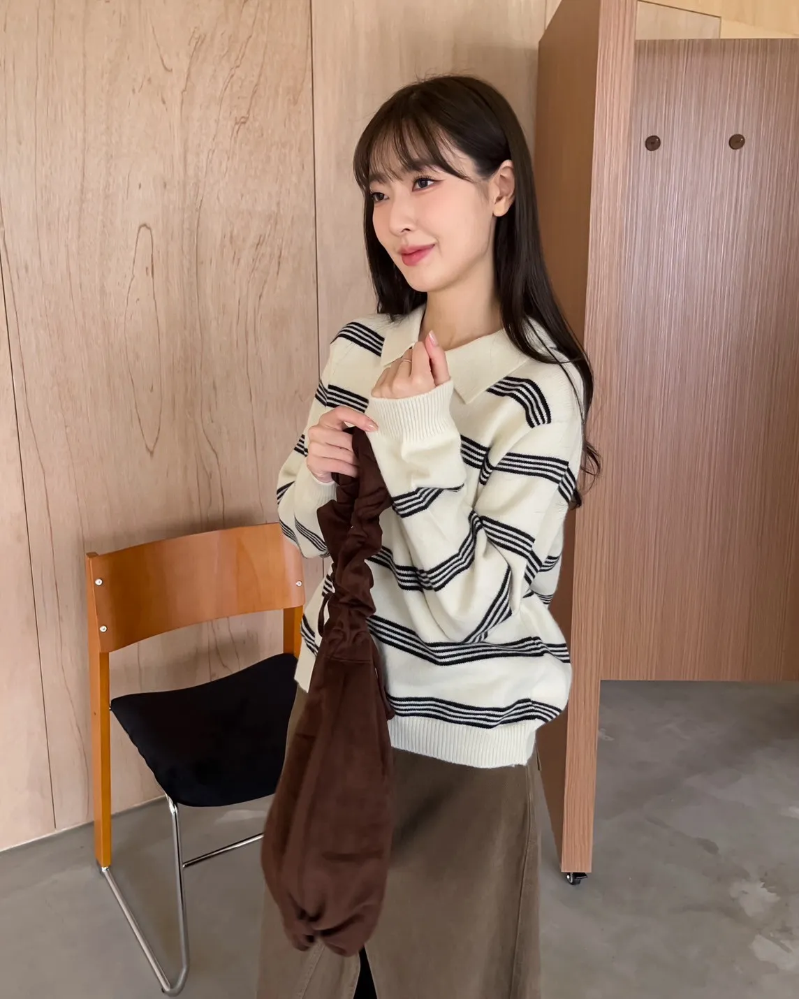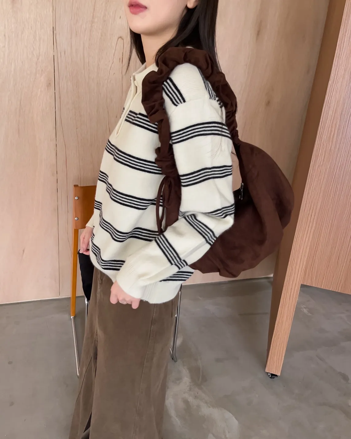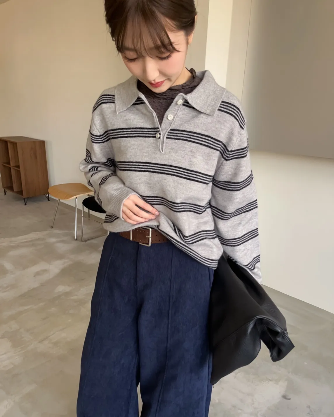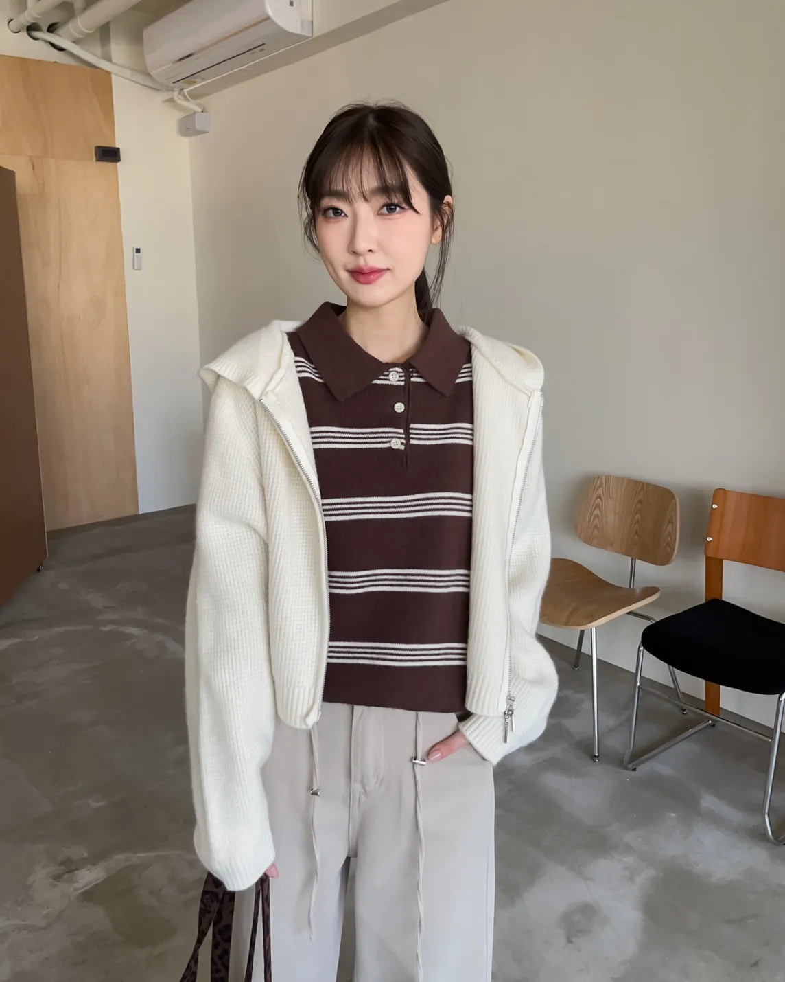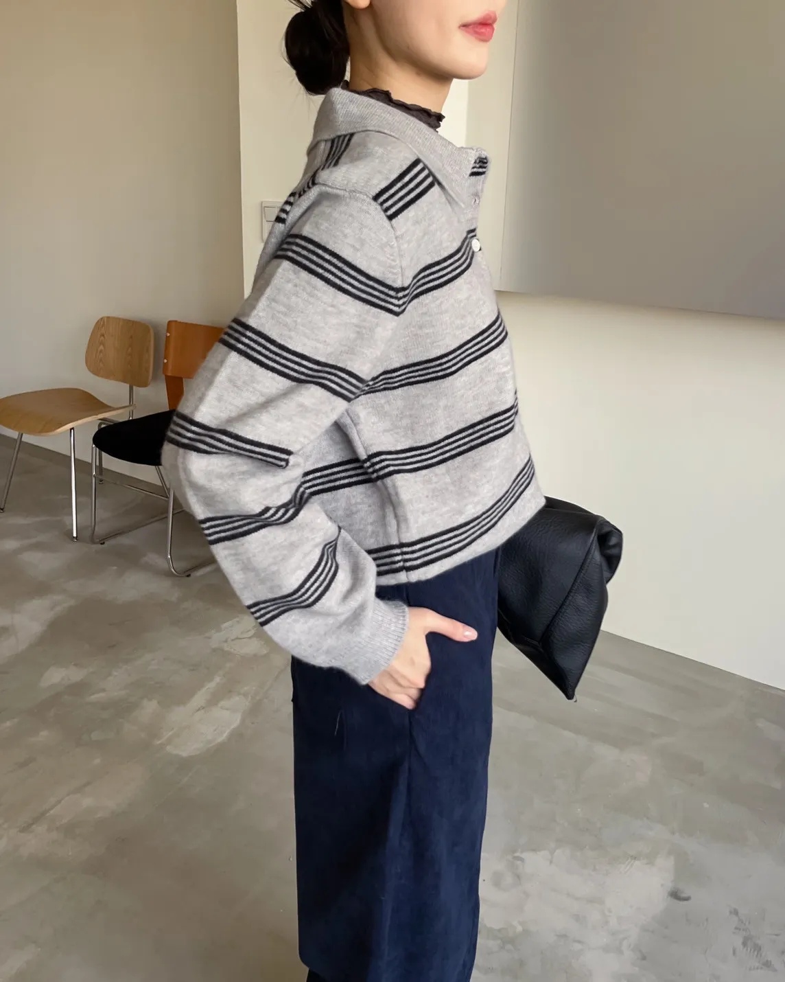 V0086小鈕扣POLO領橫紋毛衣(米/咖啡/灰)