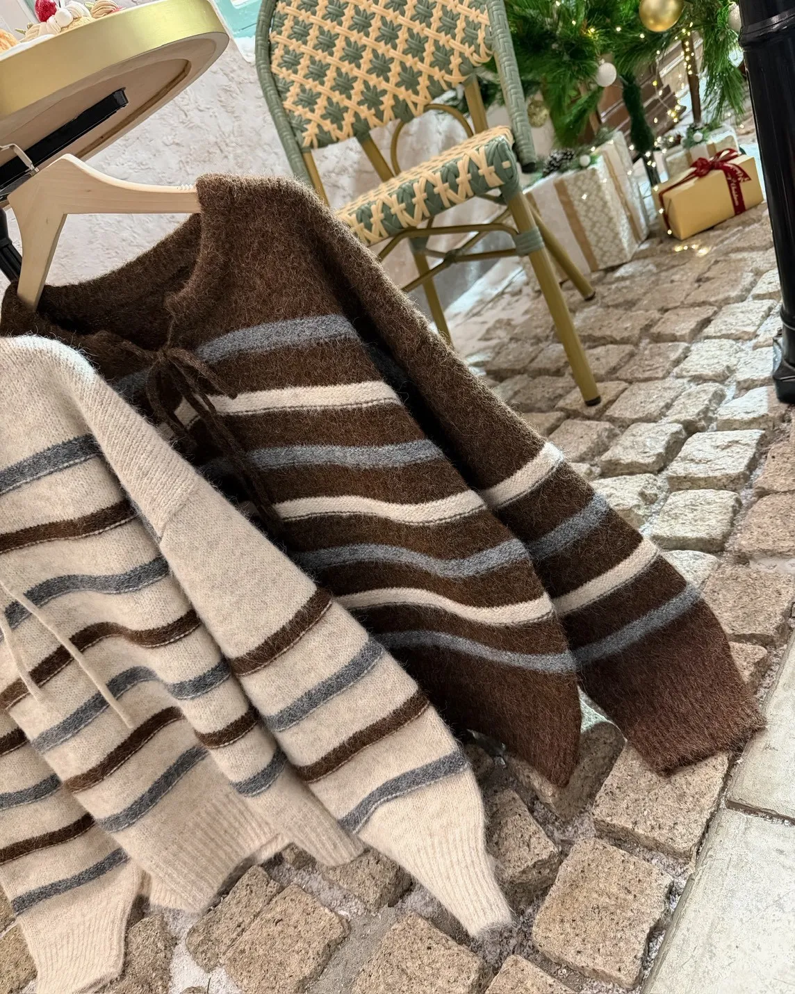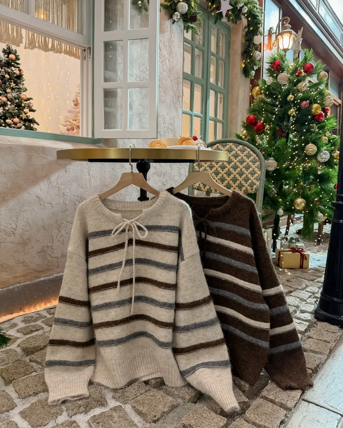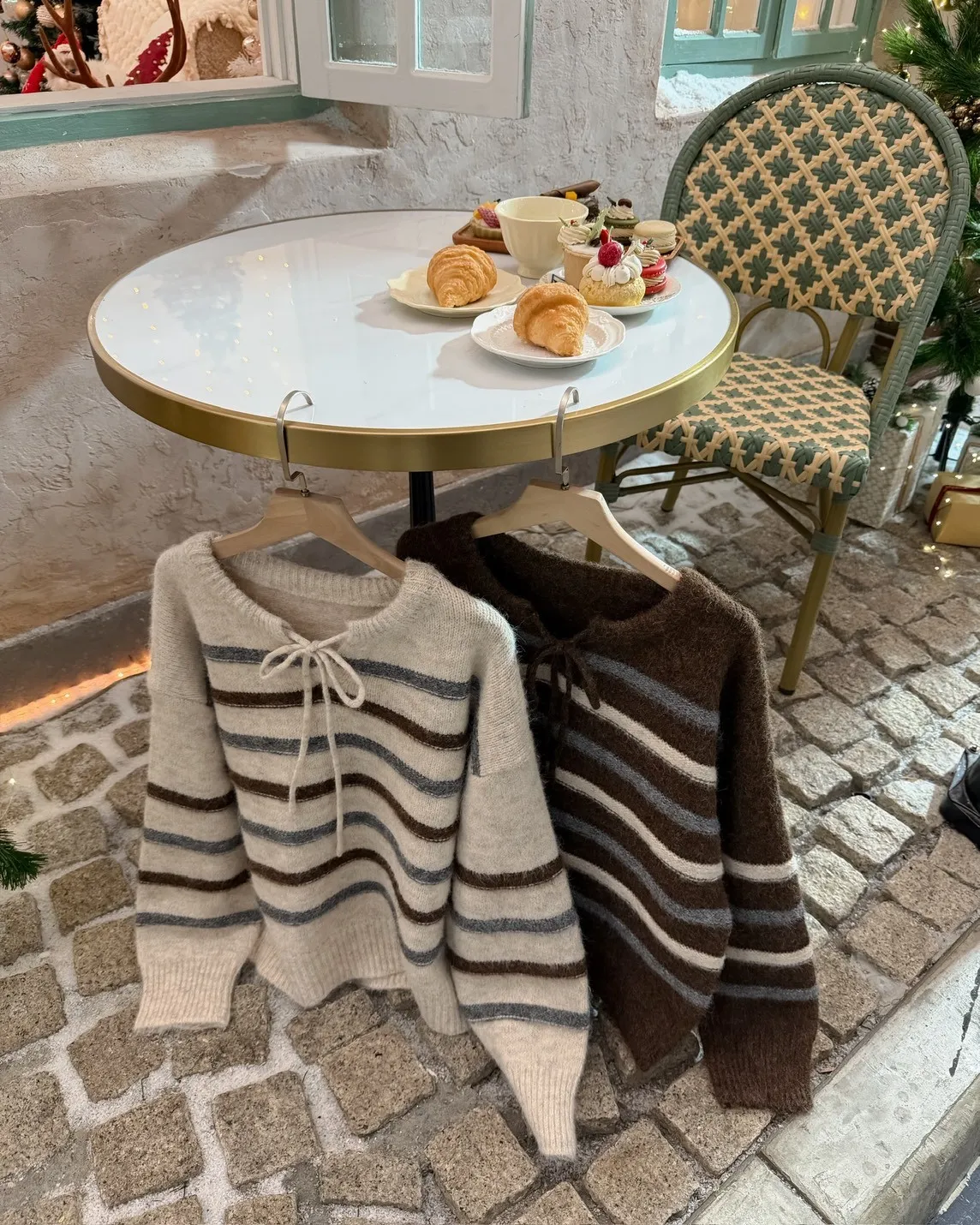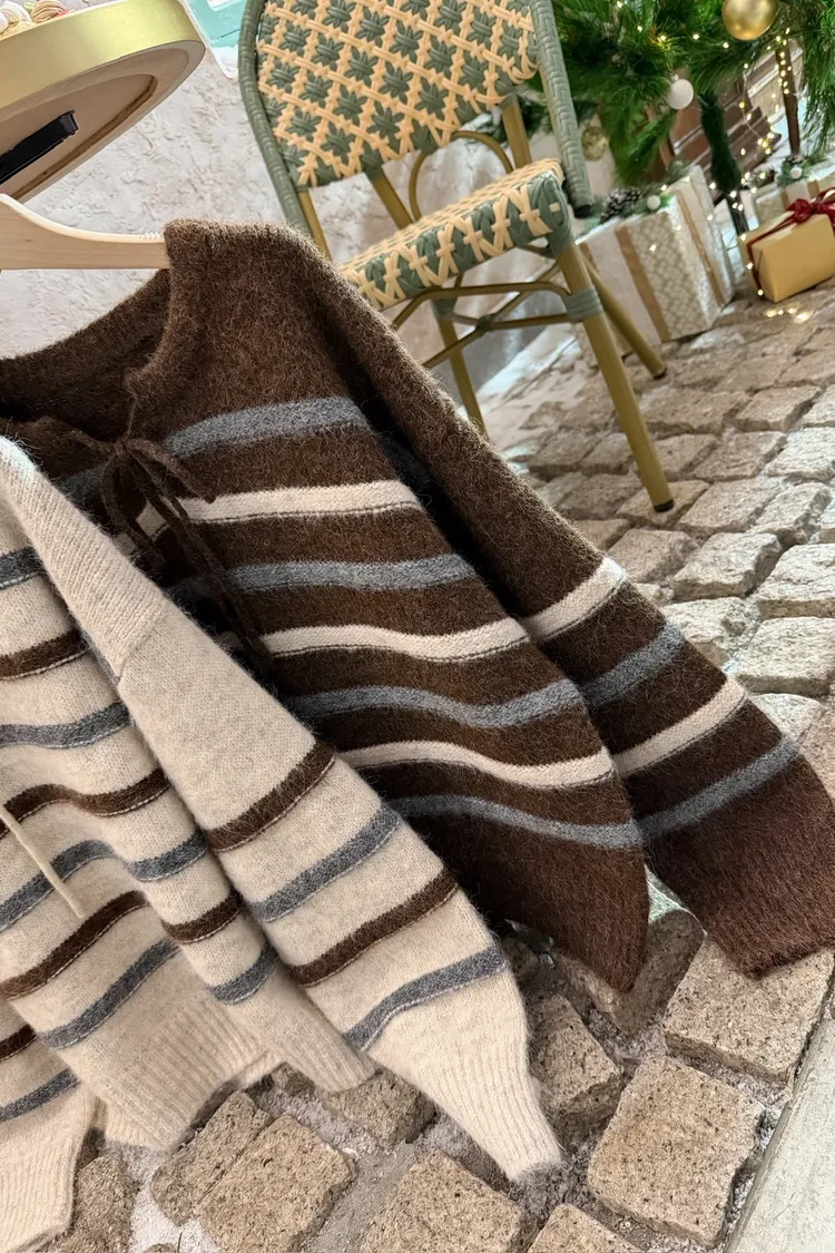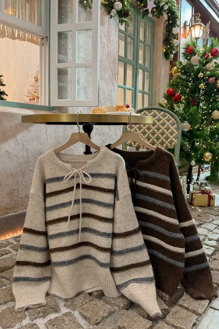 X0060巧克力夾心條紋綁帶毛衣(杏/咖啡)