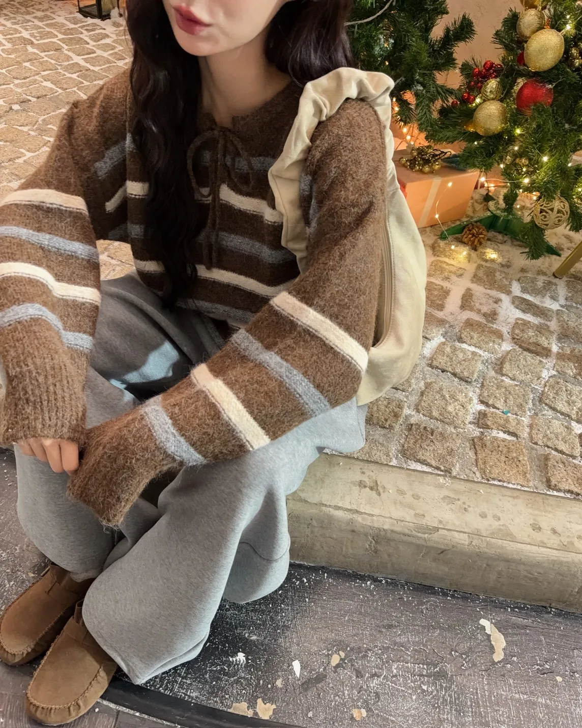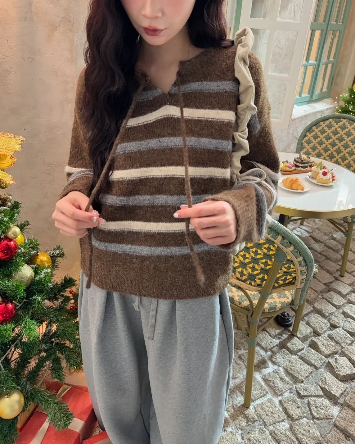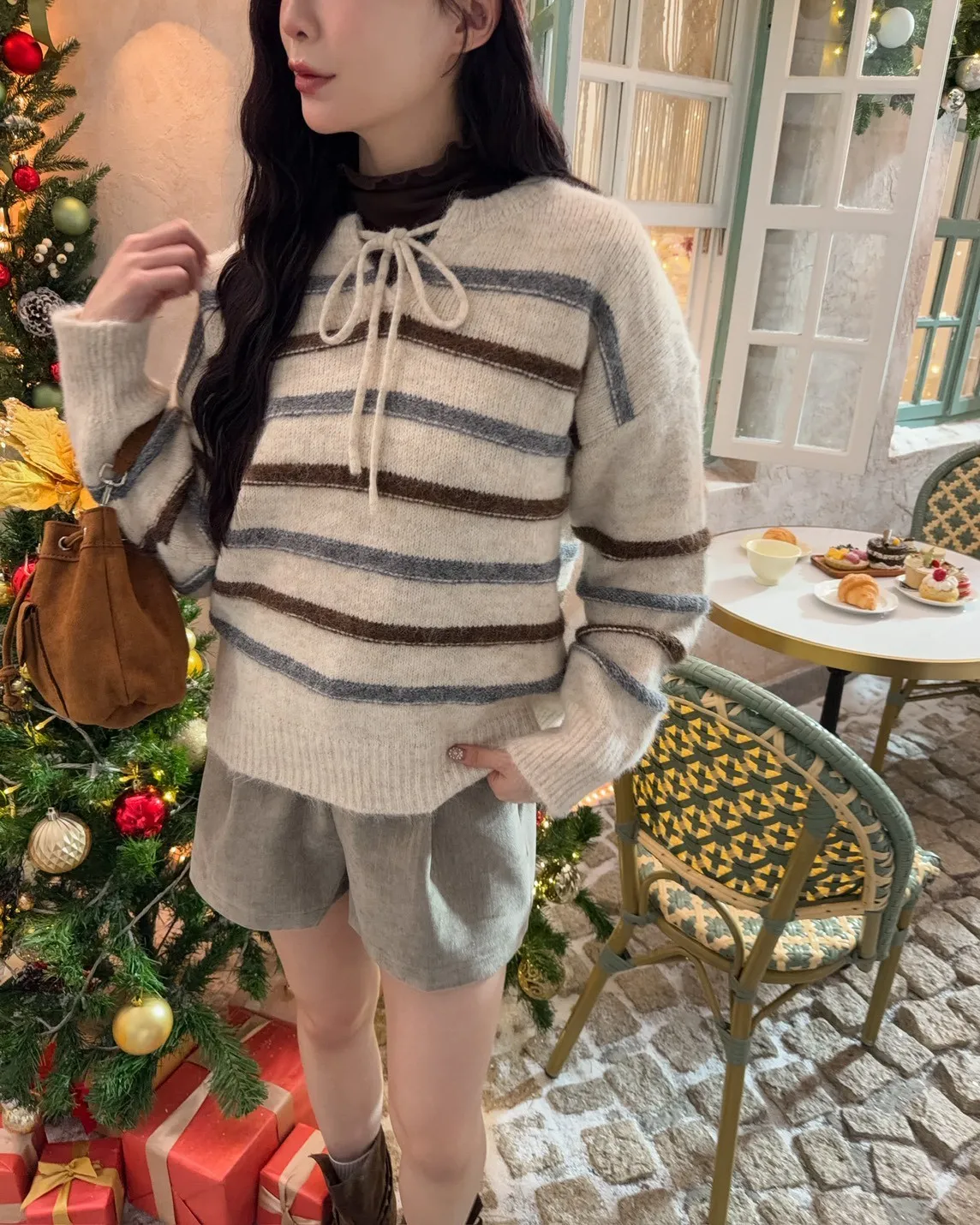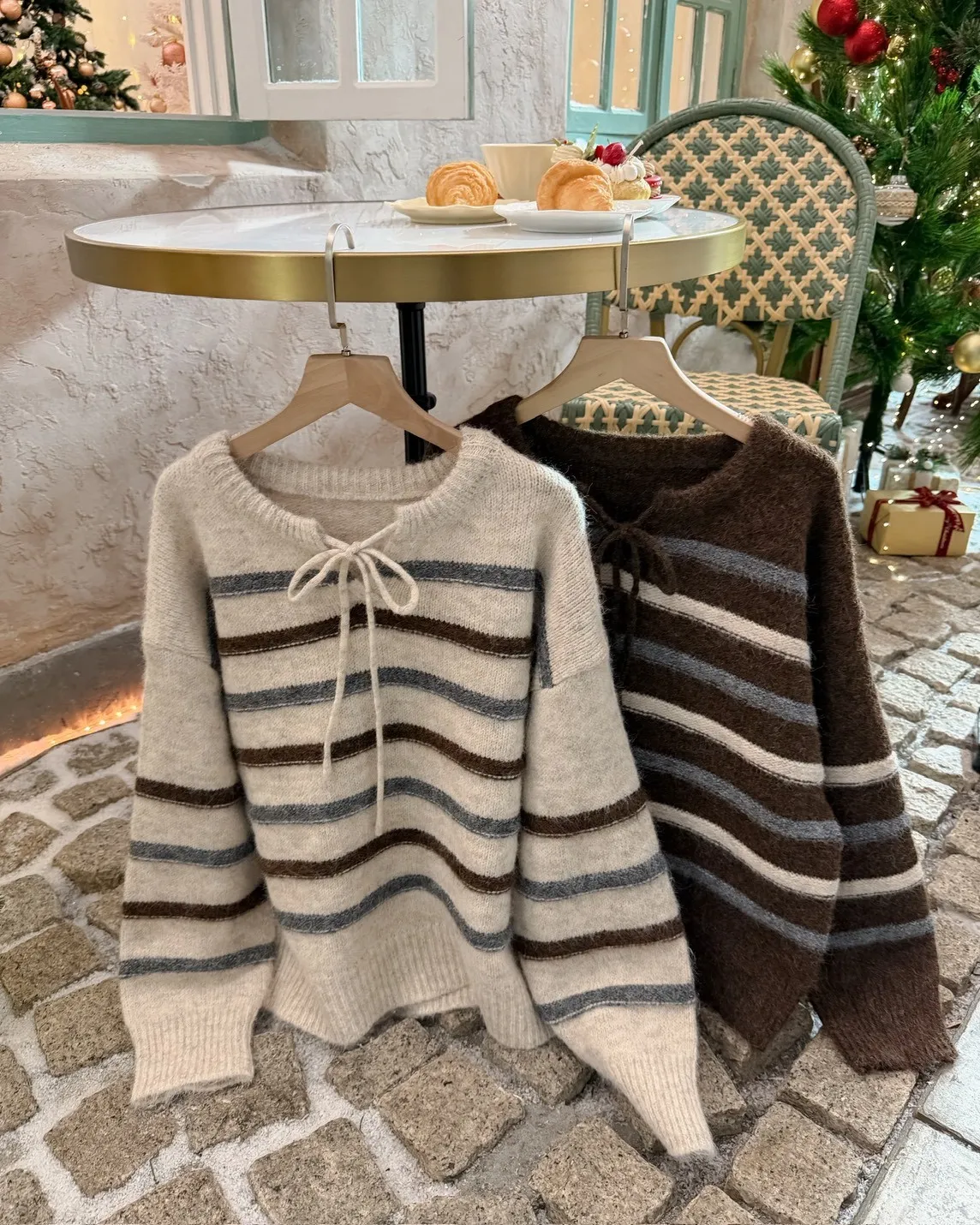 X0060巧克力夾心條紋綁帶毛衣(杏/咖啡)