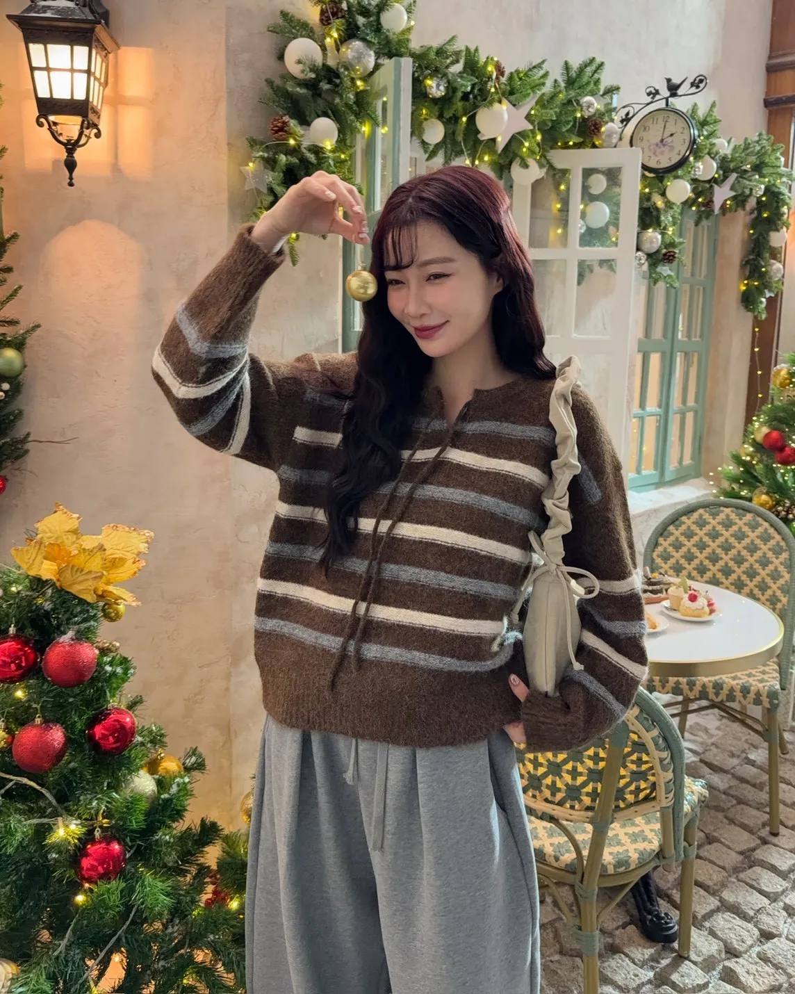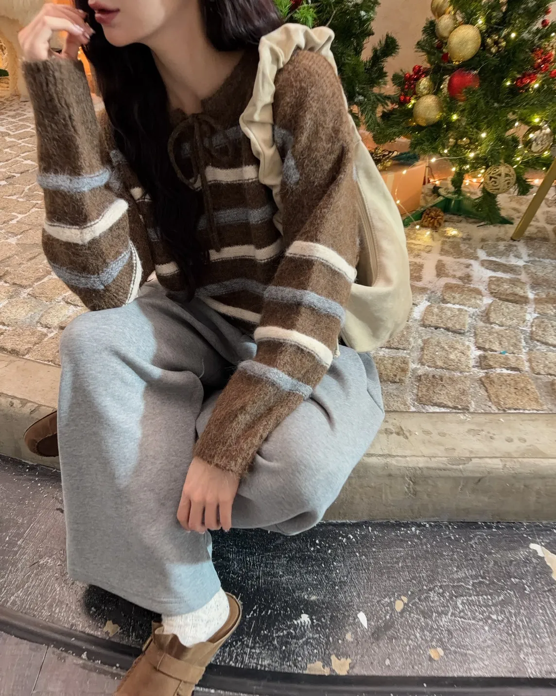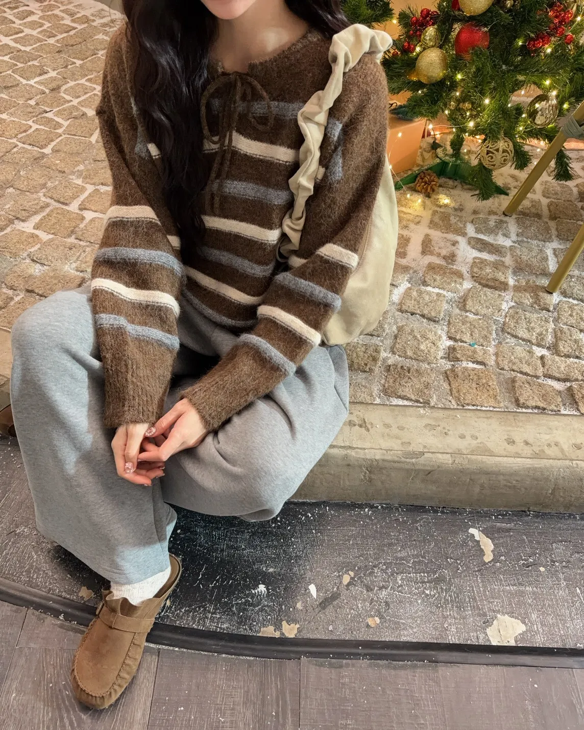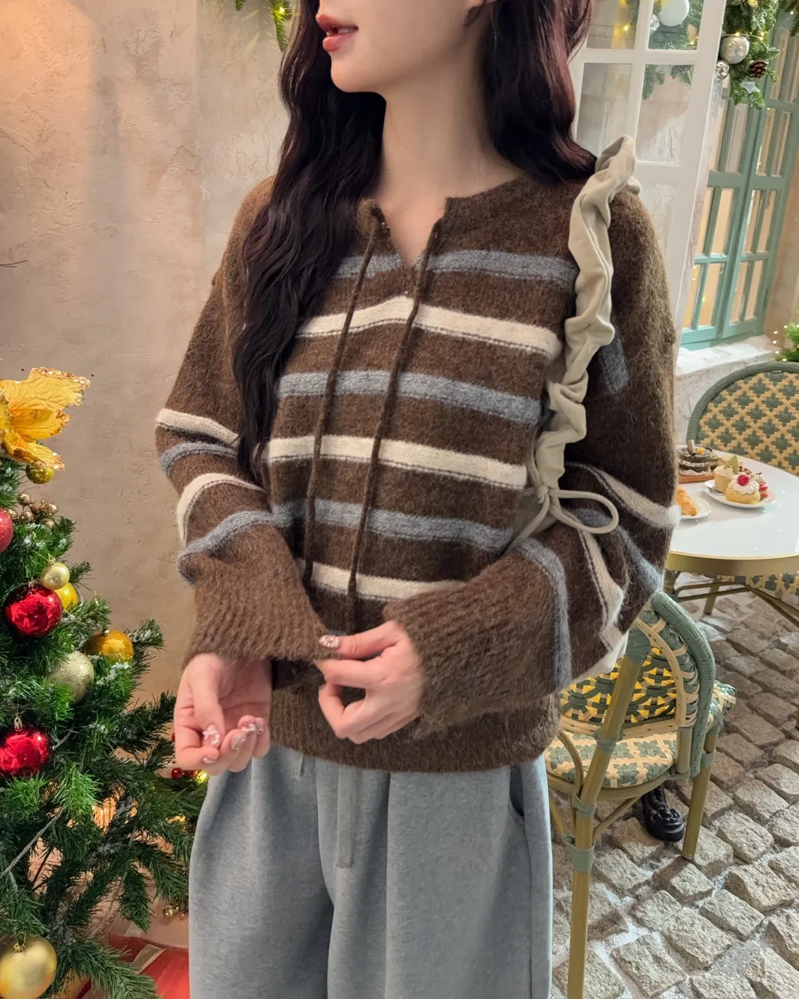 X0060巧克力夾心條紋綁帶毛衣(杏/咖啡)