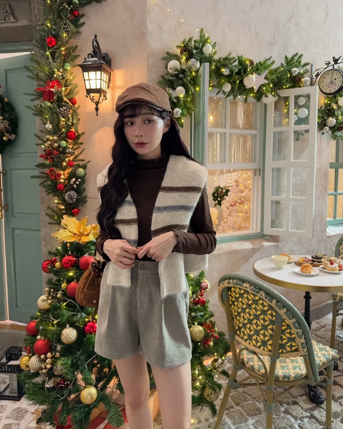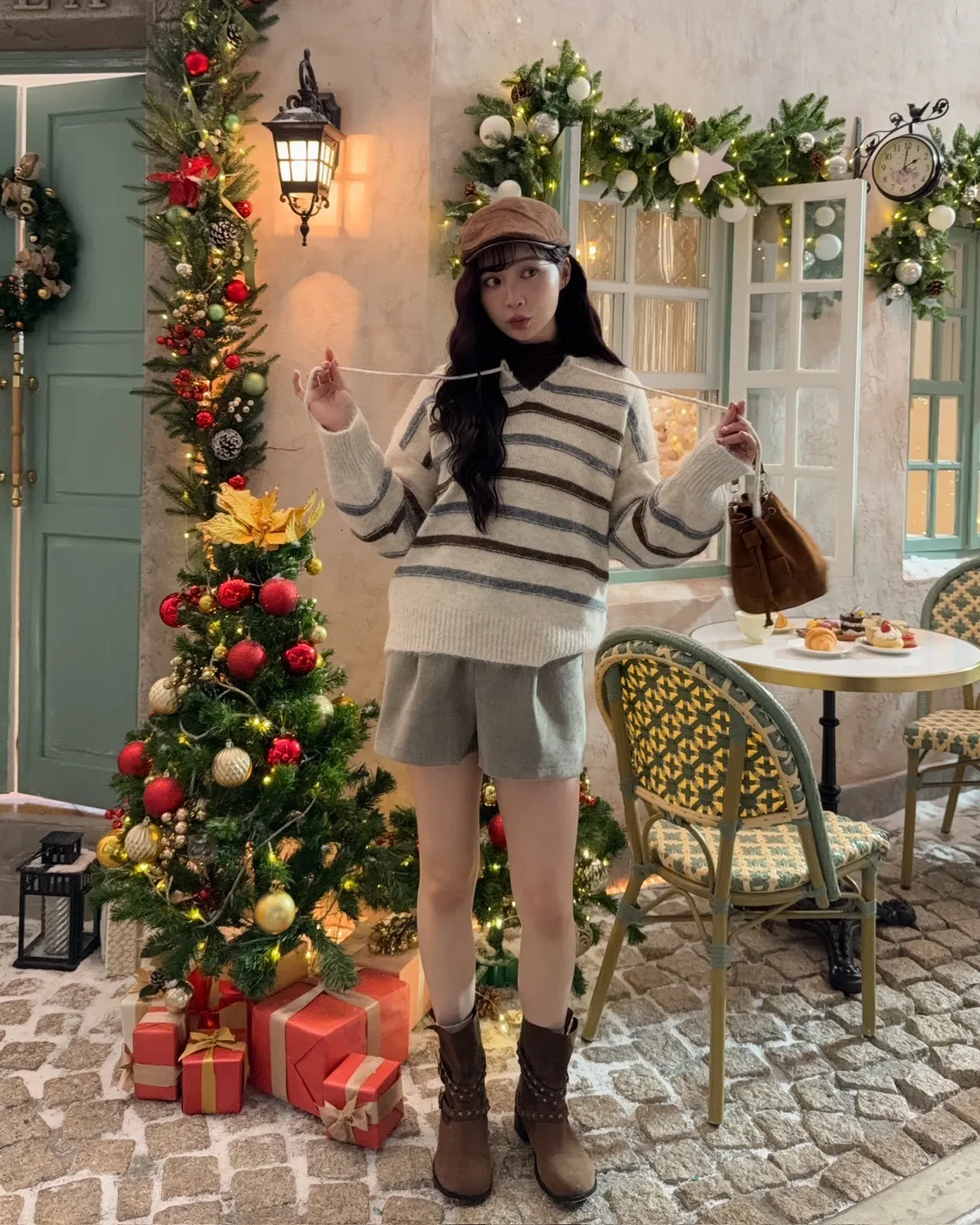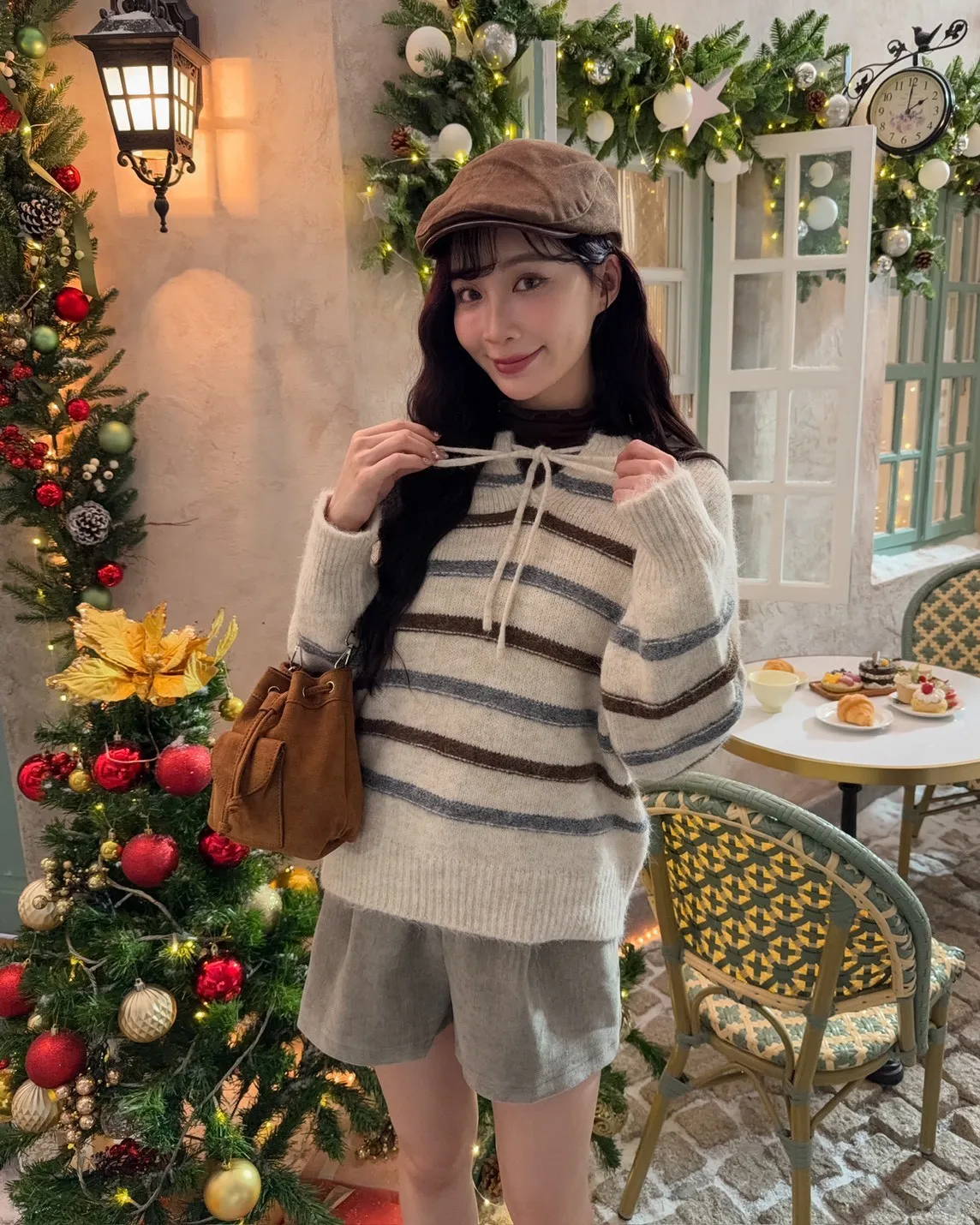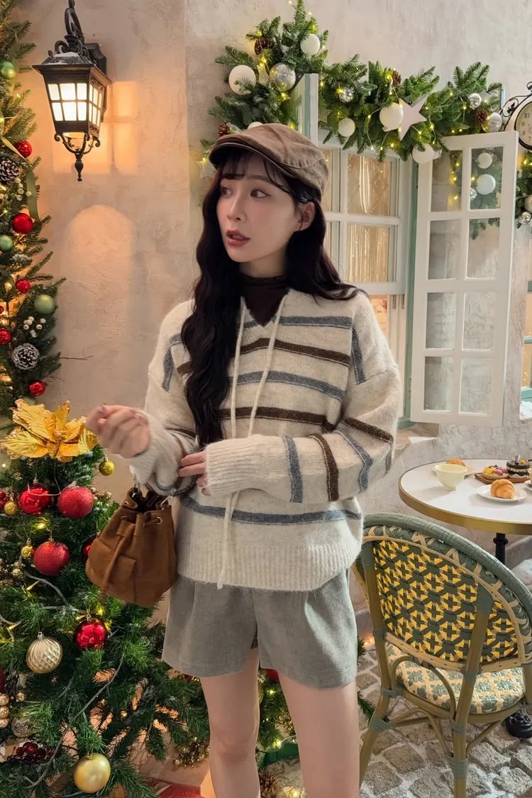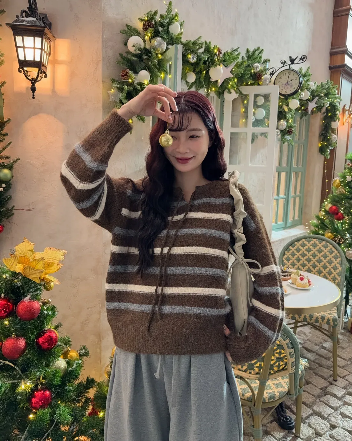 X0060巧克力夾心條紋綁帶毛衣(杏/咖啡)