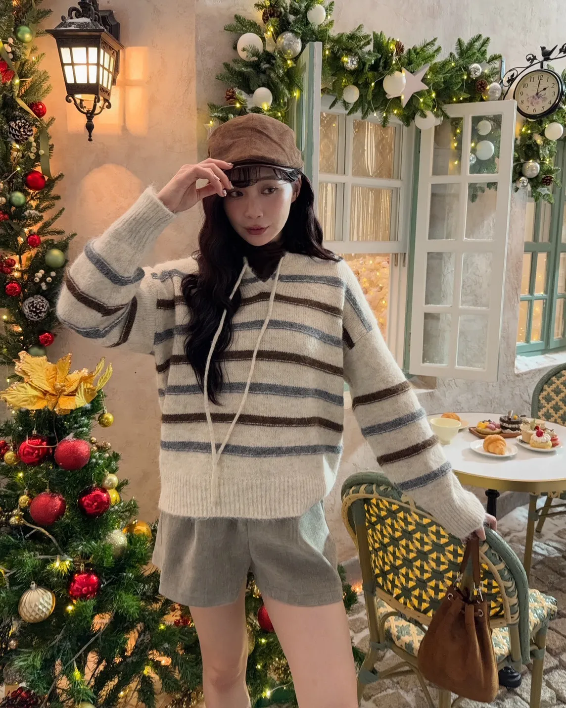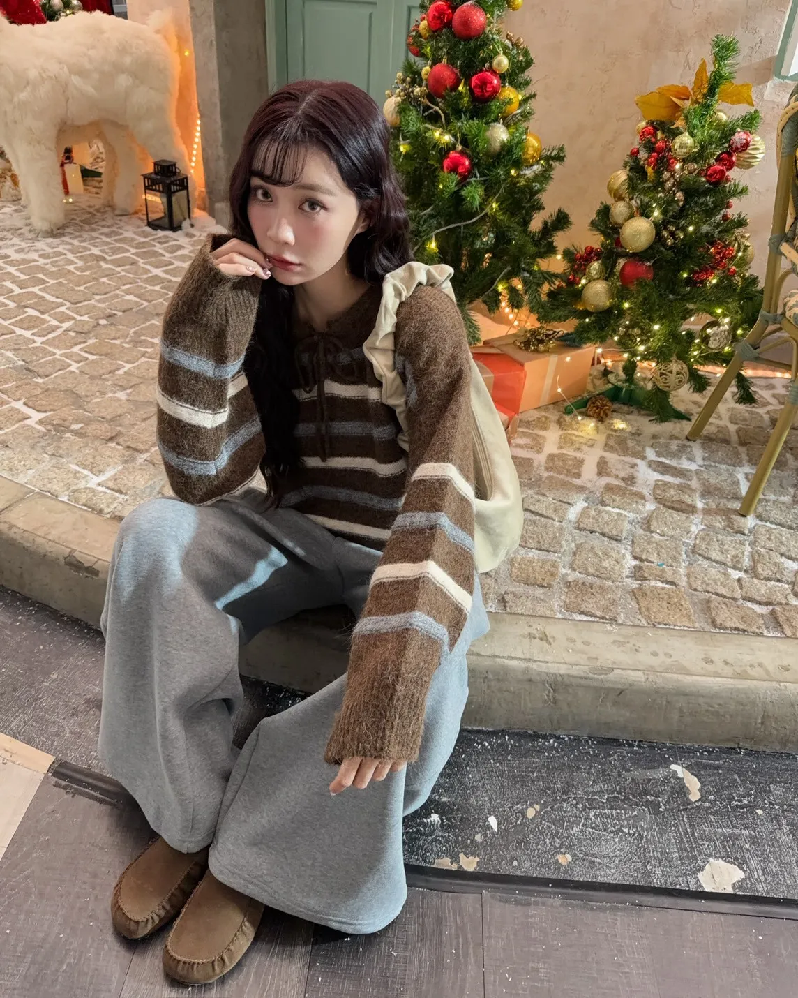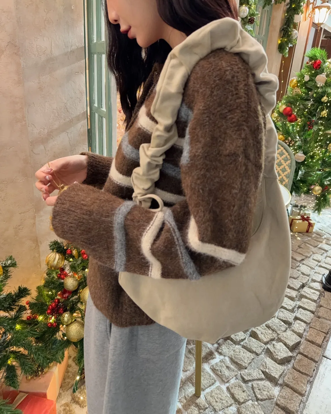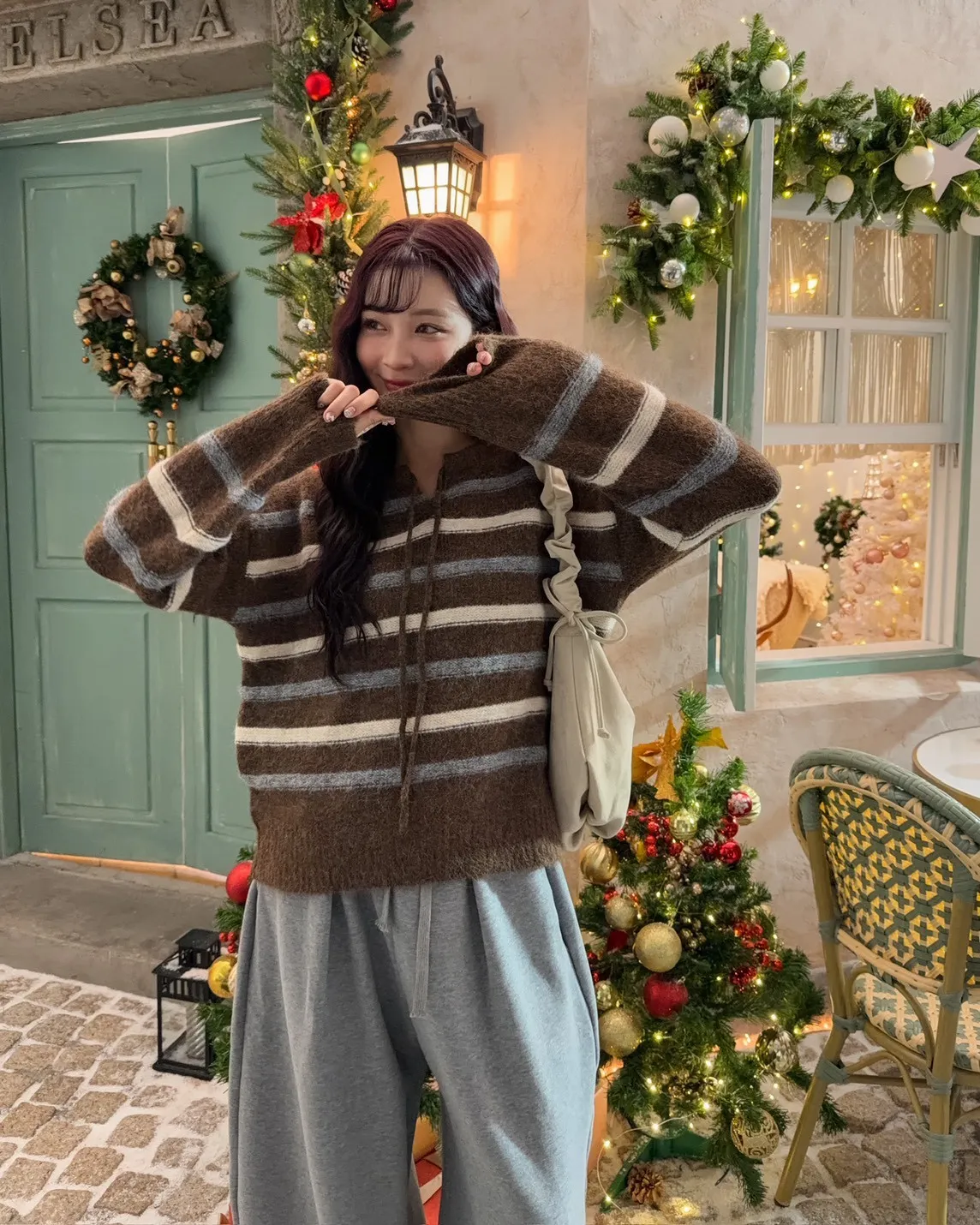 領口綁帶 可愛寬袖 杏/咖啡/藍配色 立體條紋 混毛針織