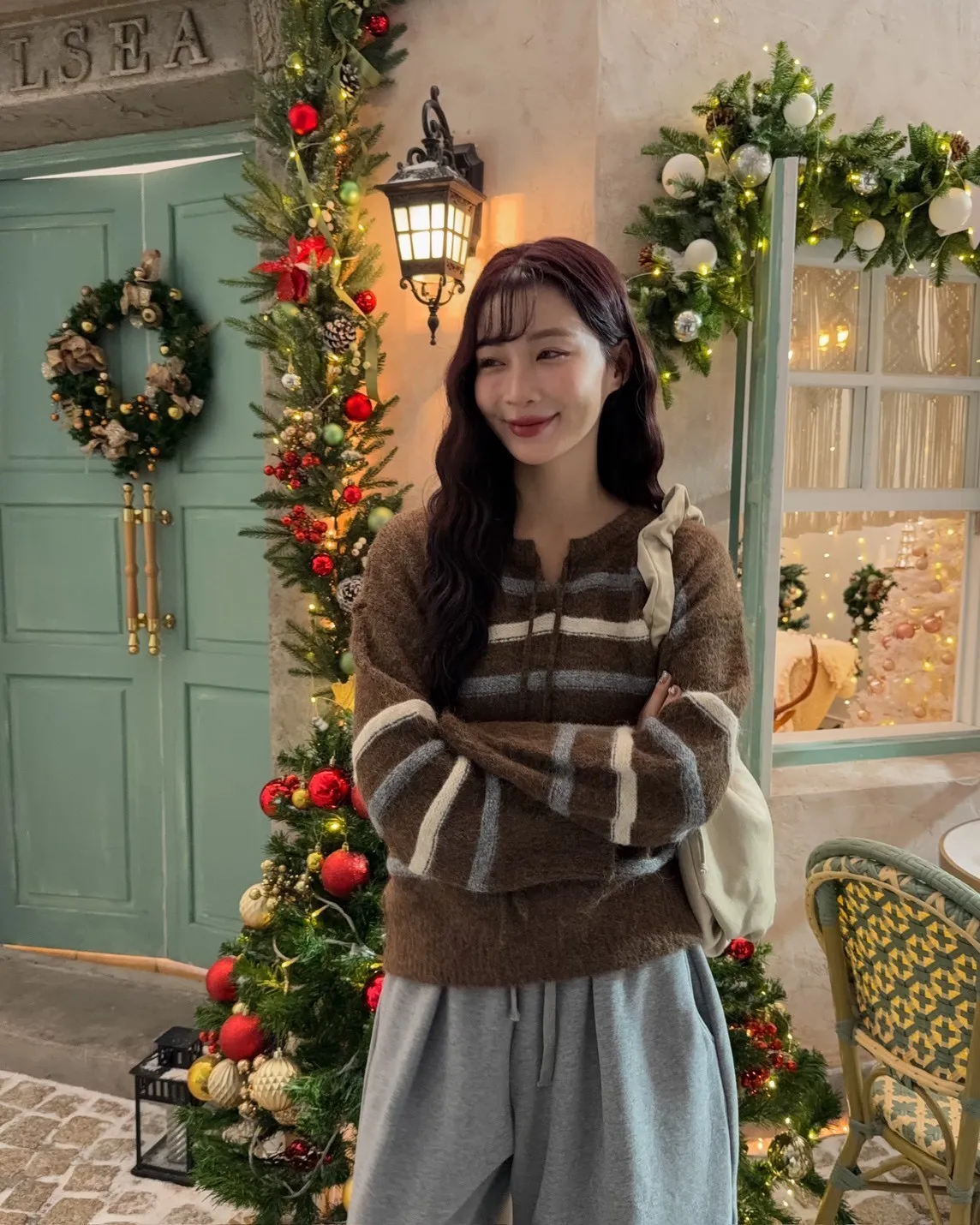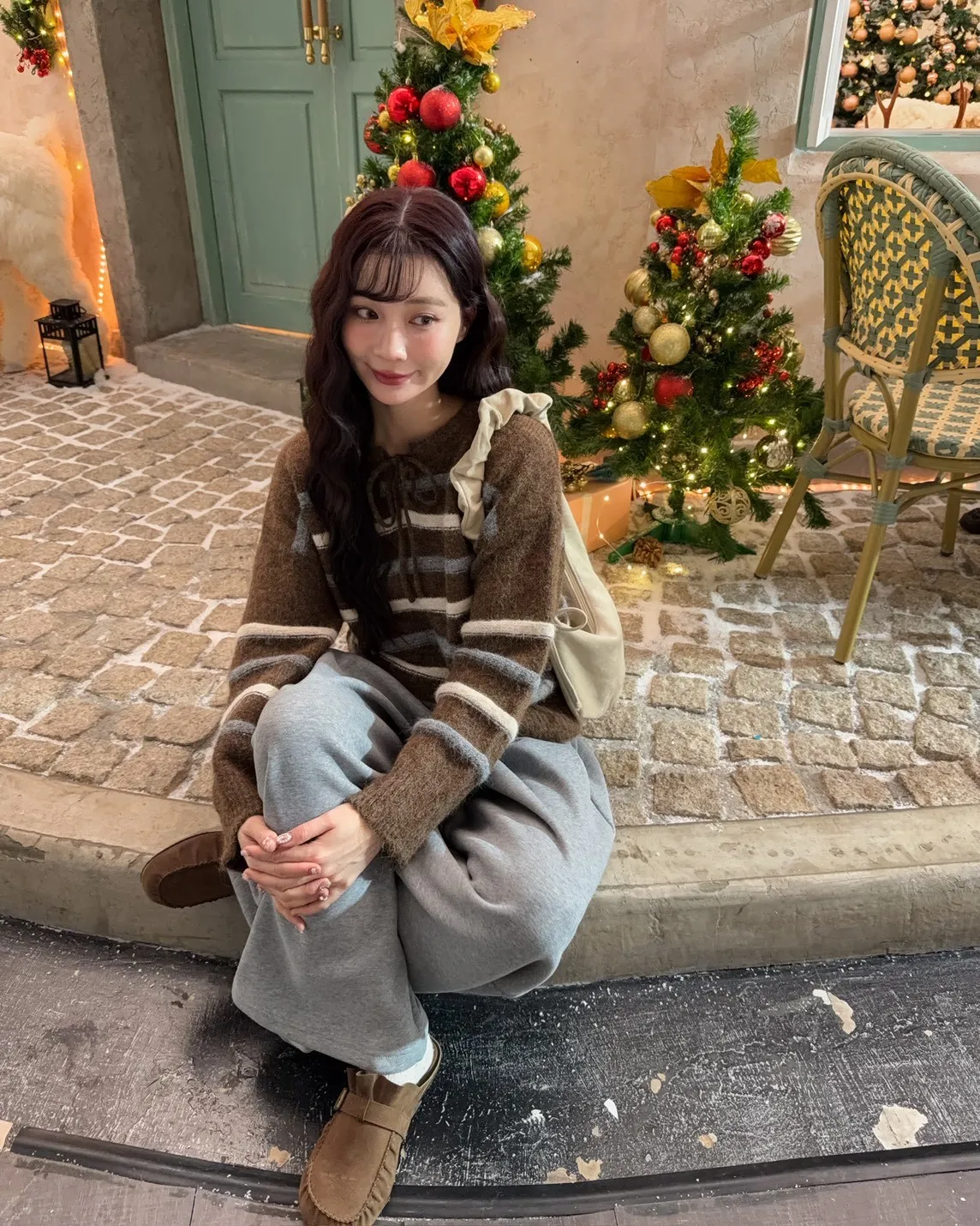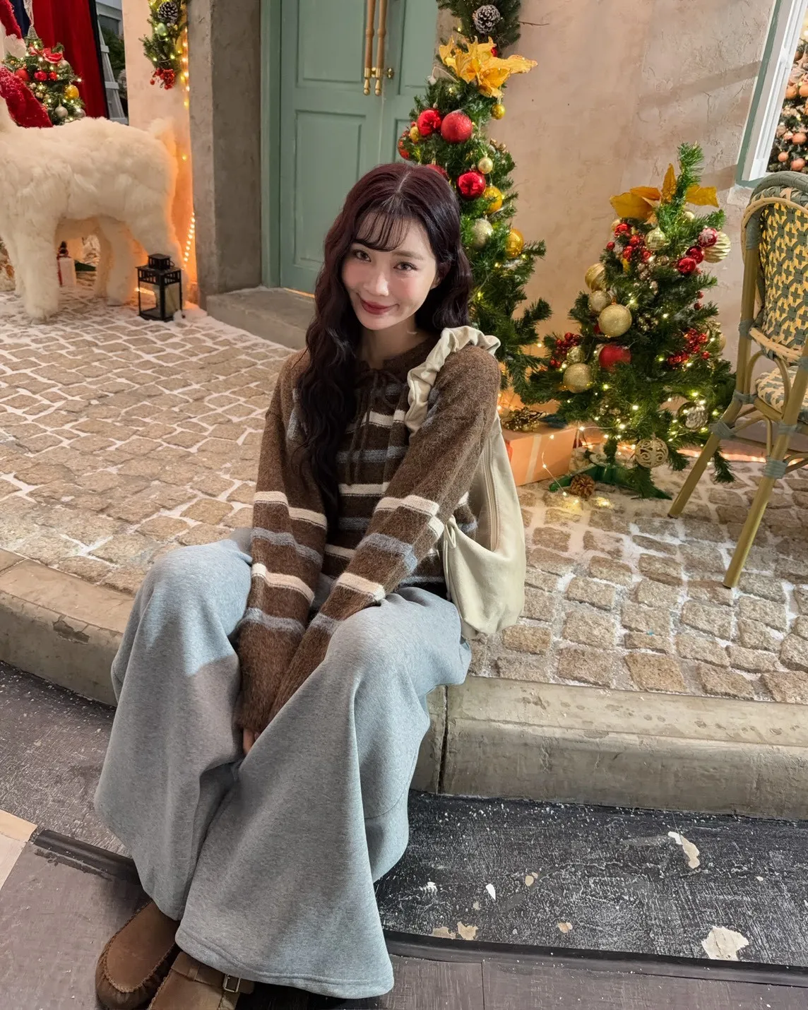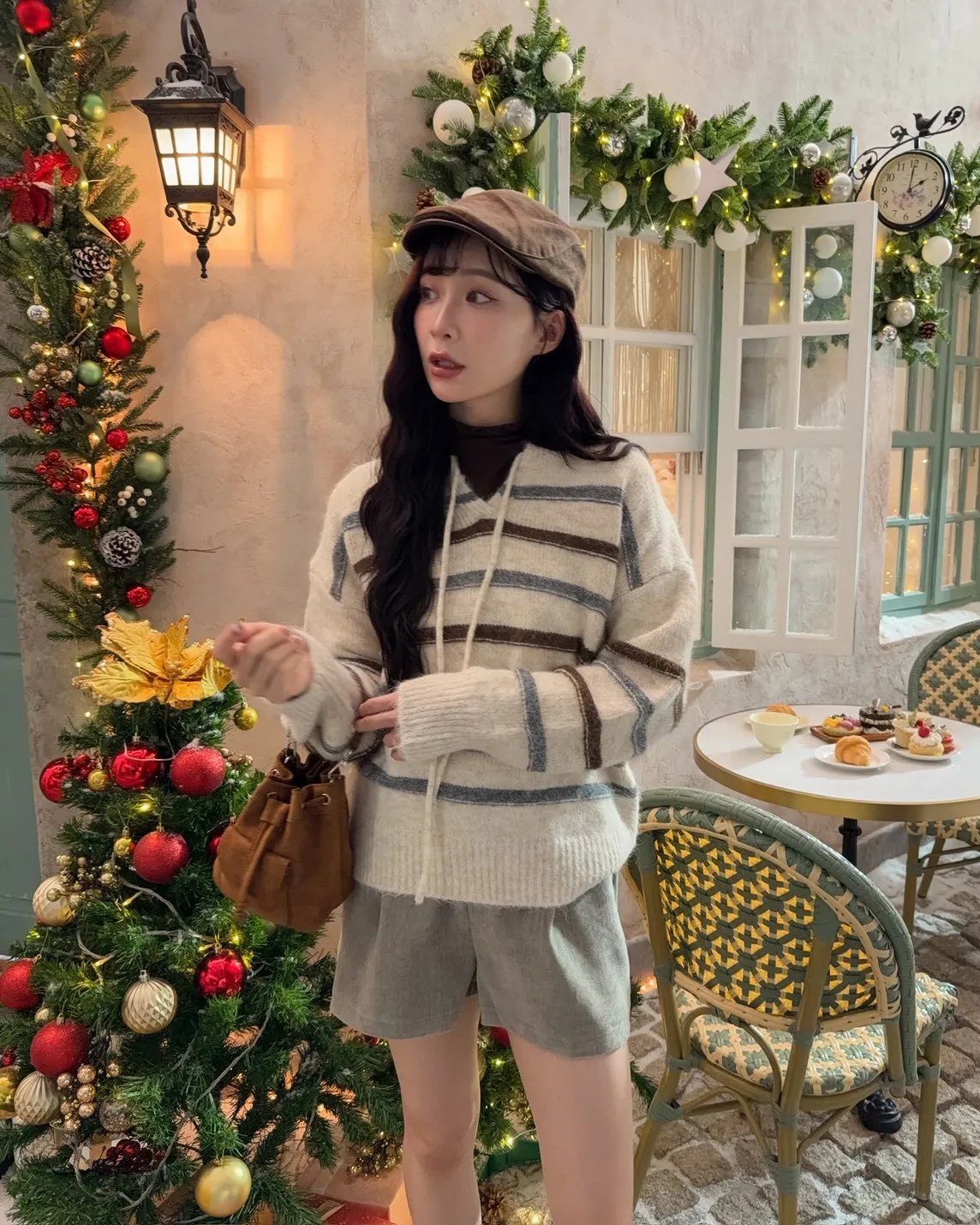領口綁帶 可愛寬袖 杏/咖啡/藍配色 立體條紋 混毛針織