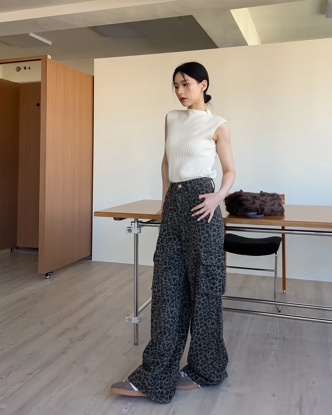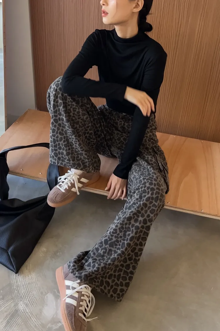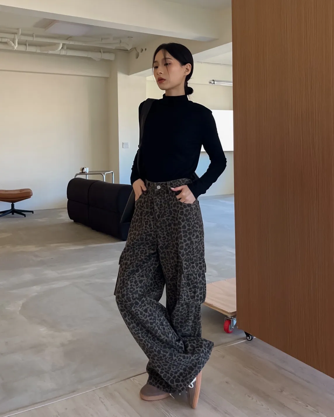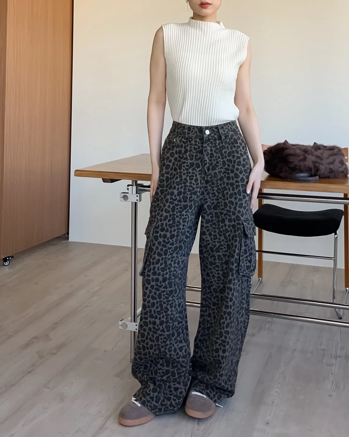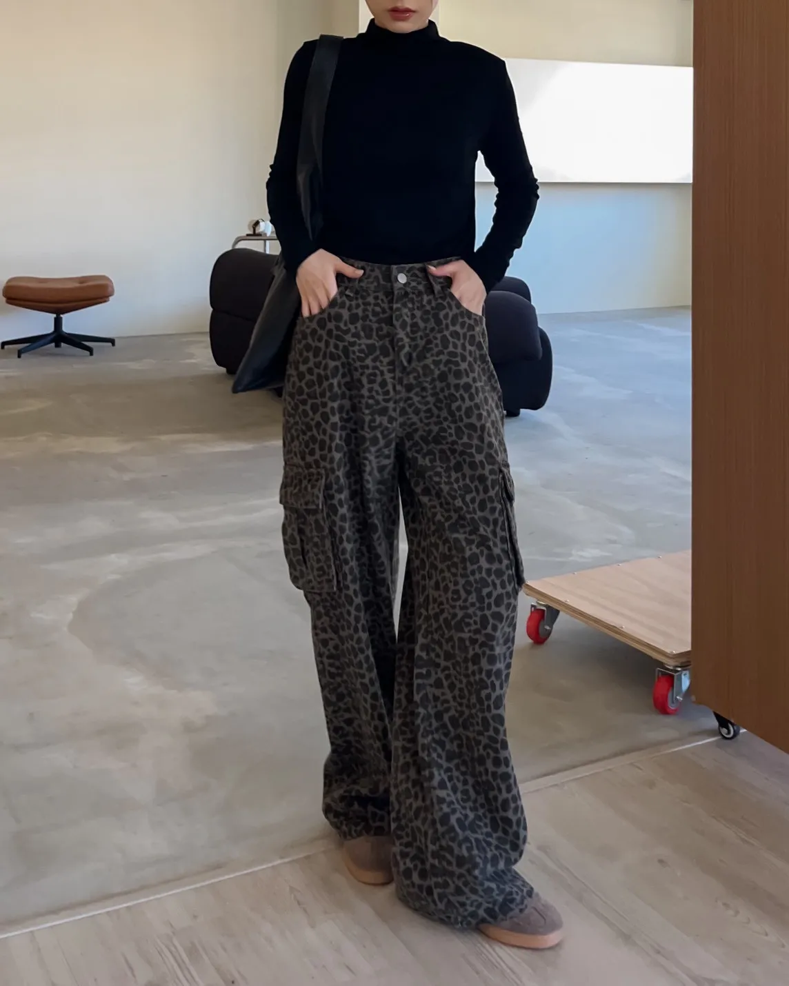 W0029[S-XL]都會野性豹紋工裝寬褲