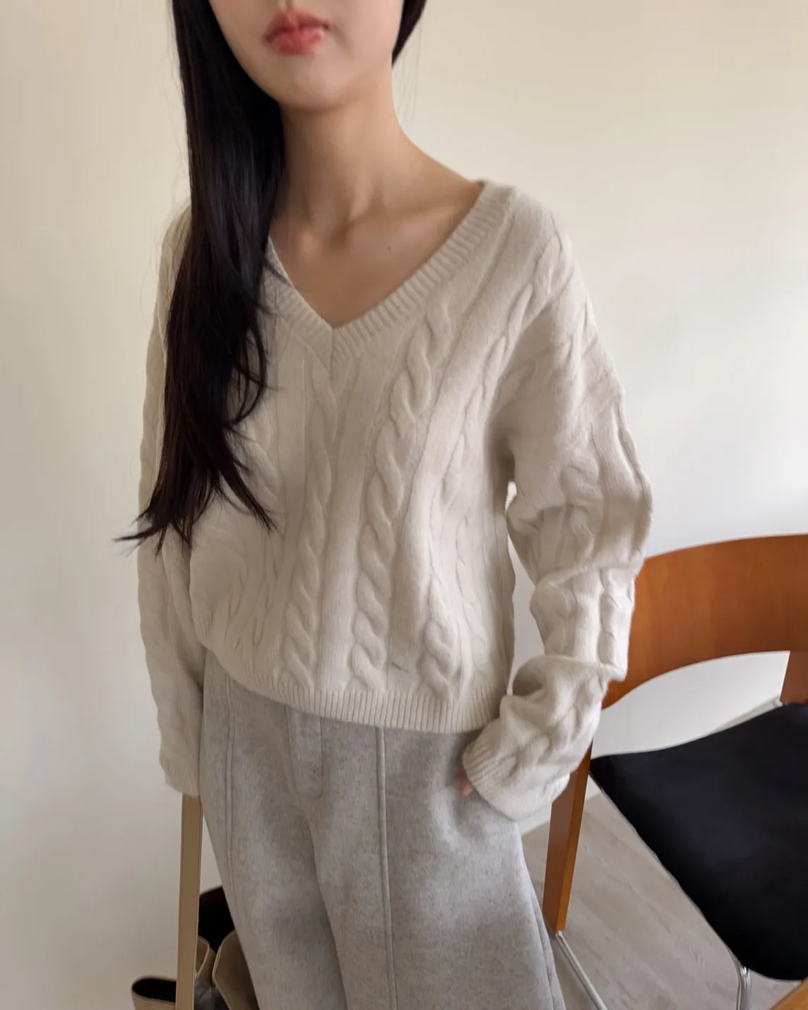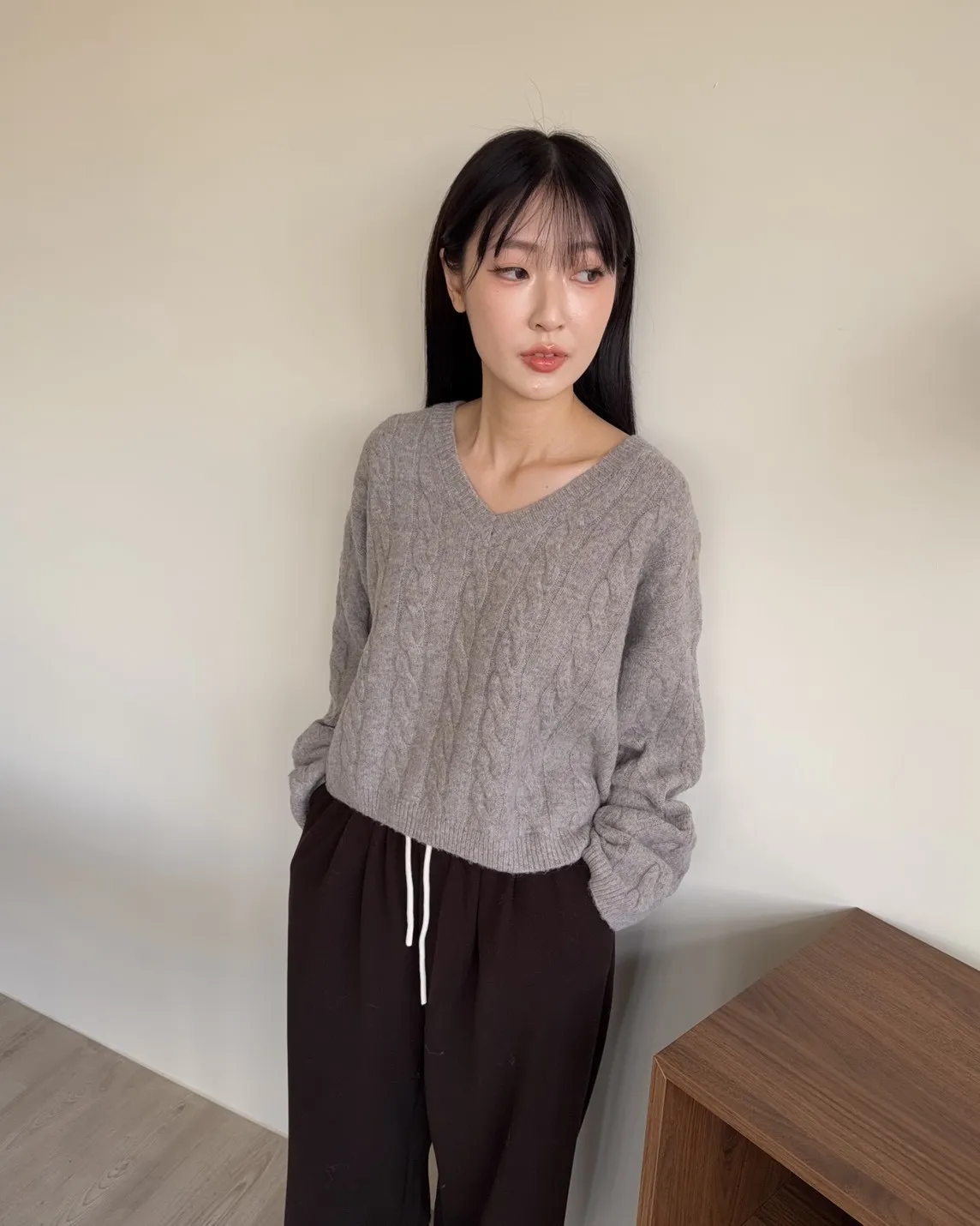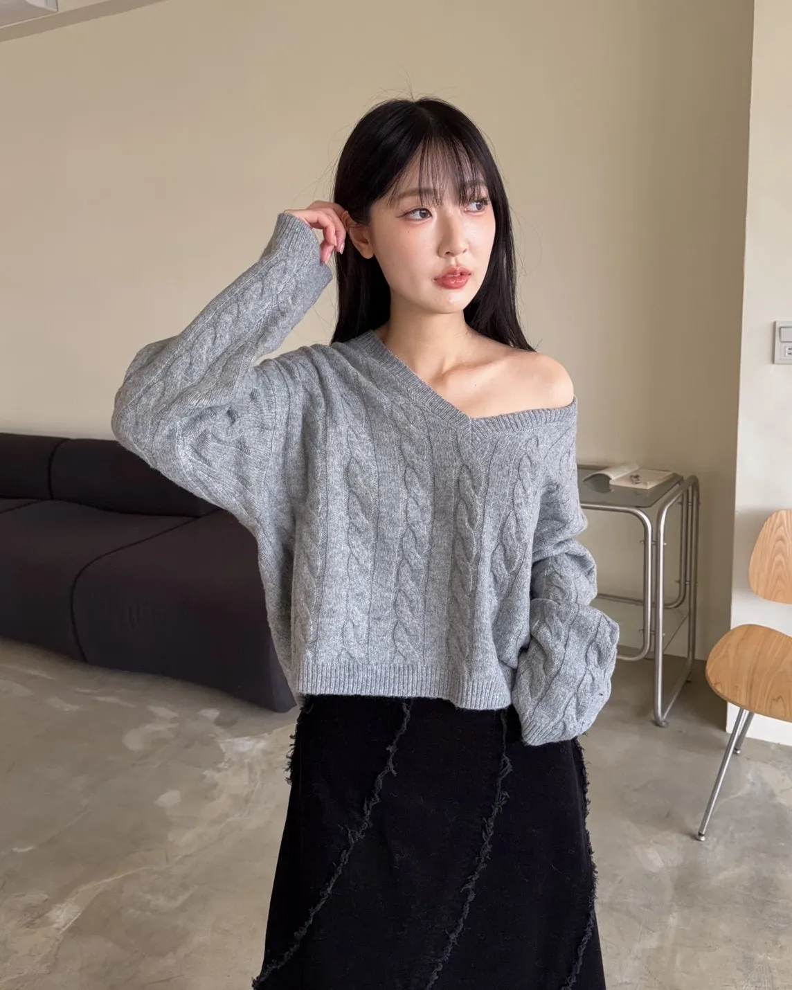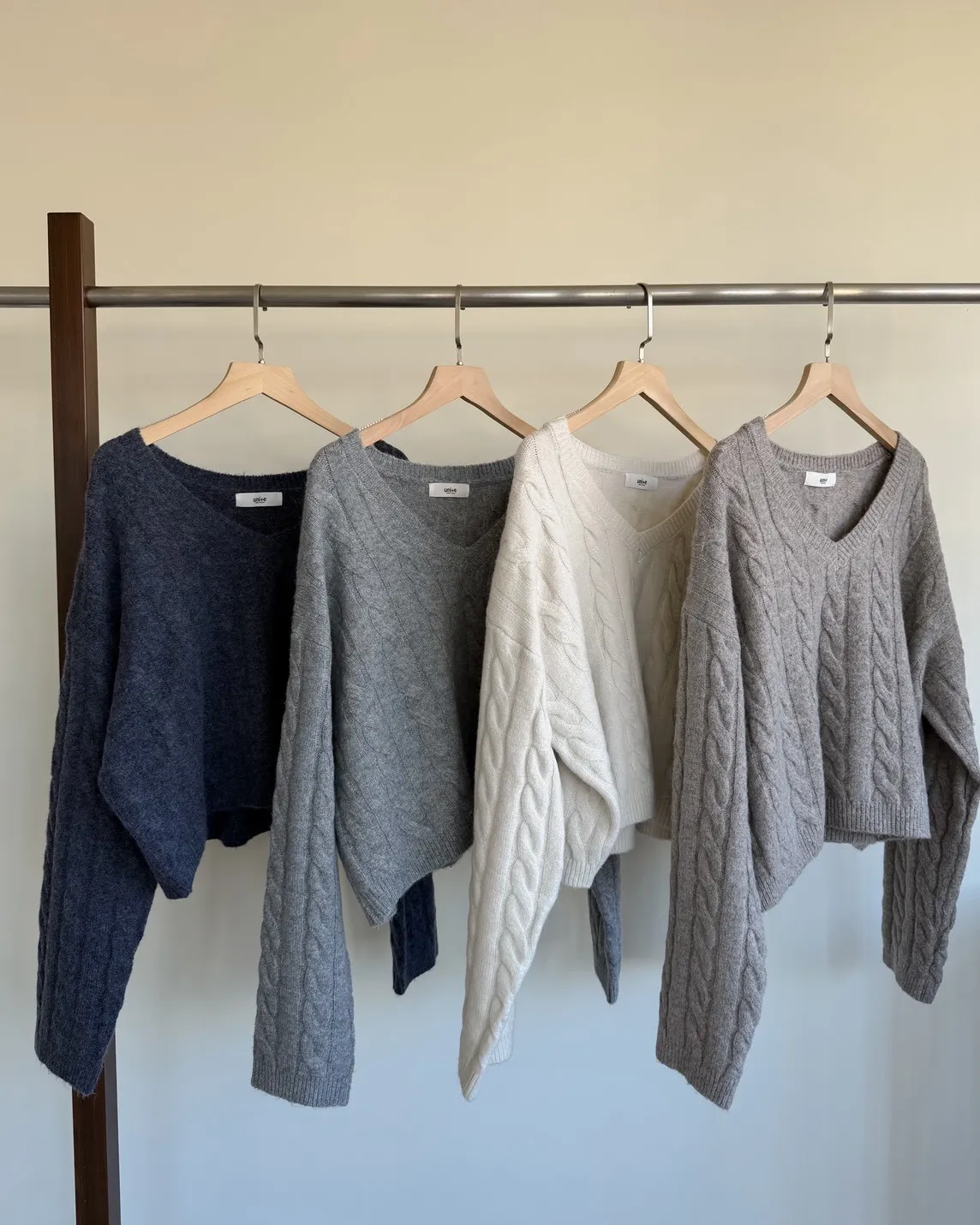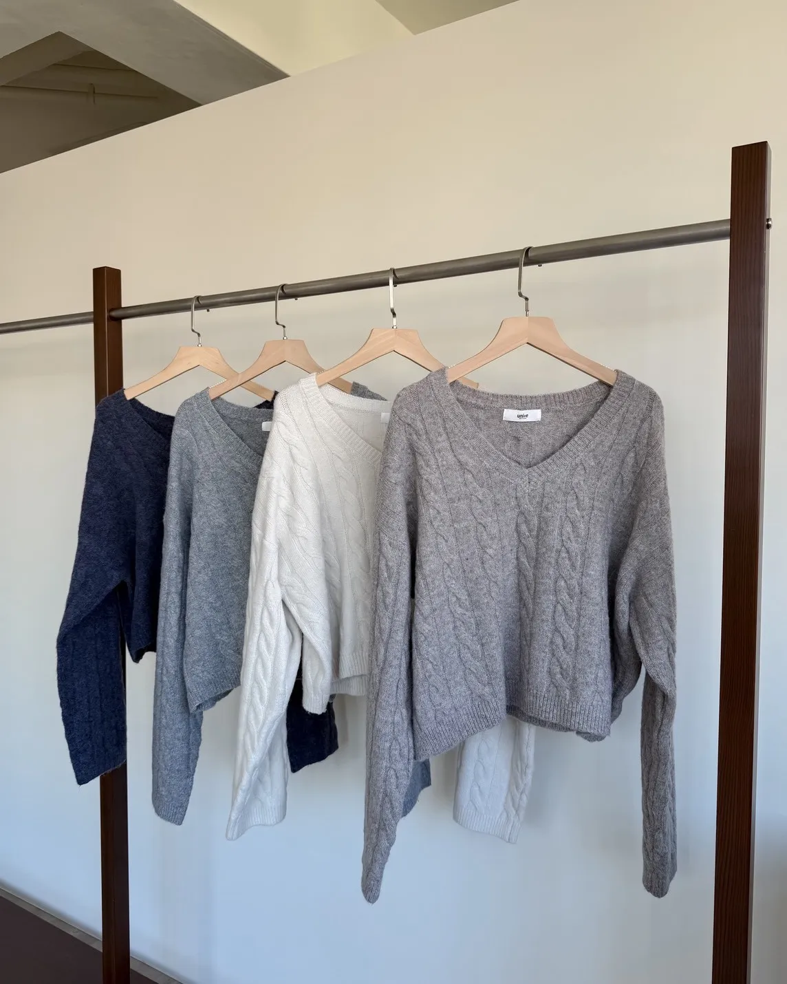 X0034溫柔歐膩V領麻花毛衣(米白/灰紫/灰/深藍)