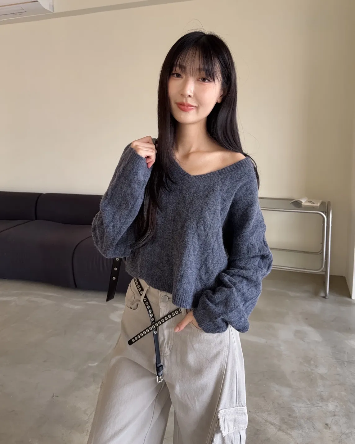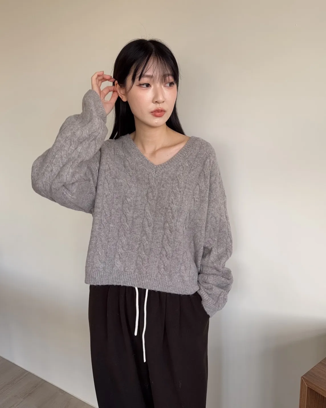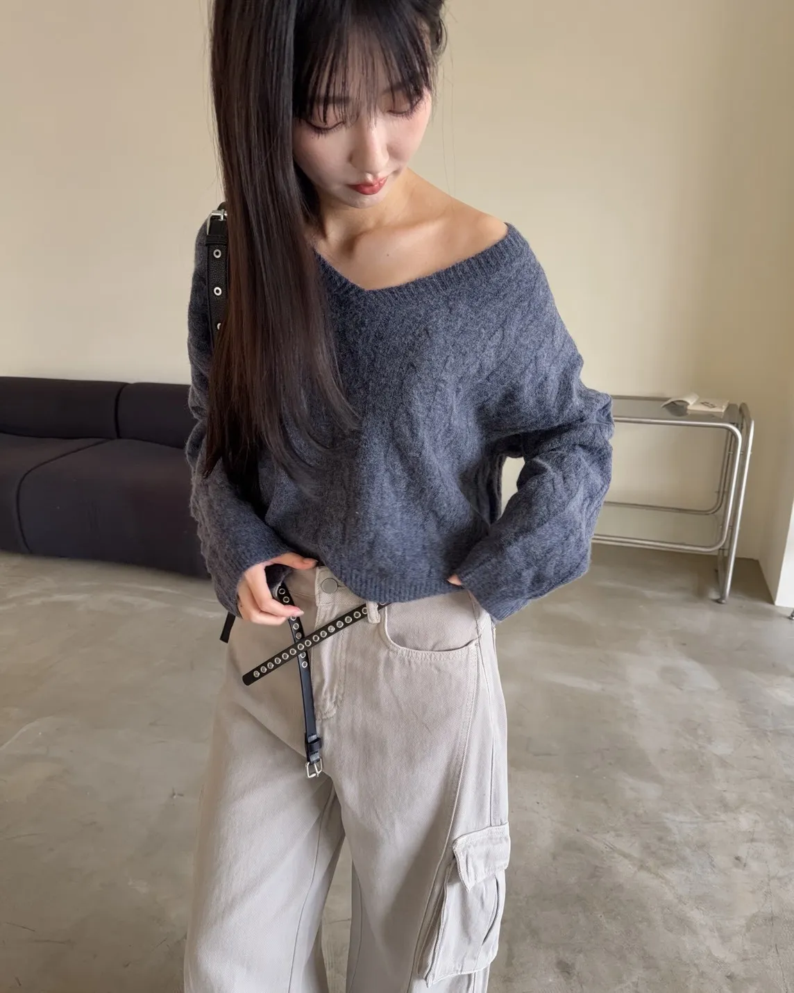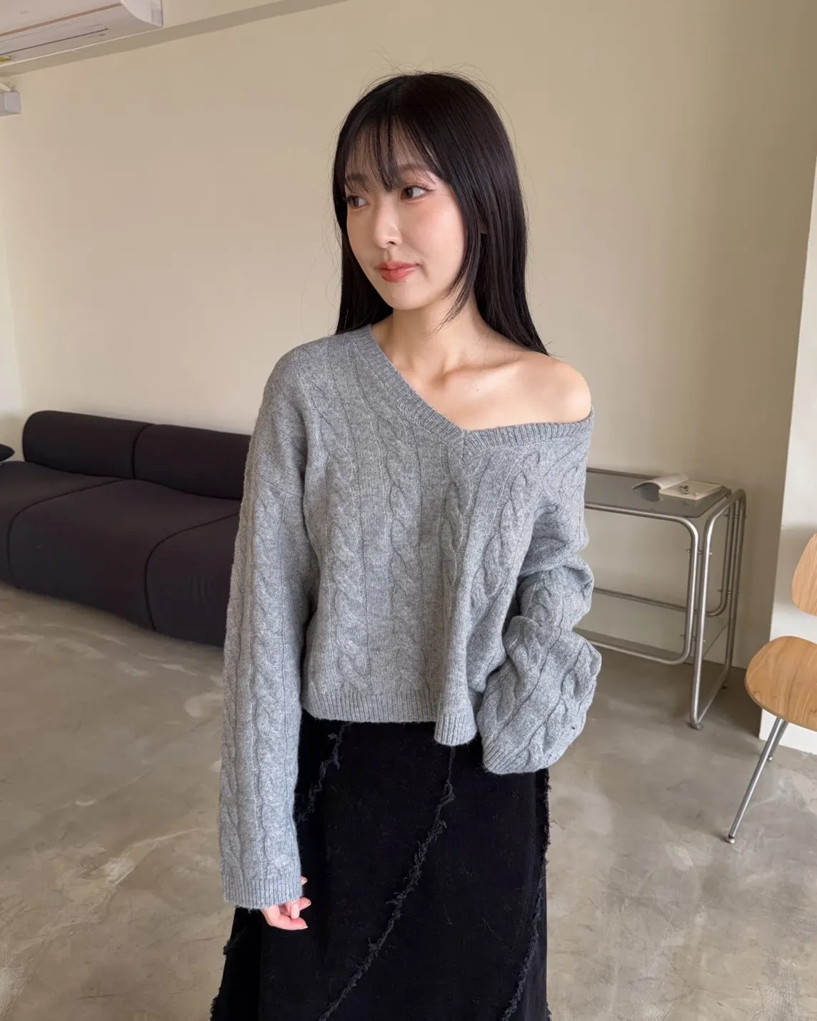 X0034溫柔歐膩V領麻花毛衣(米白/灰紫/灰/深藍)
