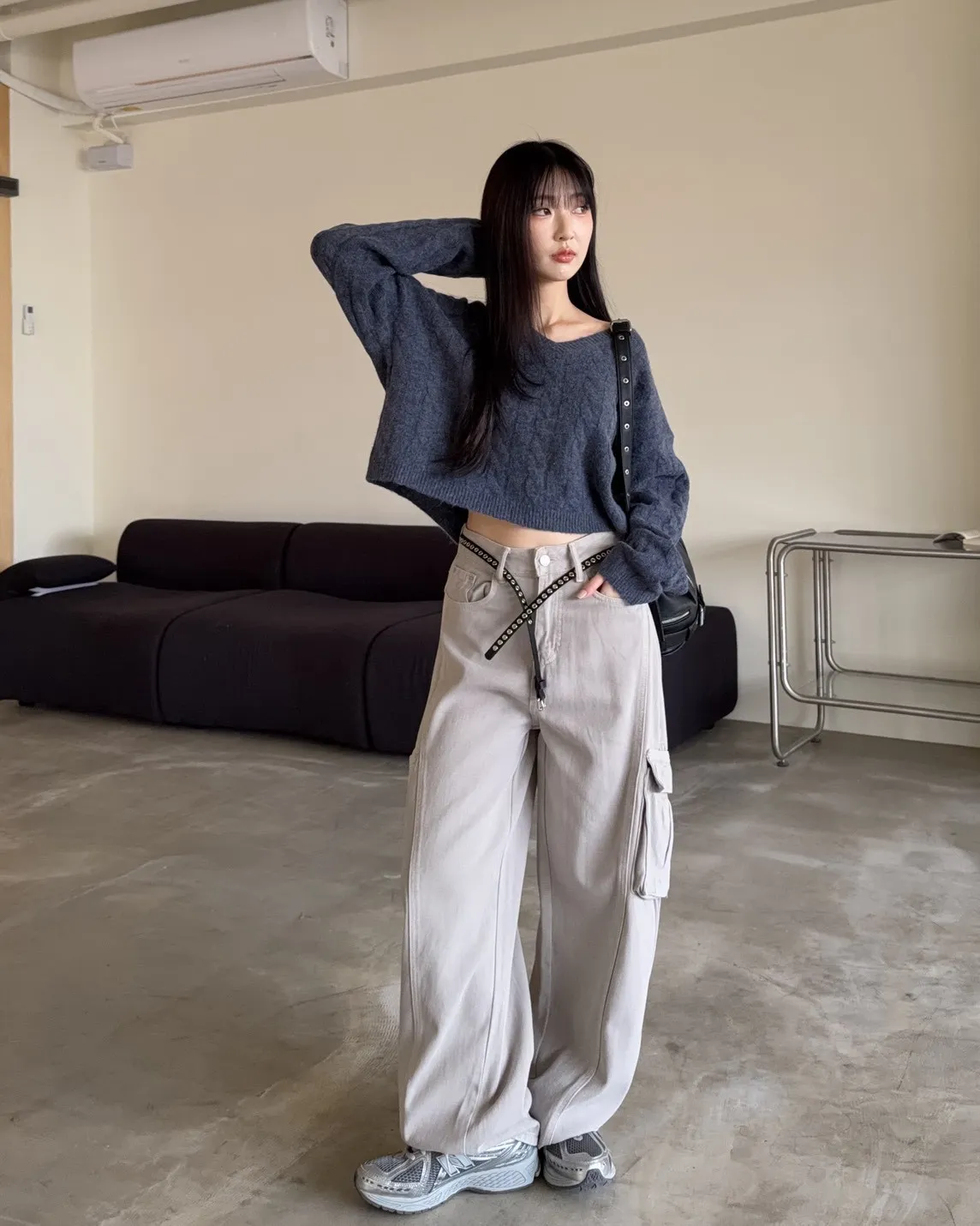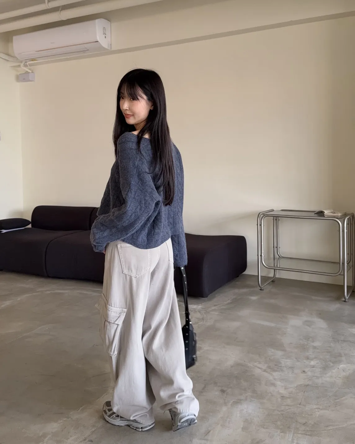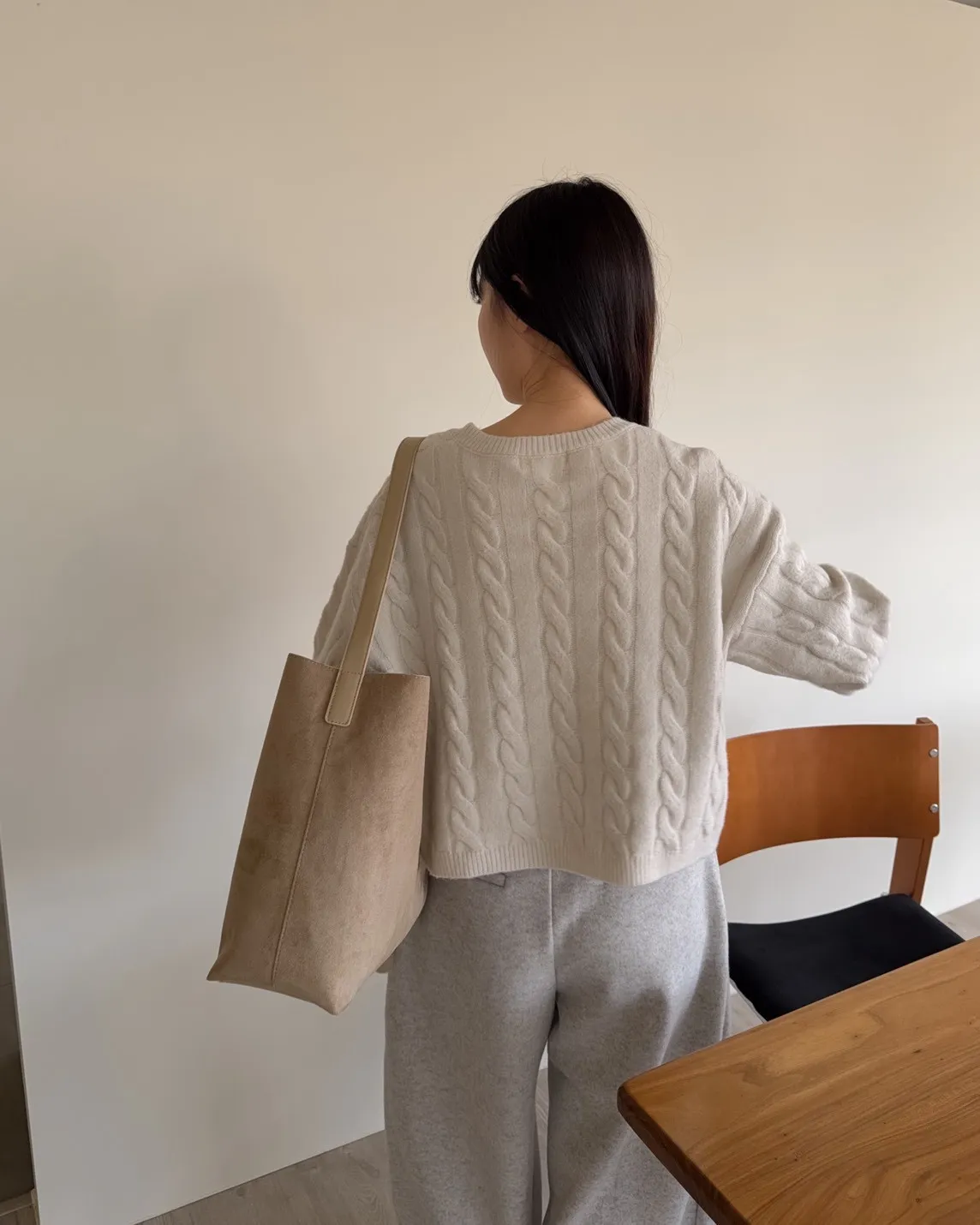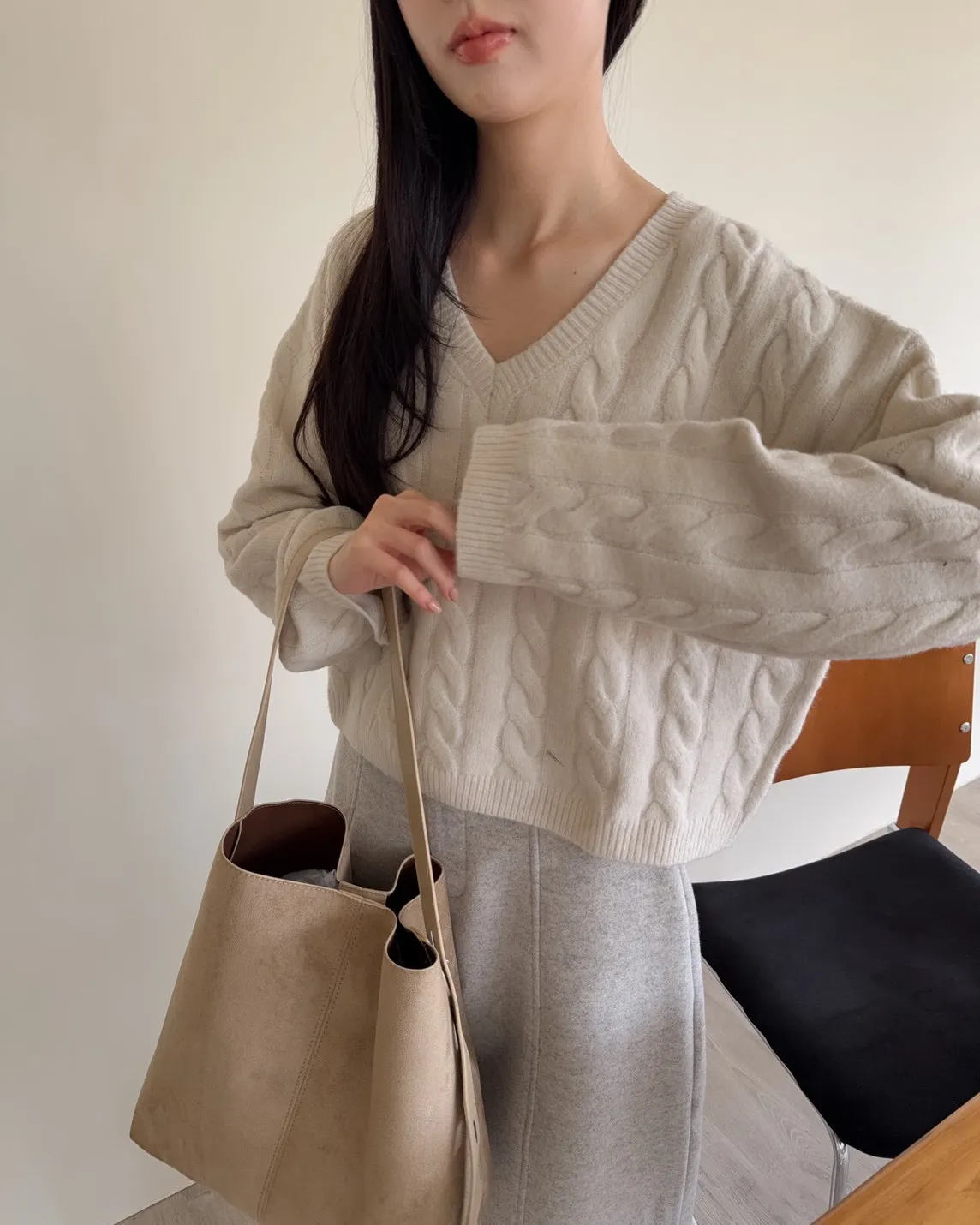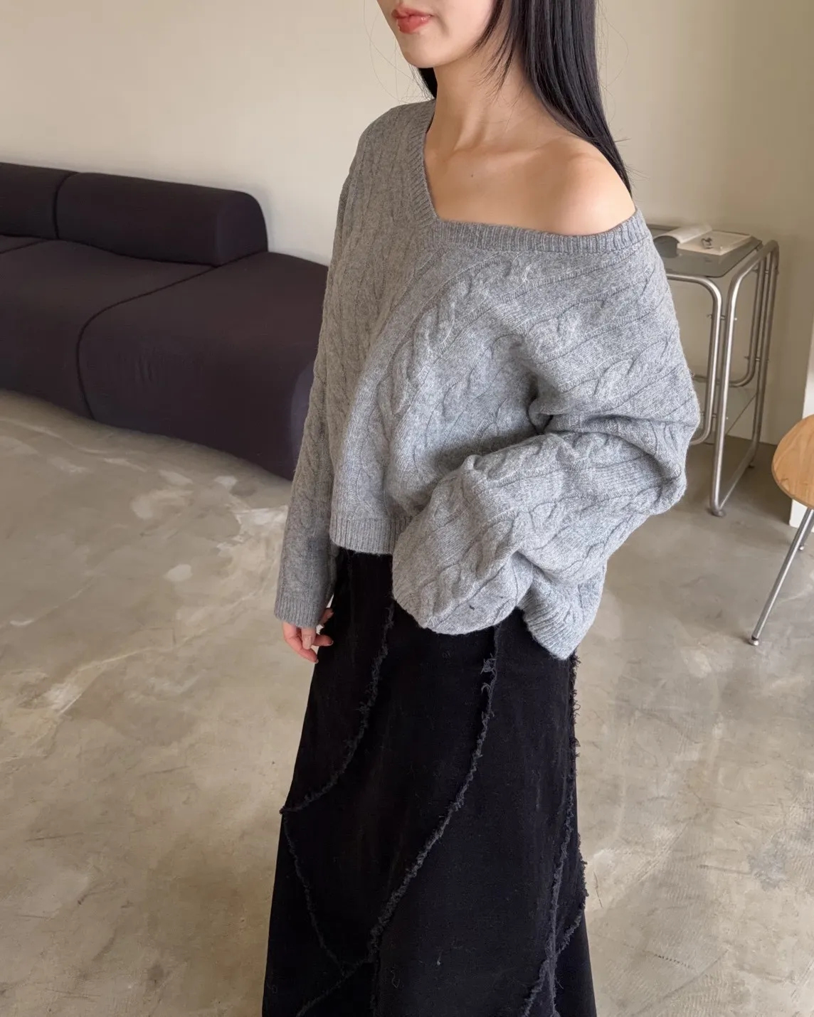 X0034溫柔歐膩V領麻花毛衣(米白/灰紫/灰/深藍)