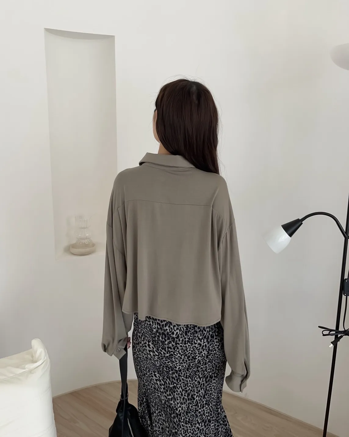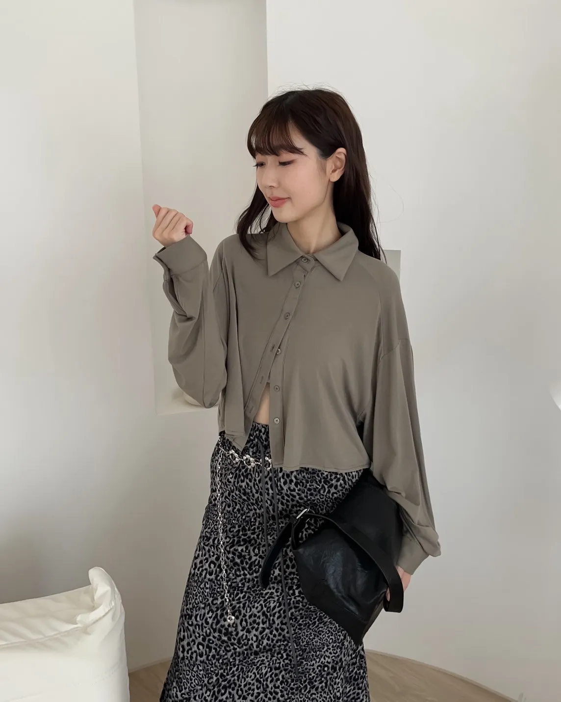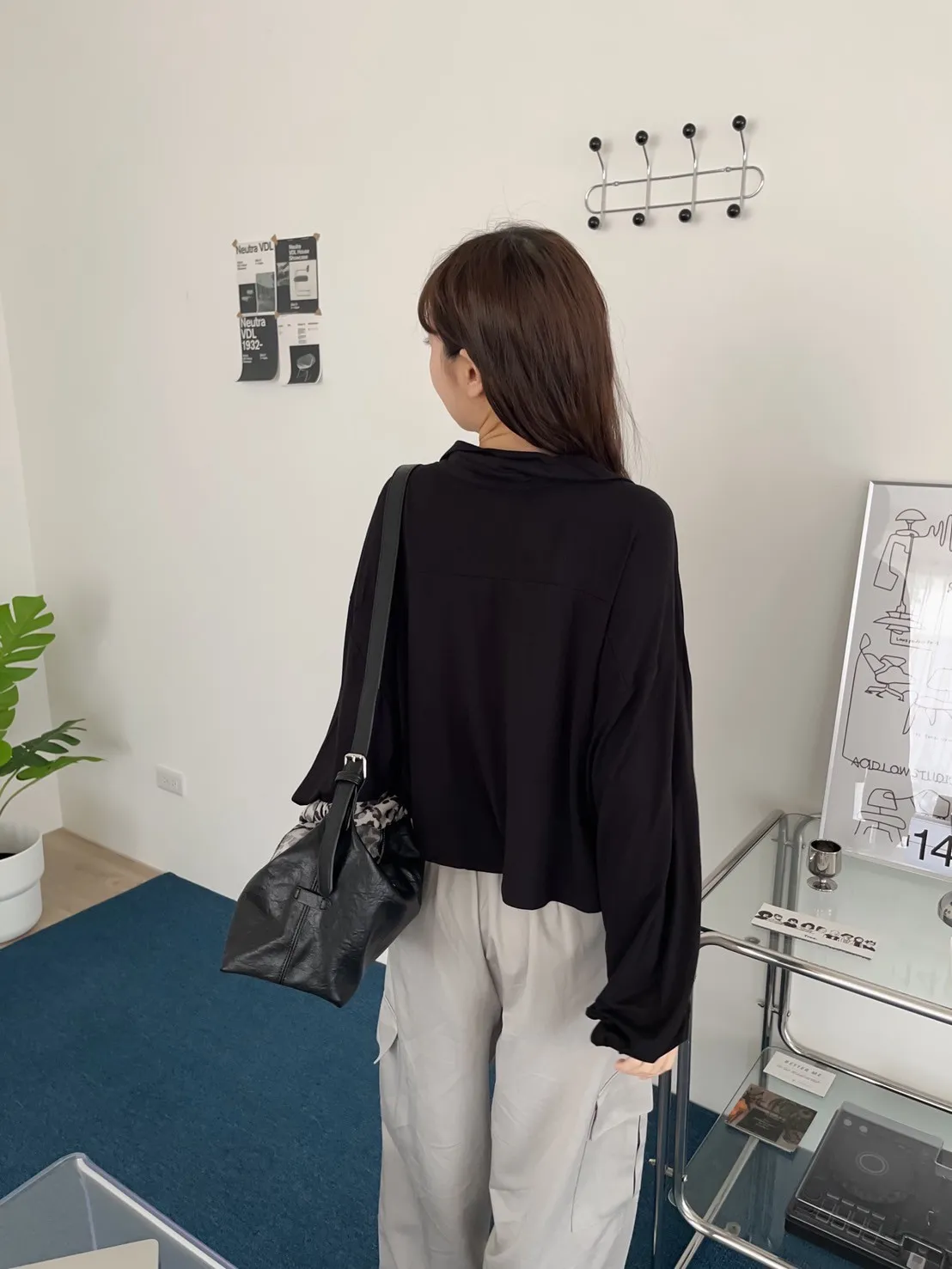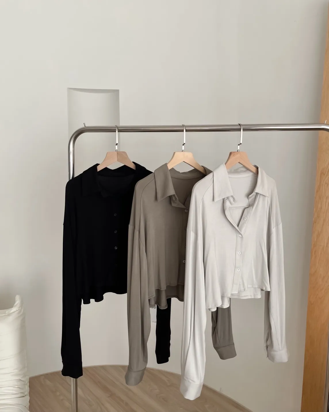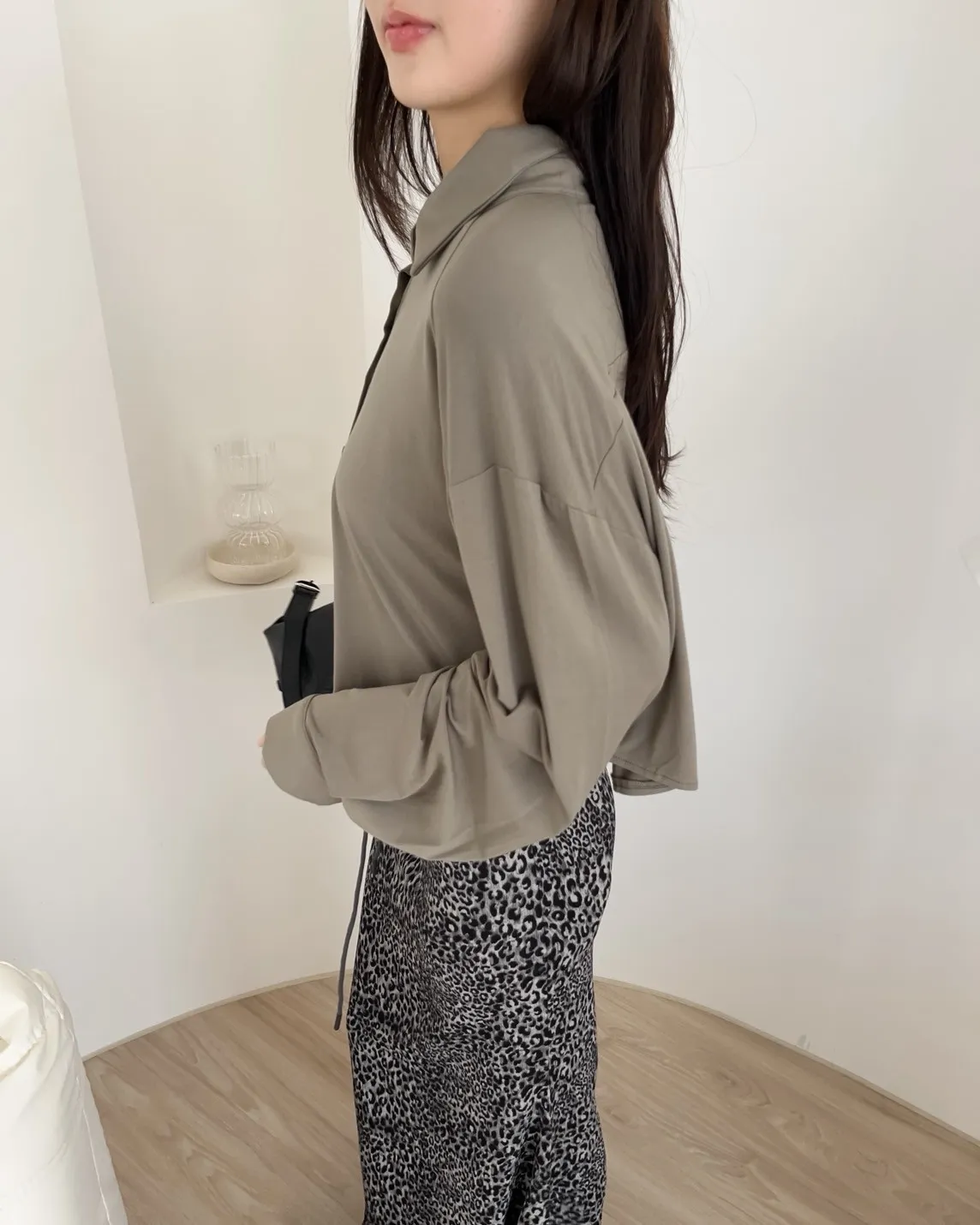 U0008莫代爾棉短版翻領排扣上衣(杏/綠/黑)
