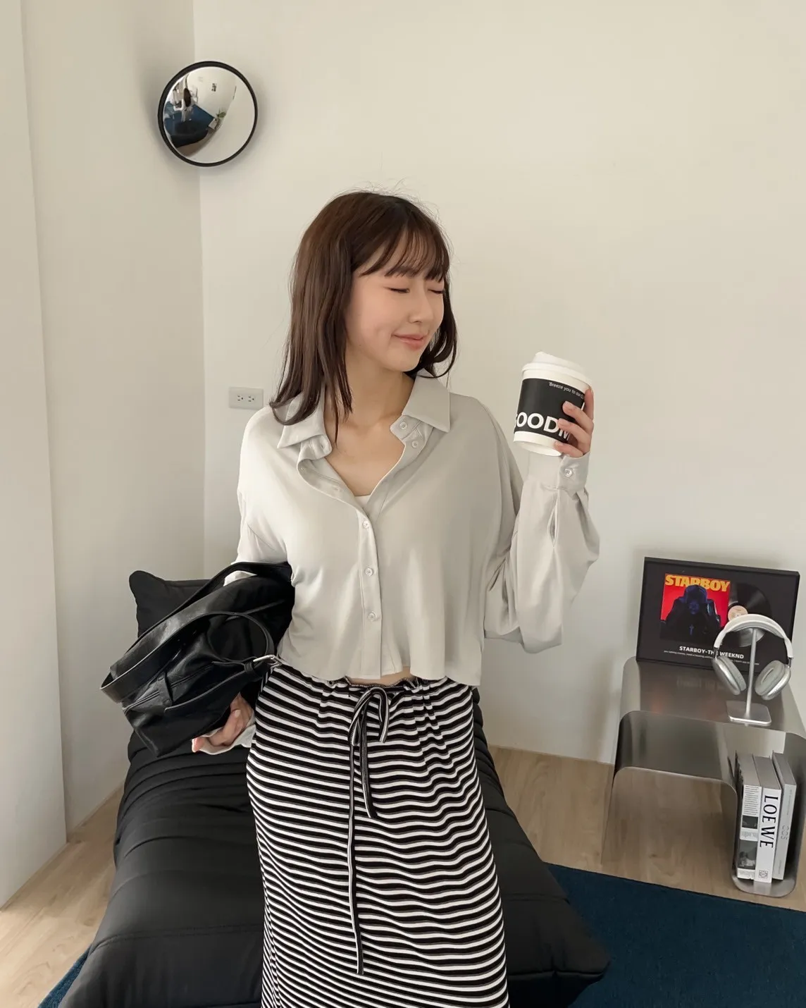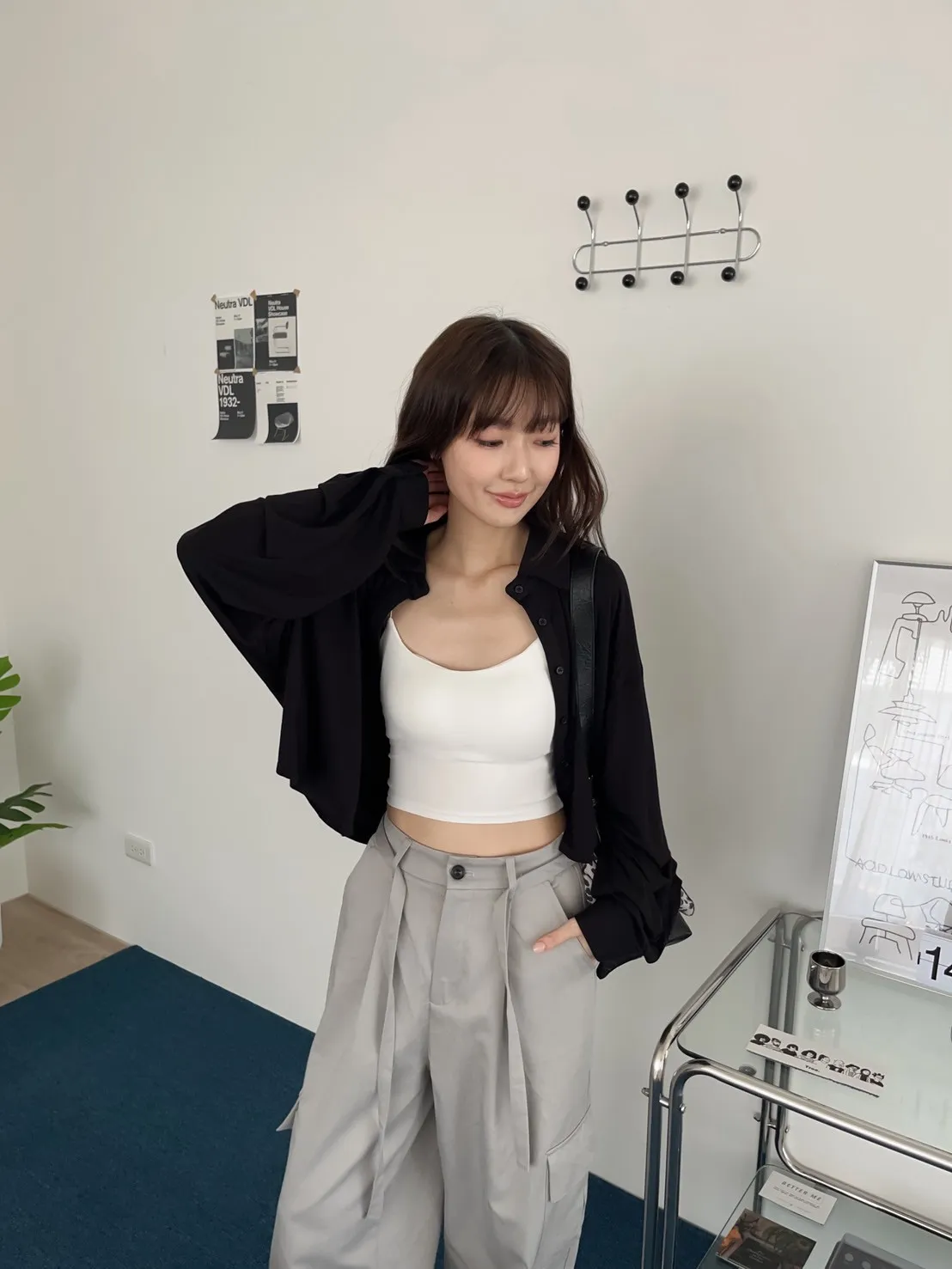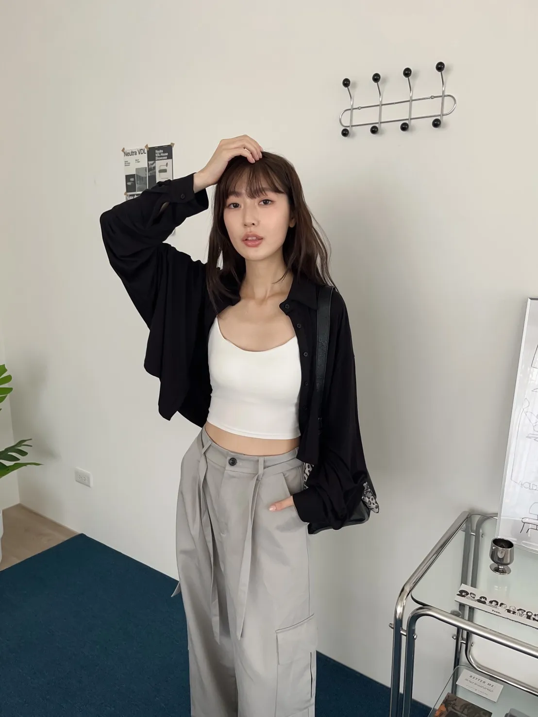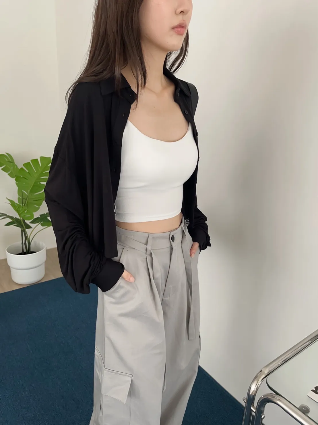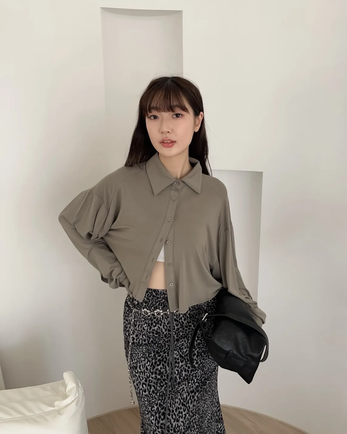 U0008莫代爾棉短版翻領排扣上衣(杏/綠/黑)