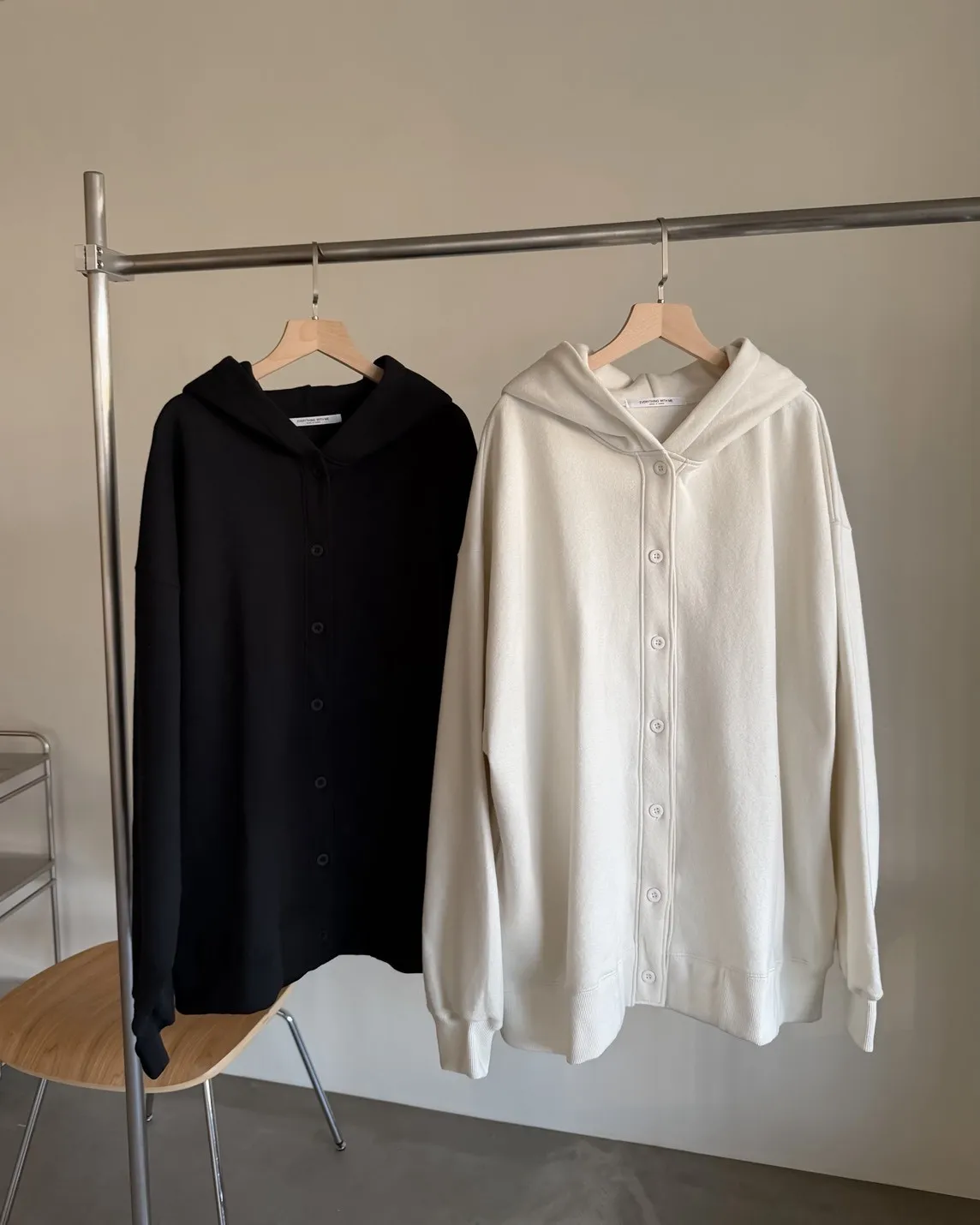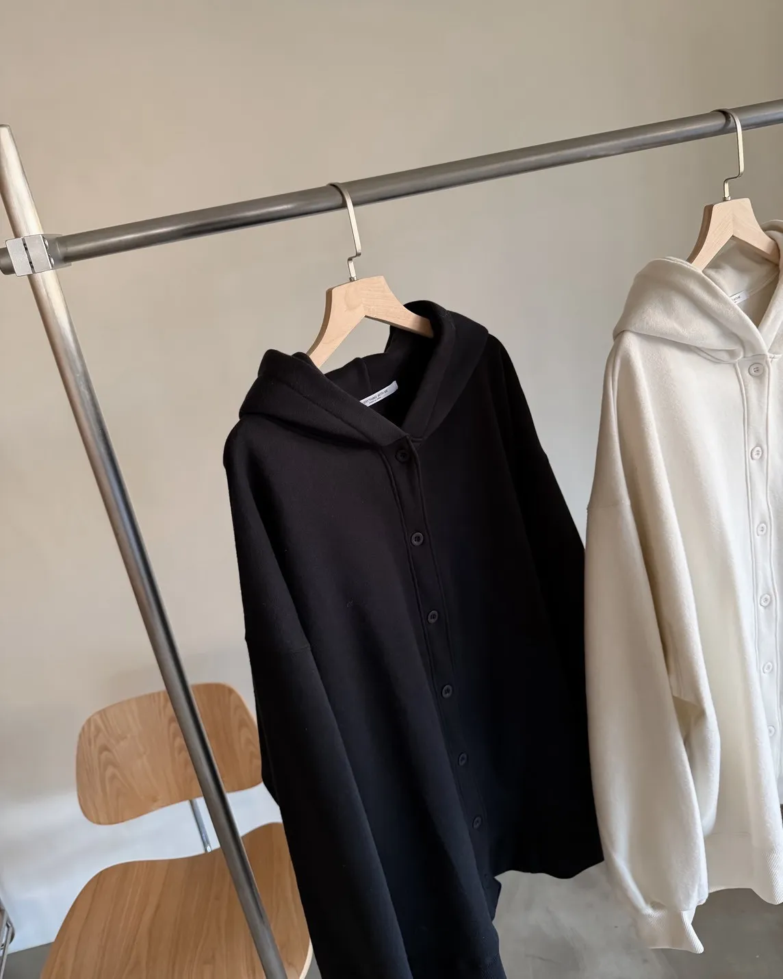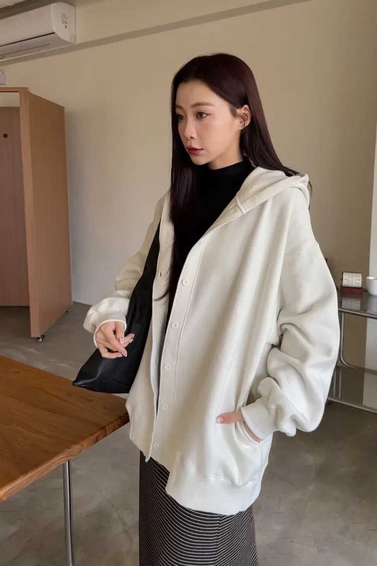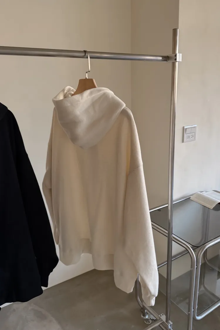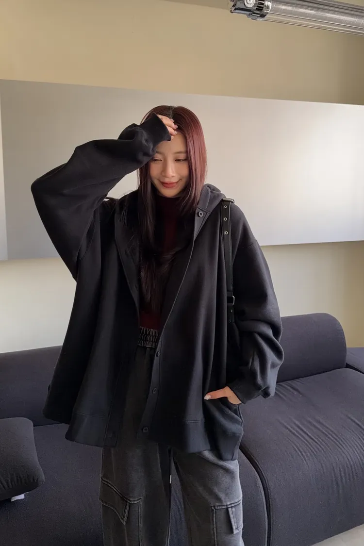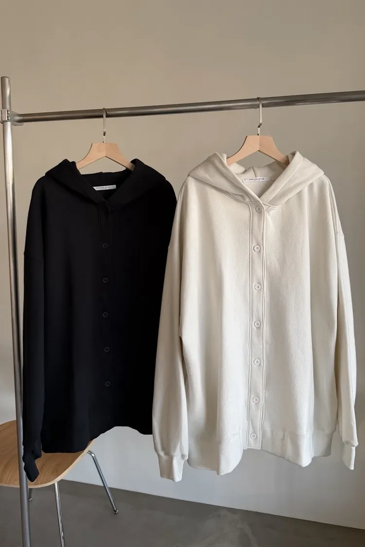 連帽 內刷毛 兩側口袋 同色系鈕扣 寬鬆落肩