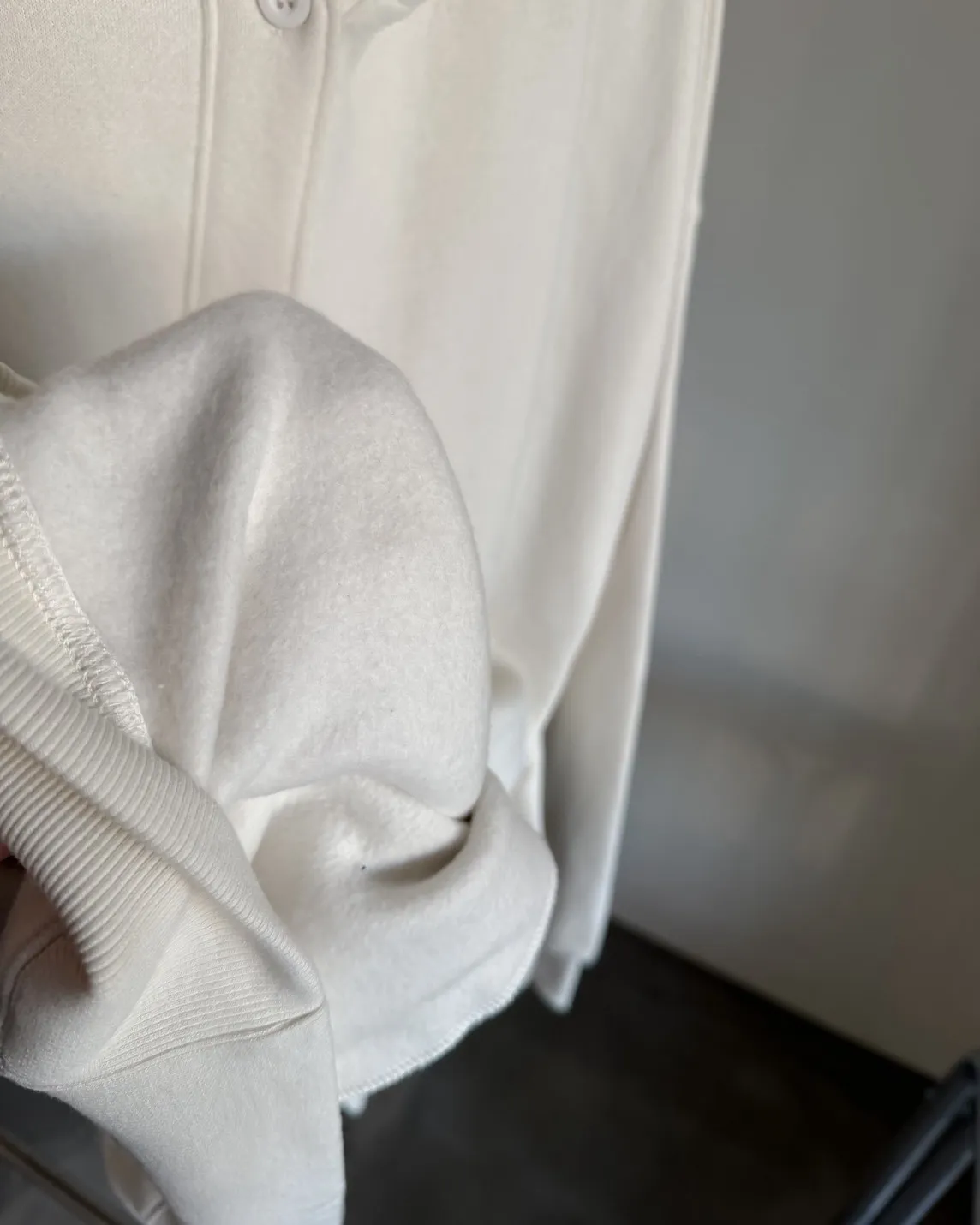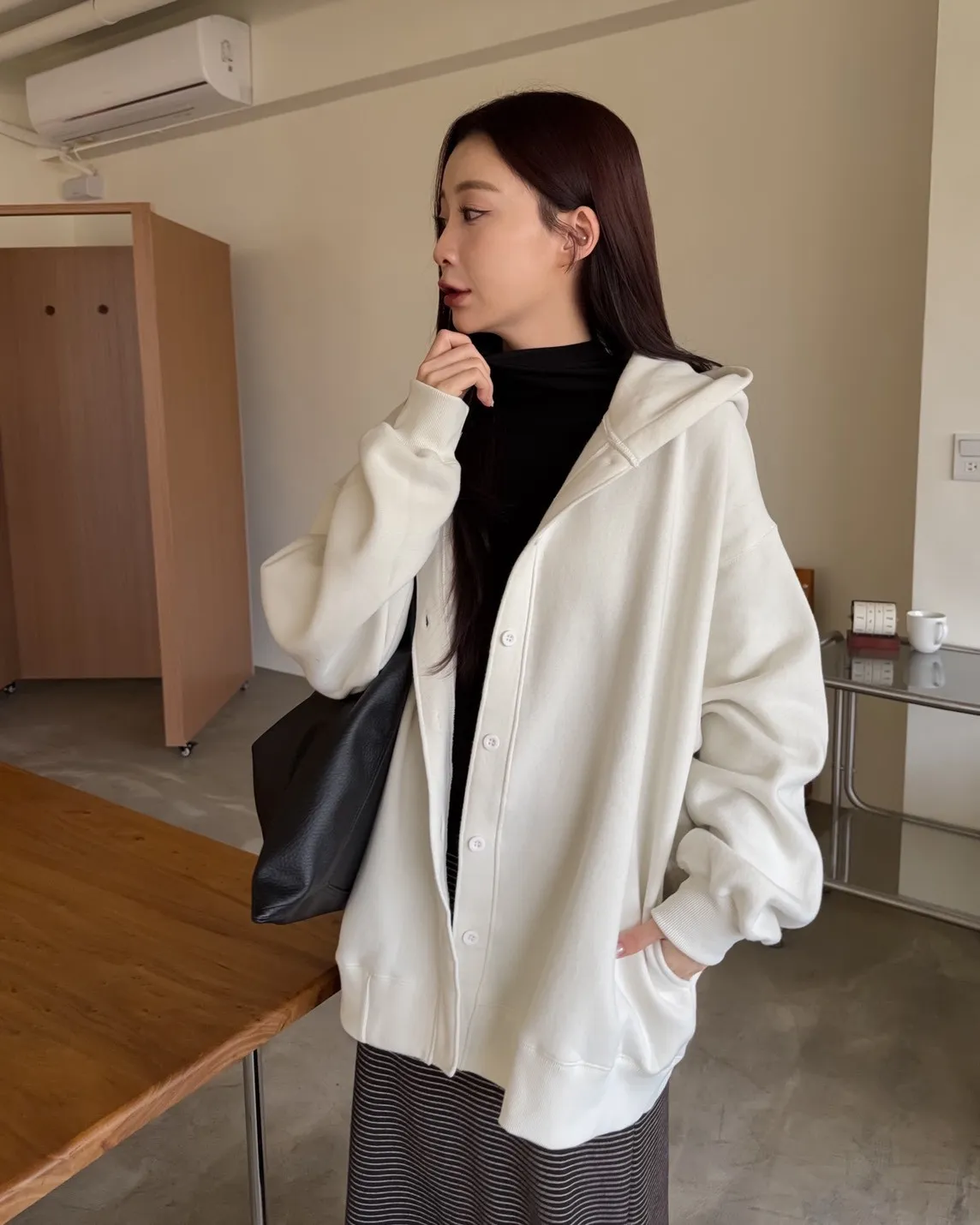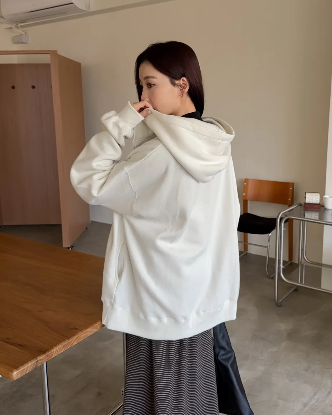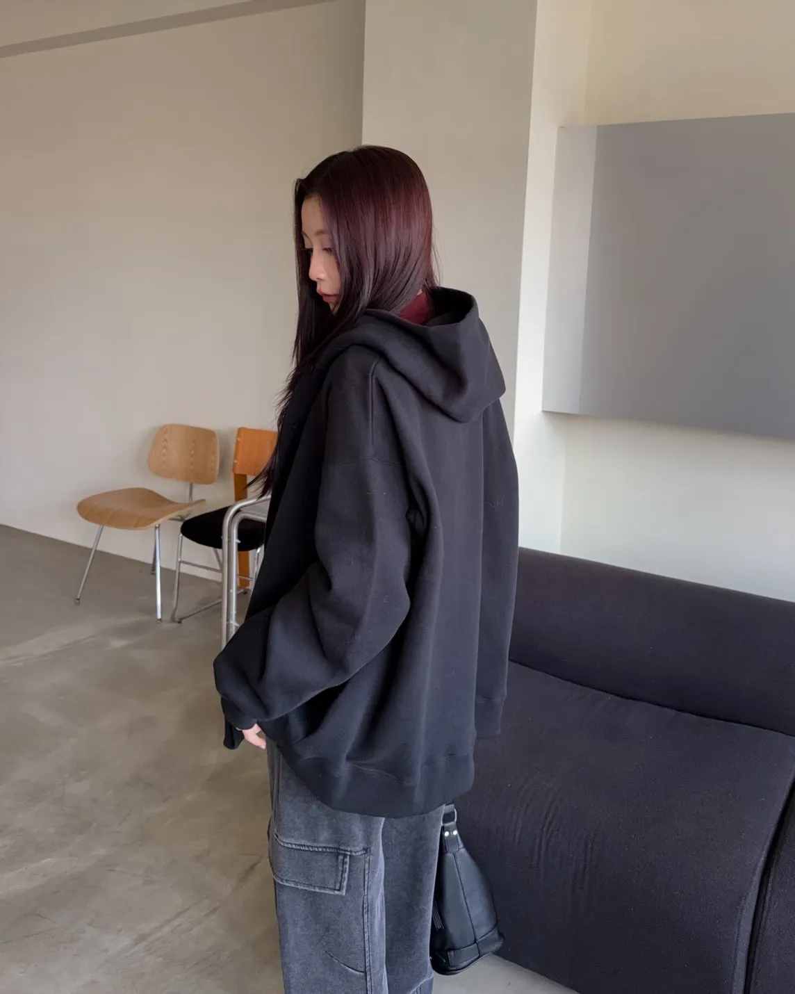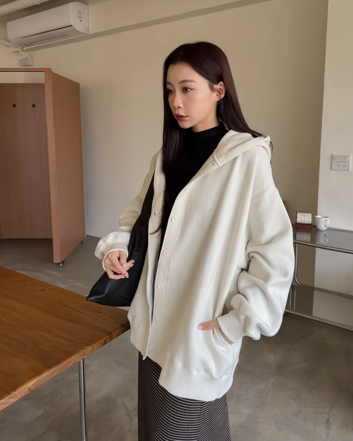 連帽 內刷毛 兩側口袋 同色系鈕扣 寬鬆落肩