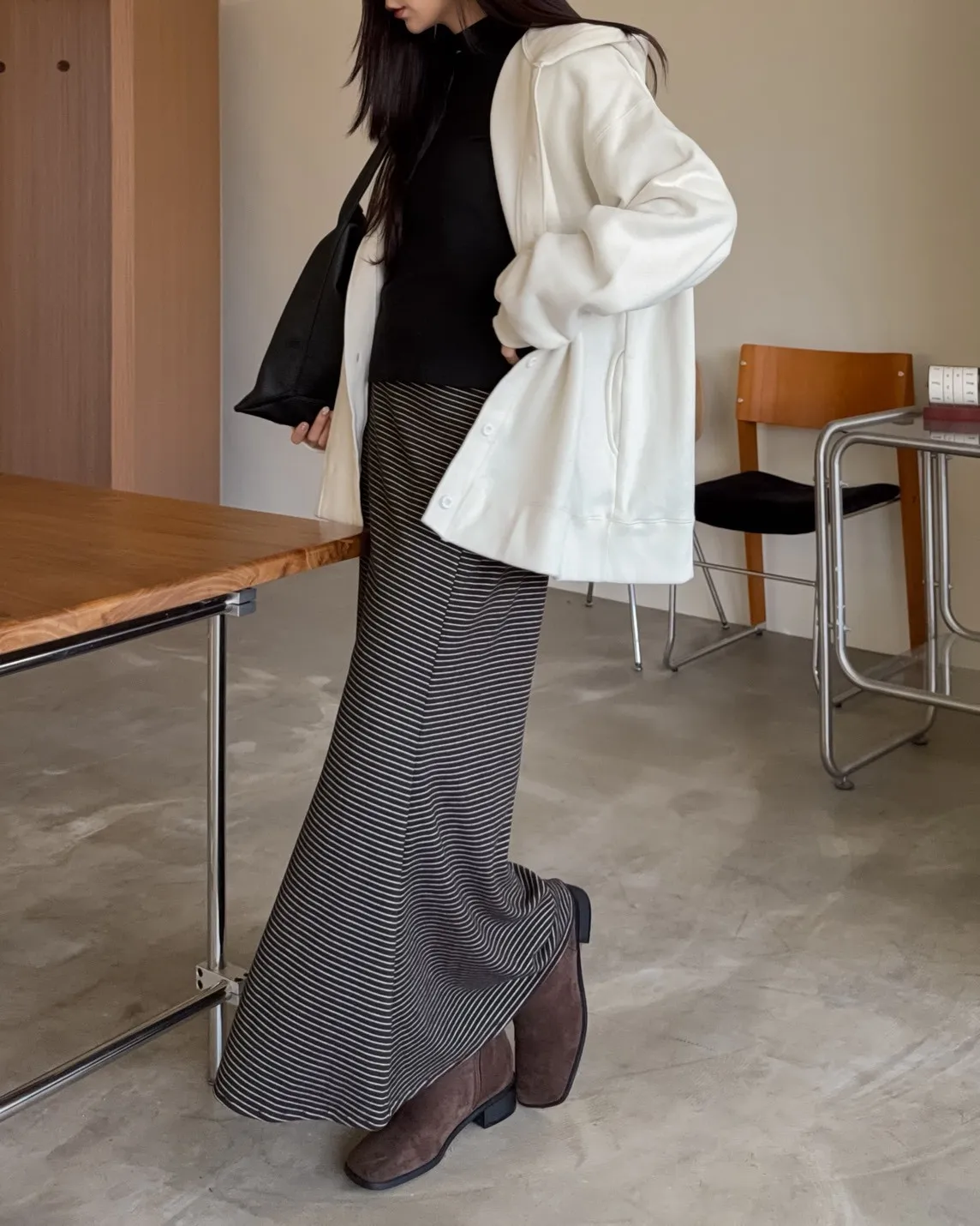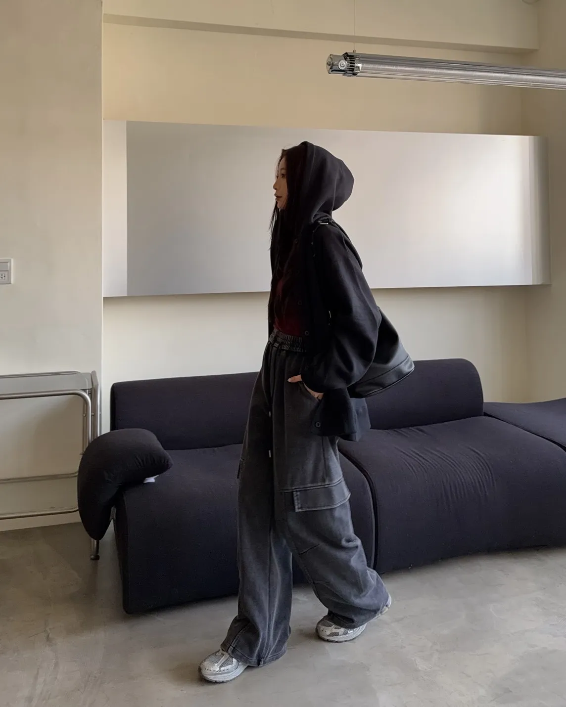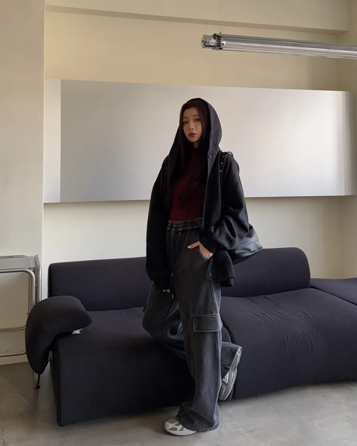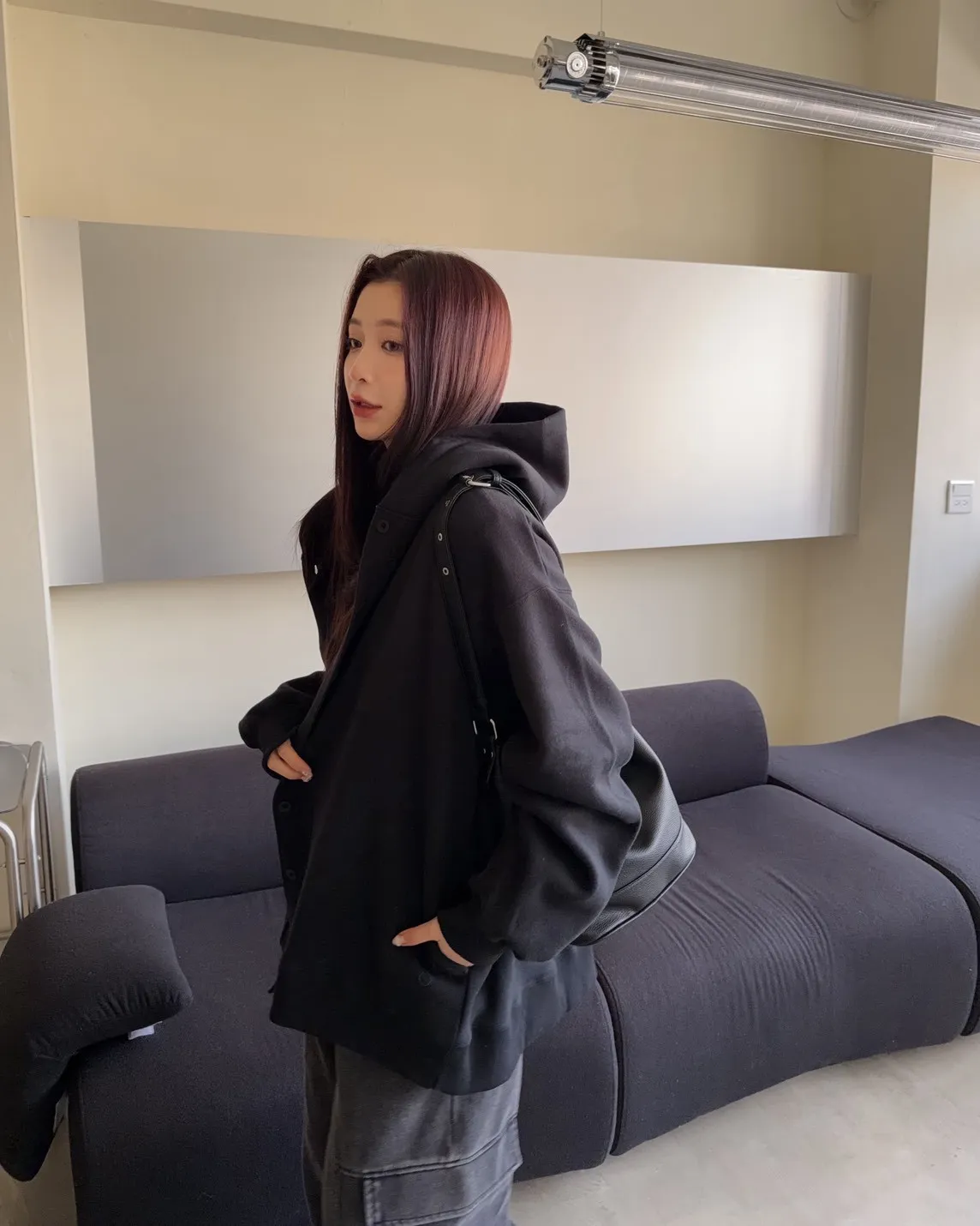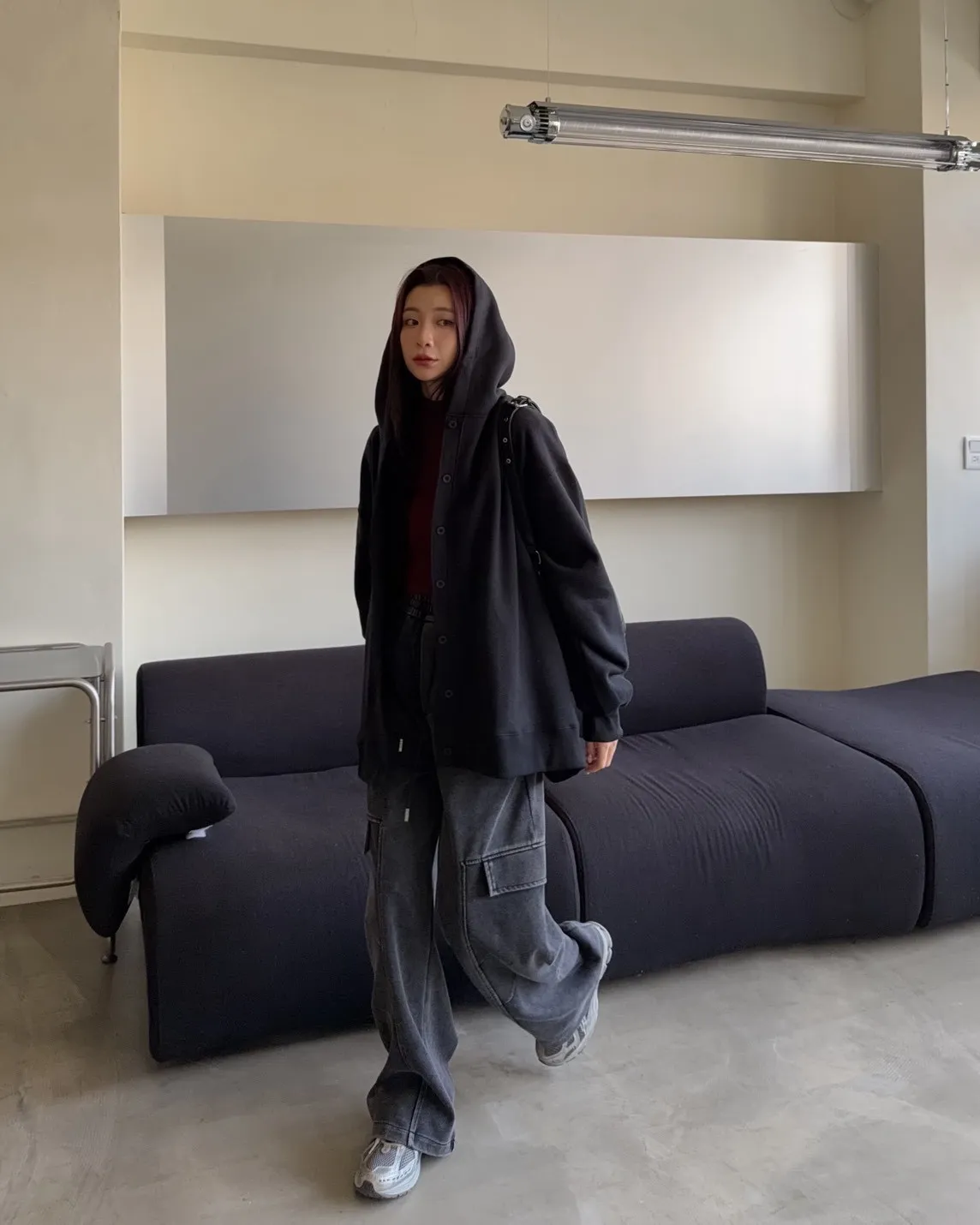 連帽 內刷毛 兩側口袋 同色系鈕扣 寬鬆落肩