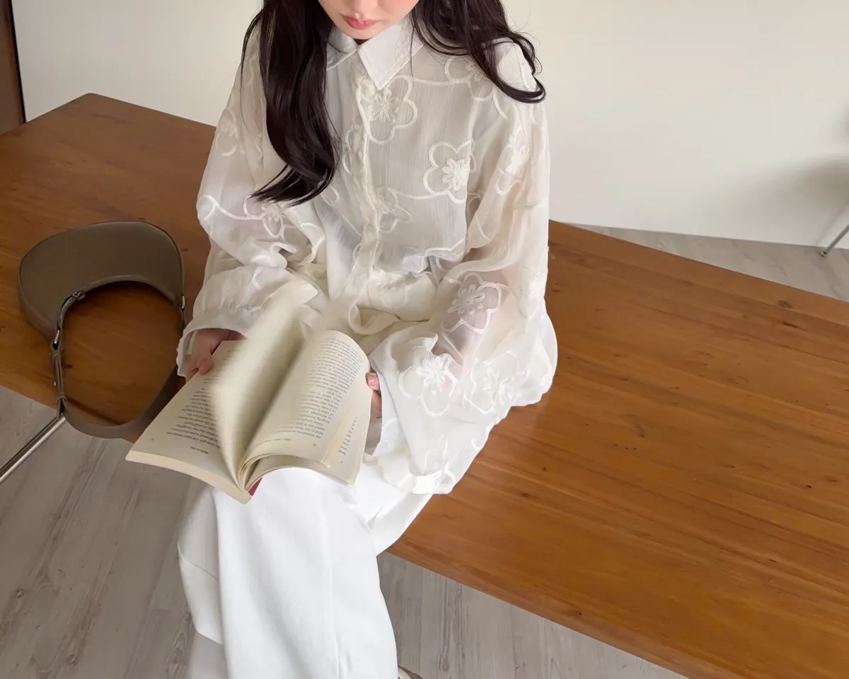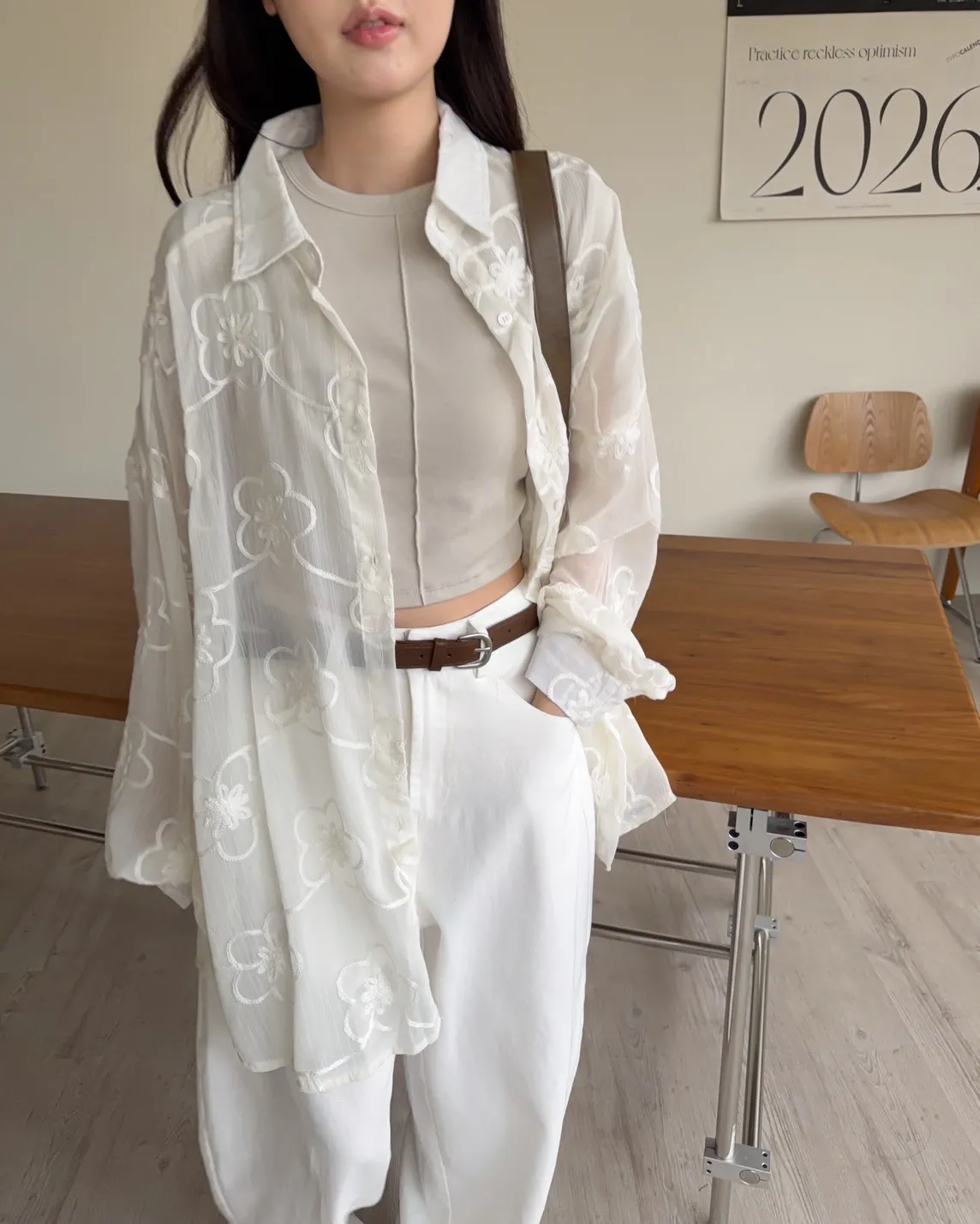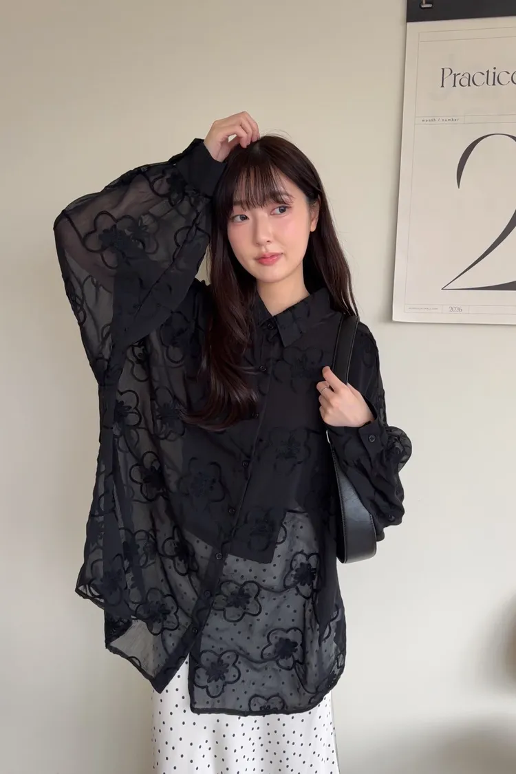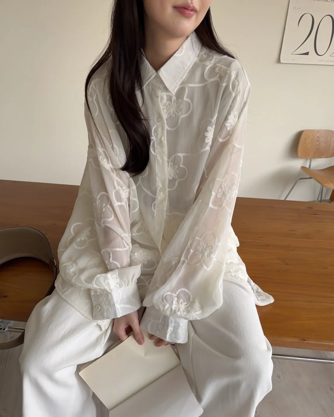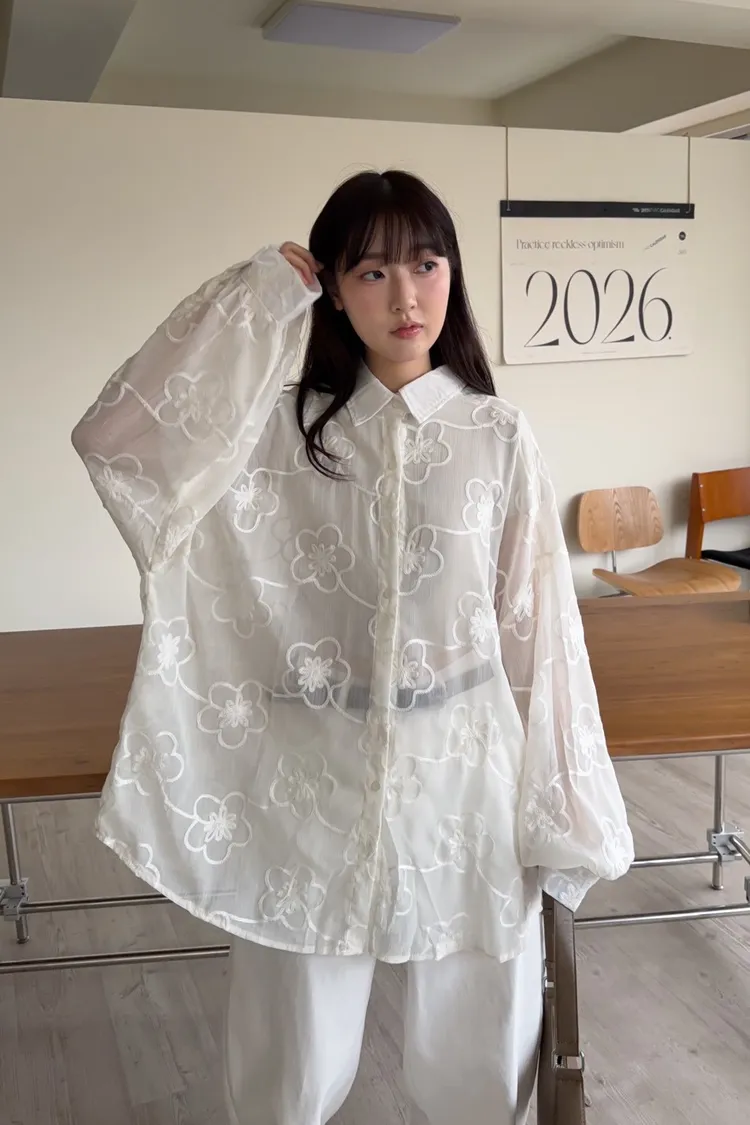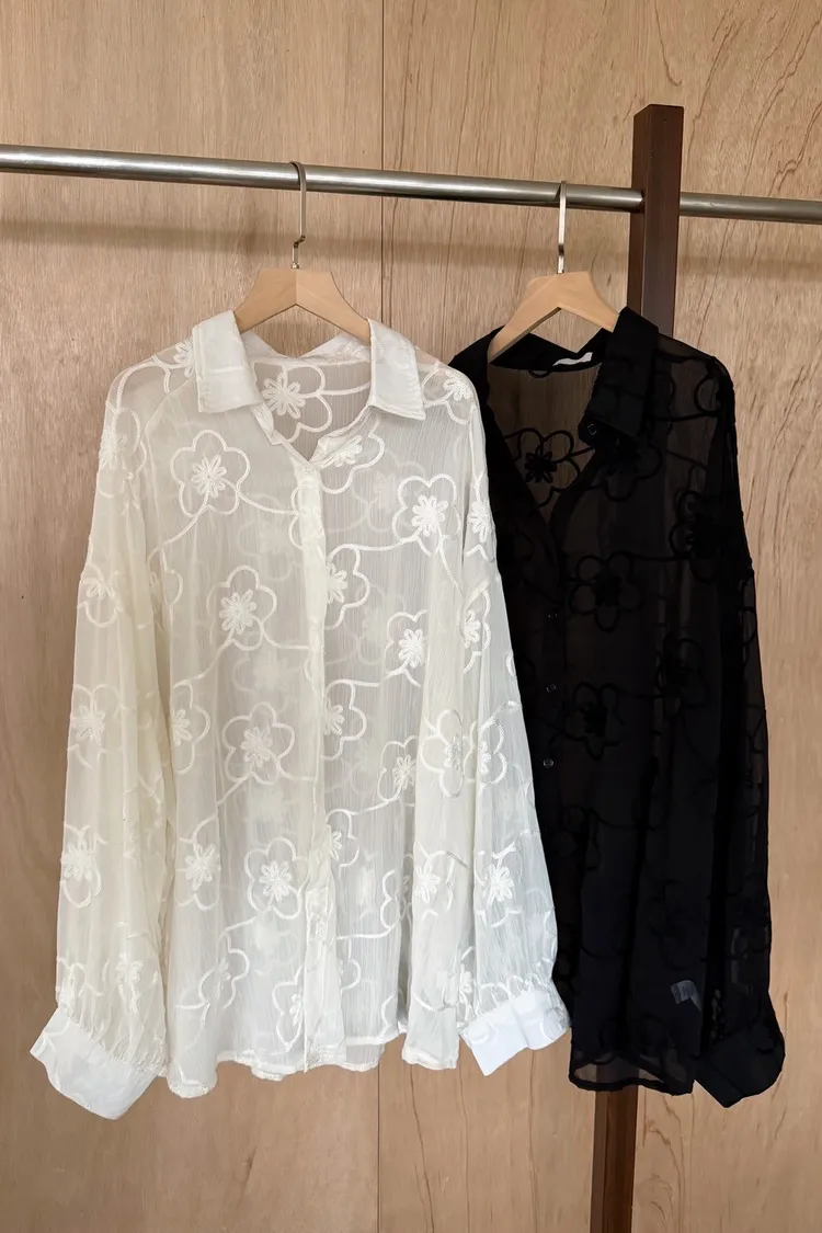 B0010花朵刺繡長版透紗襯衫(米白/黑)