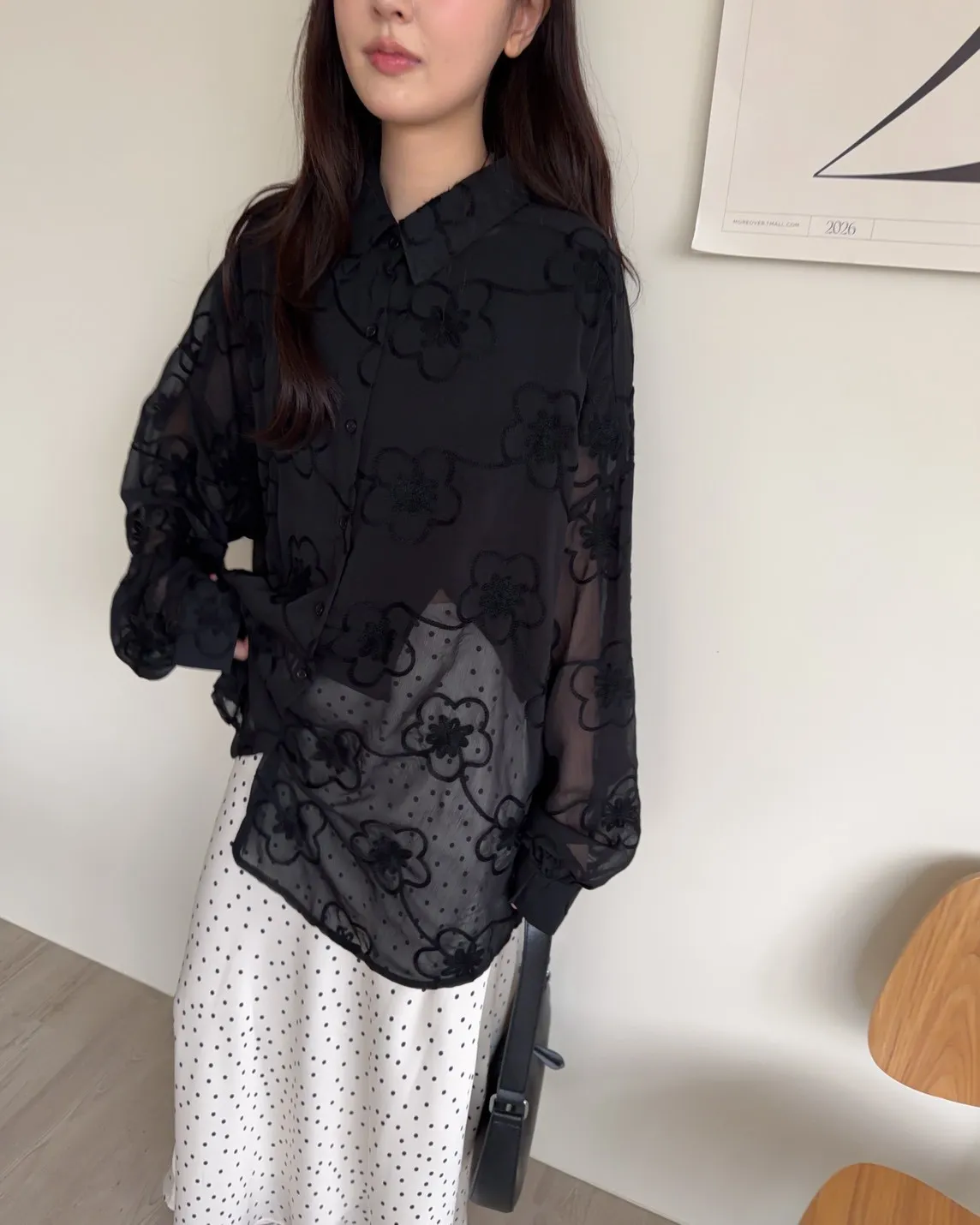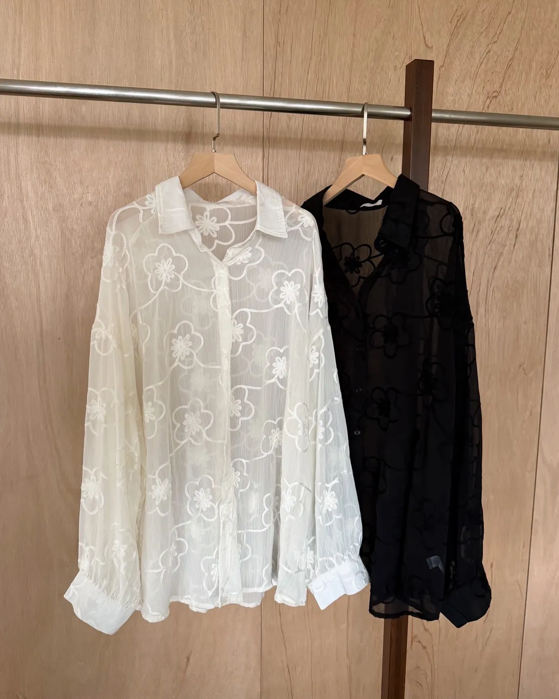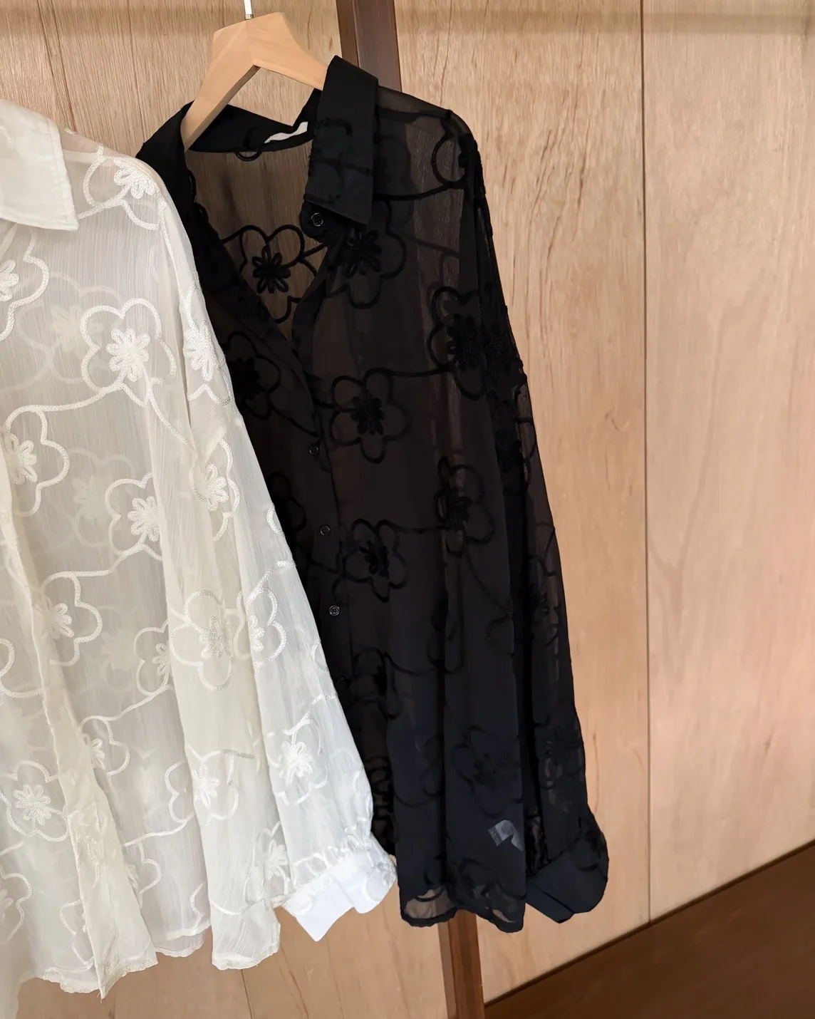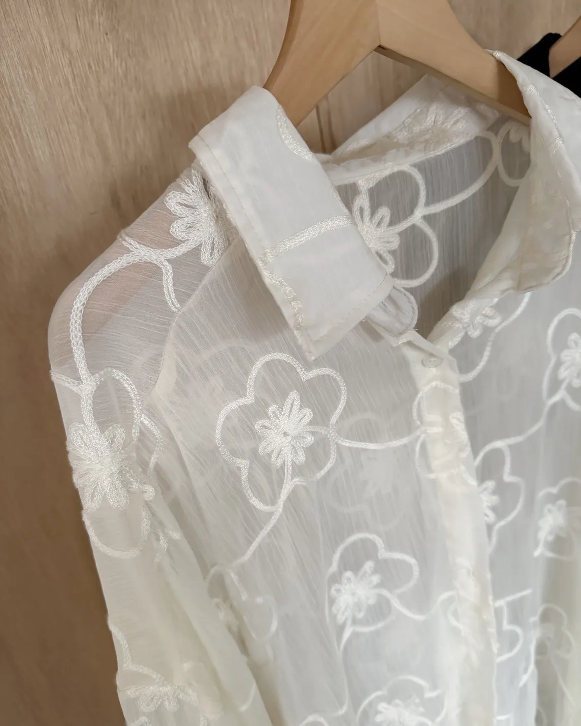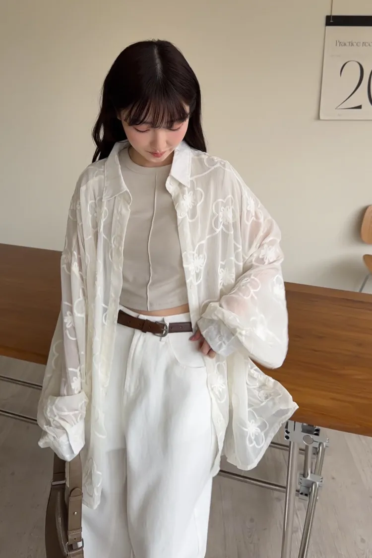 B0010花朵刺繡長版透紗襯衫(米白/黑)