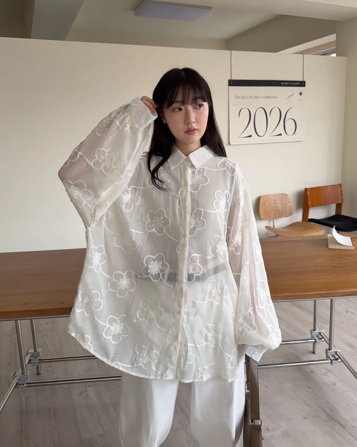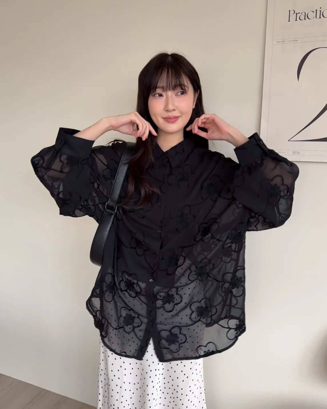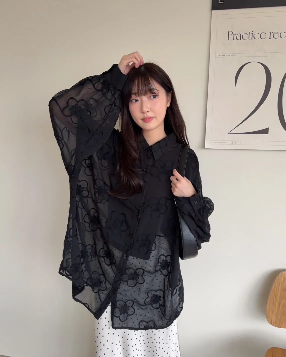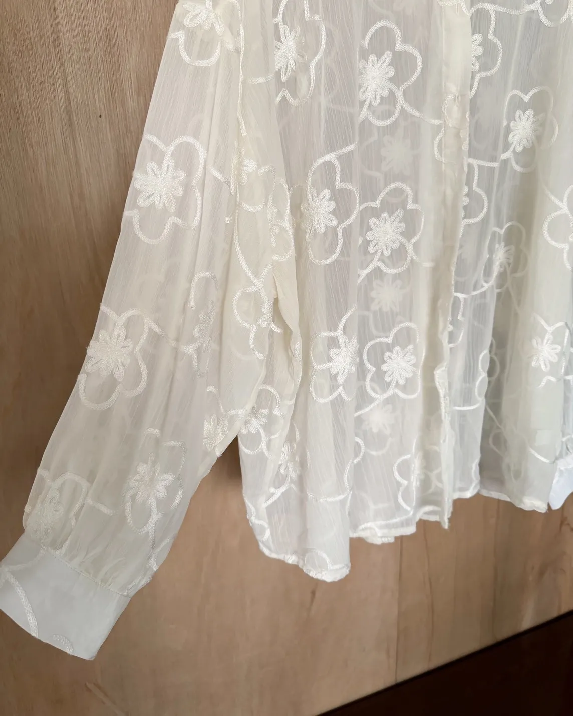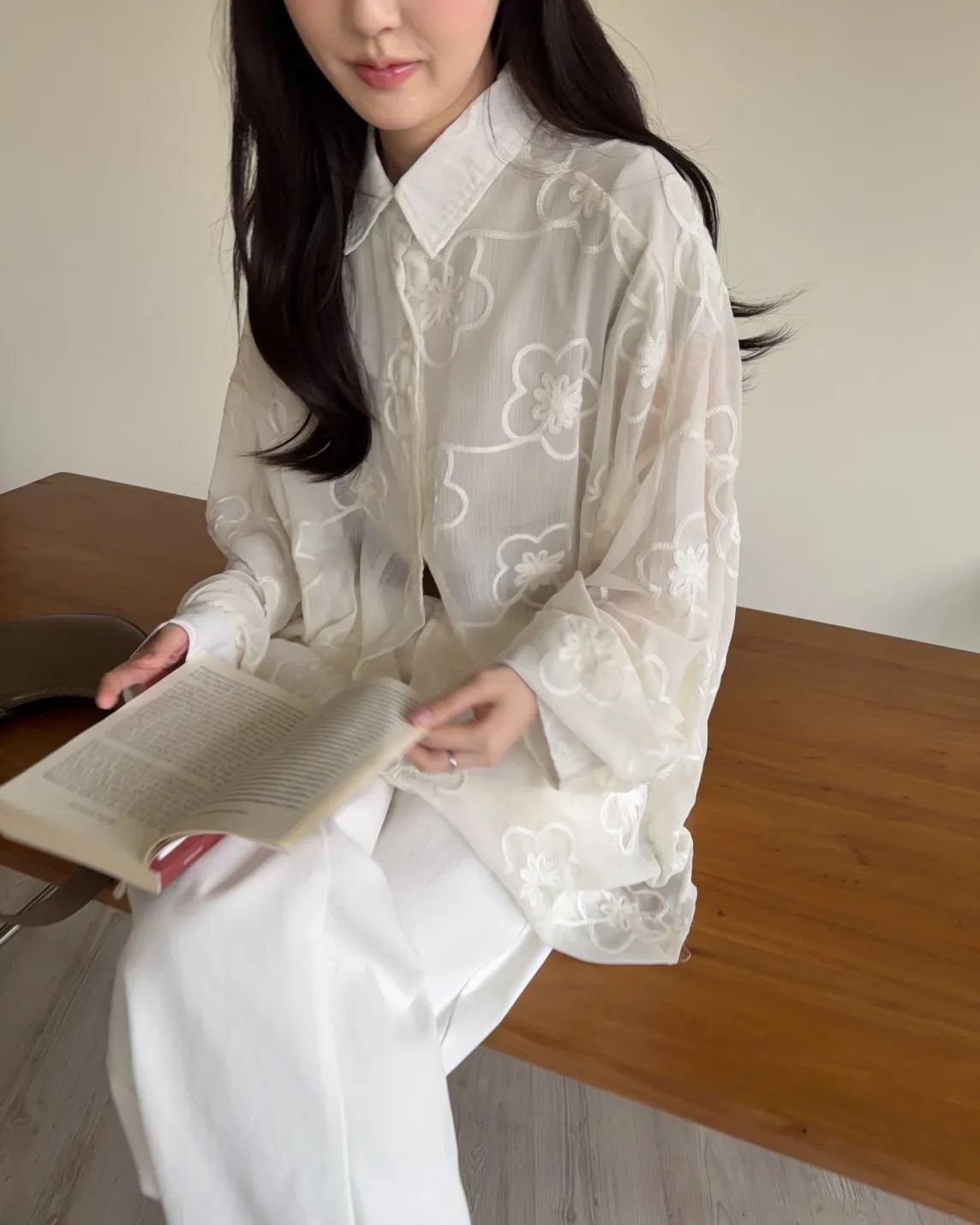 B0010花朵刺繡長版透紗襯衫(米白/黑)