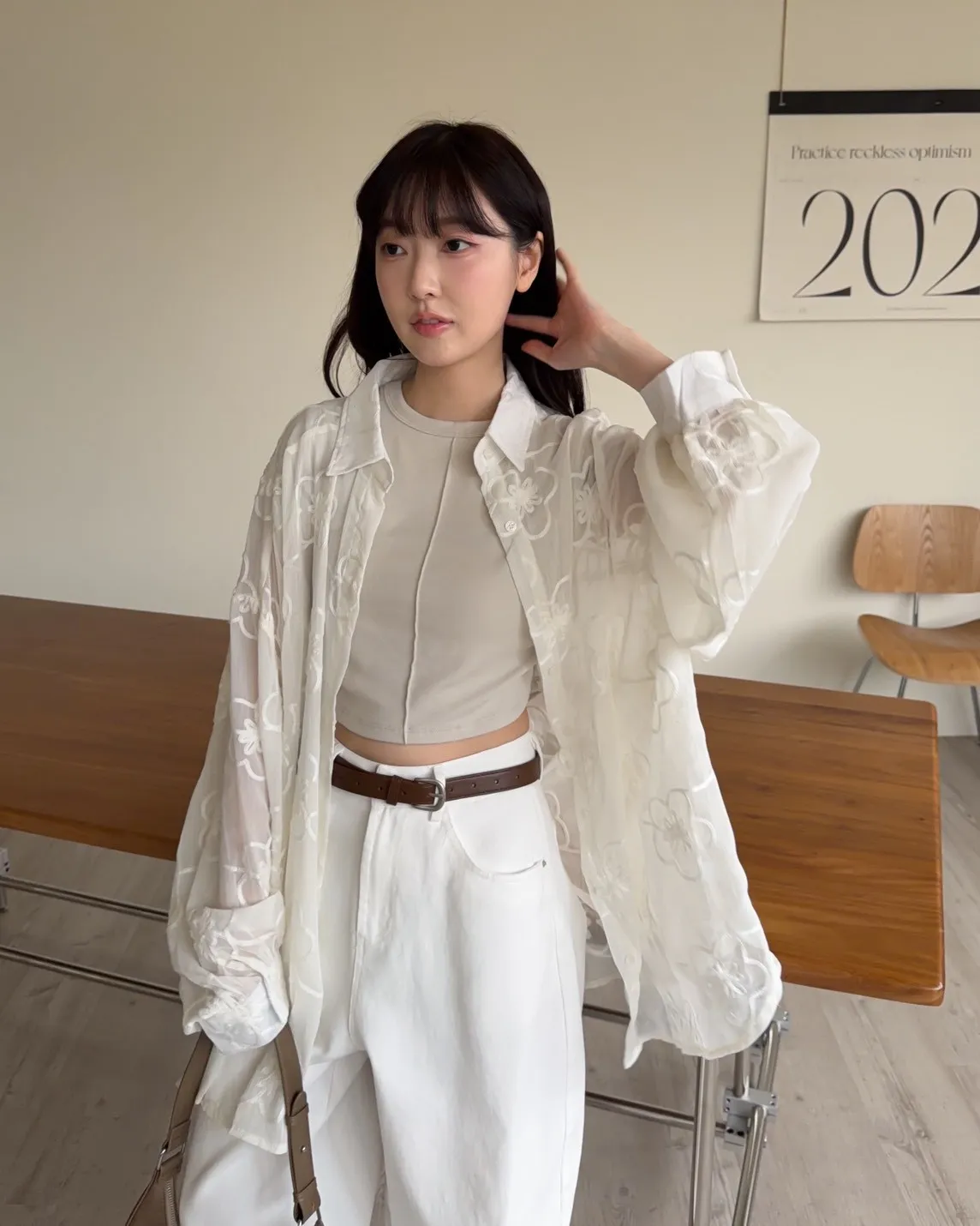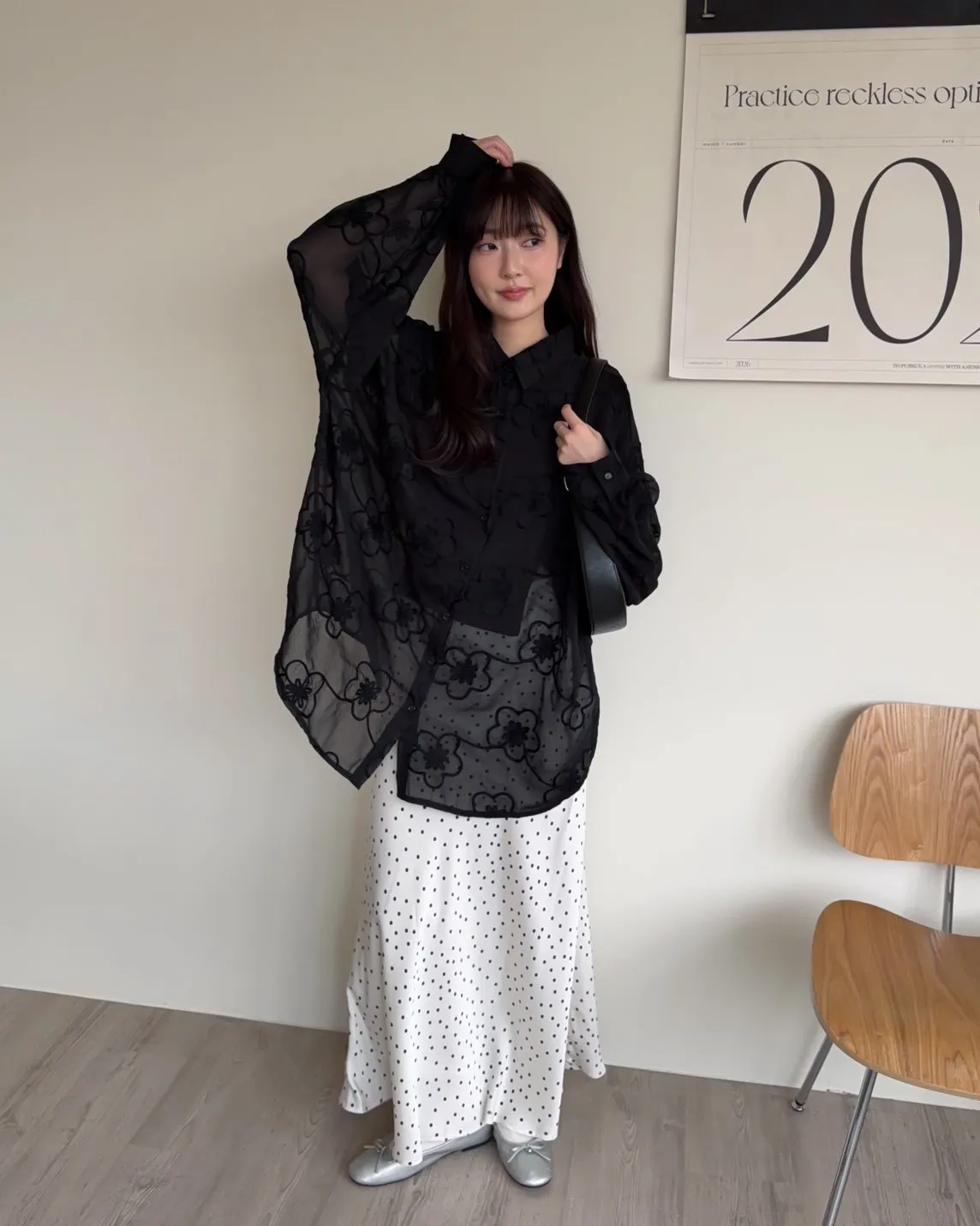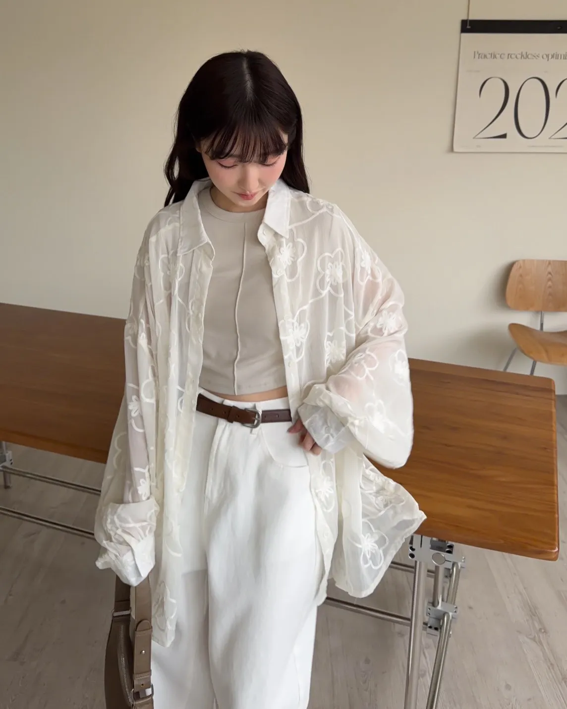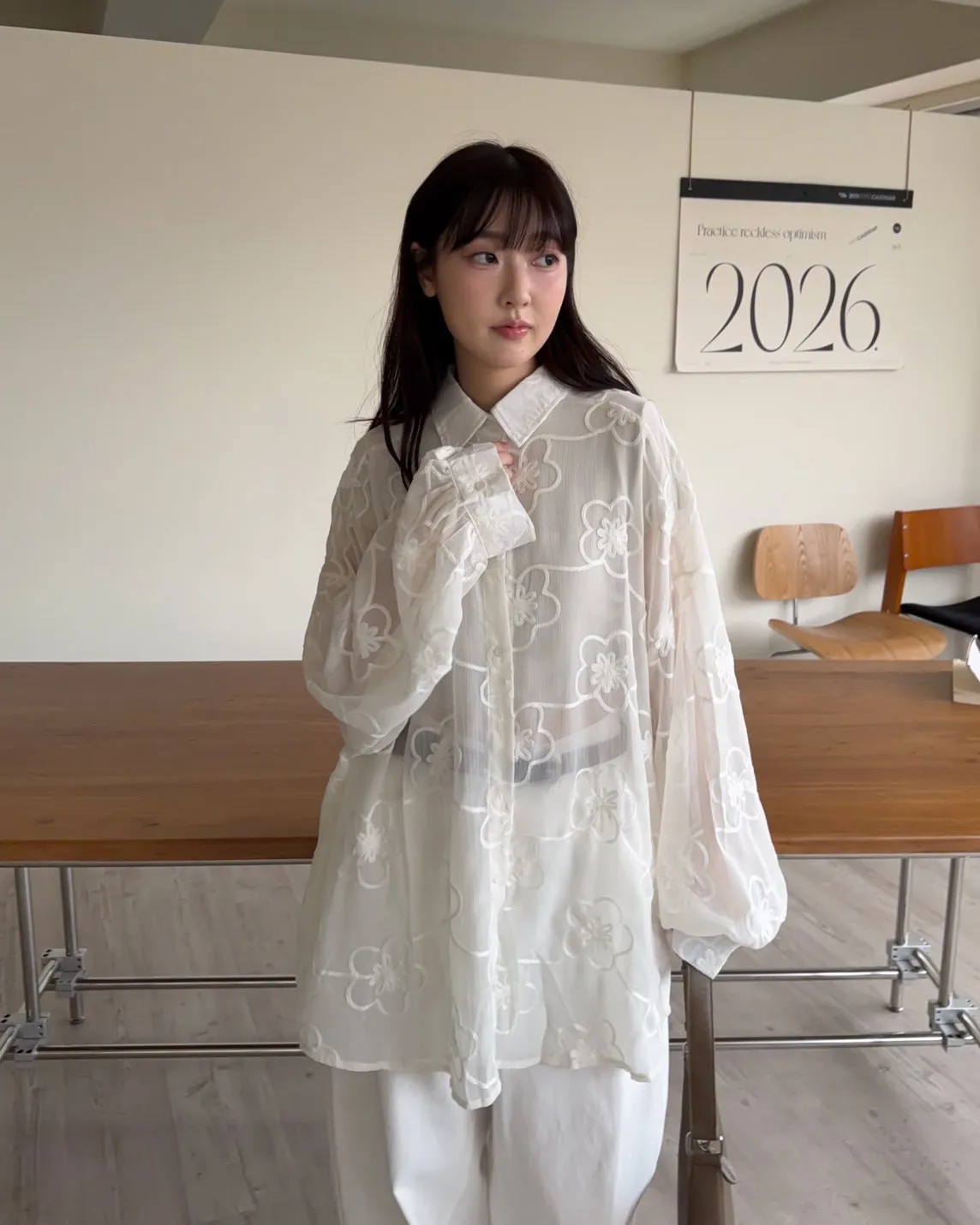 B0010花朵刺繡長版透紗襯衫(米白/黑)