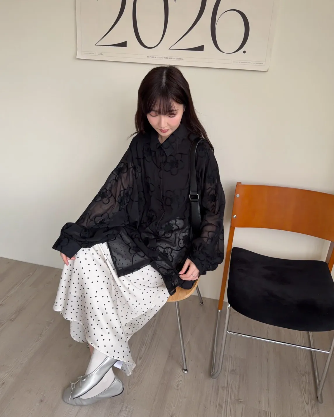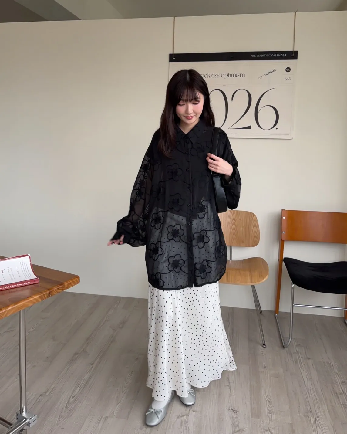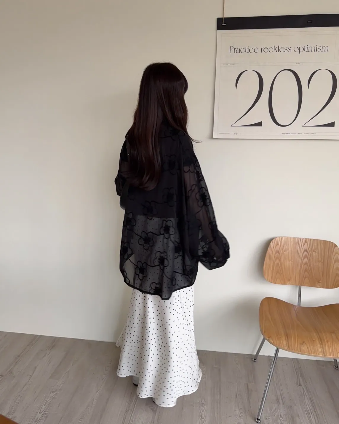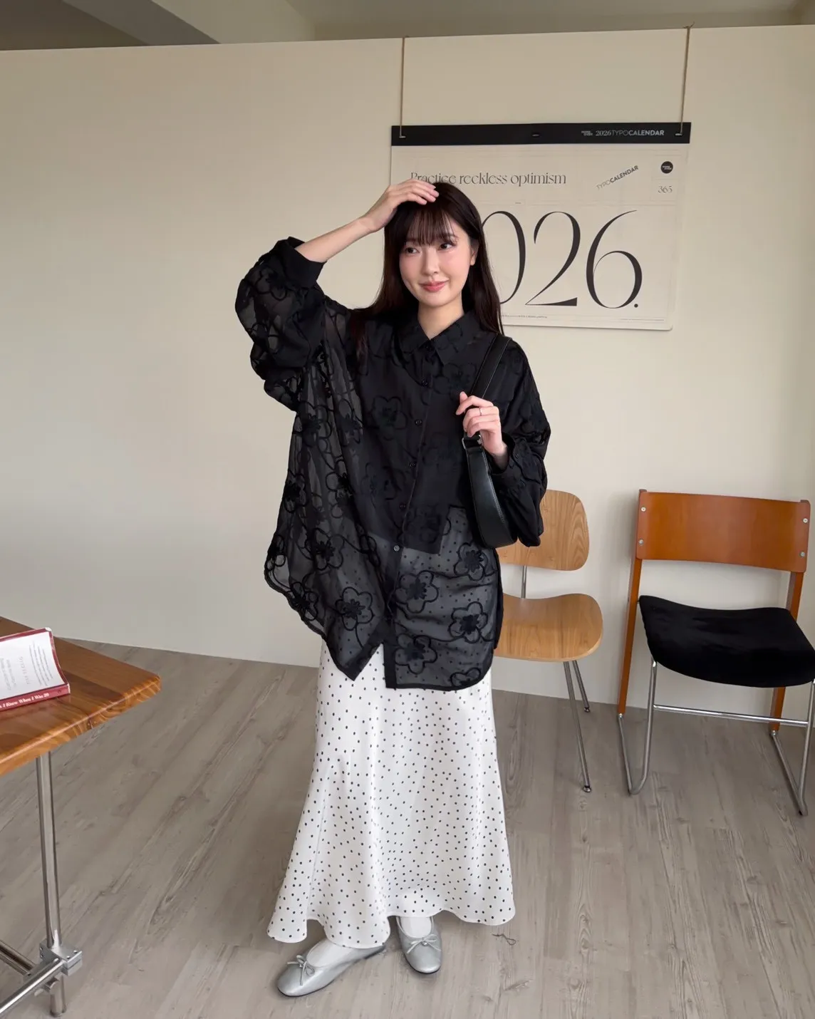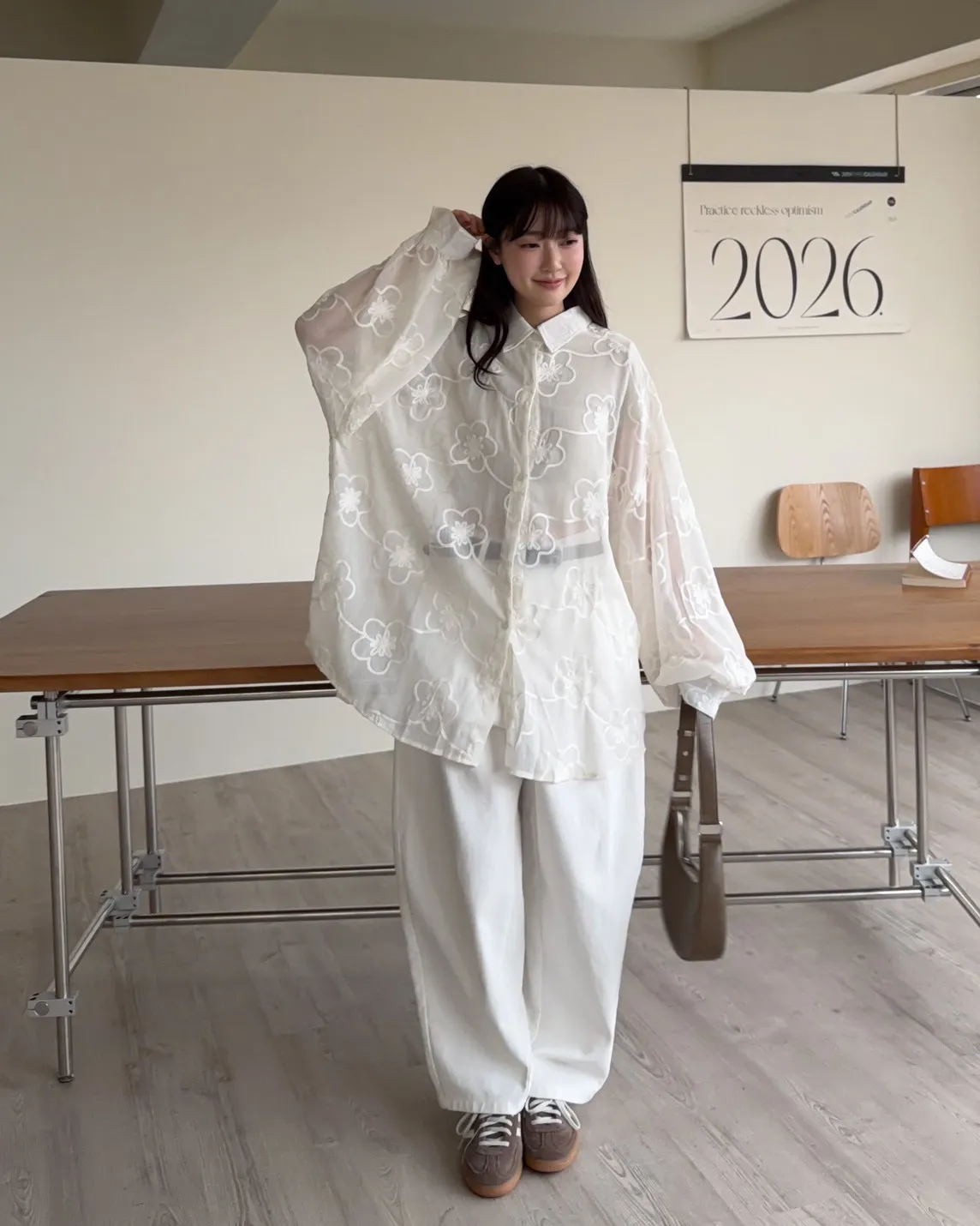 B0010花朵刺繡長版透紗襯衫(米白/黑)