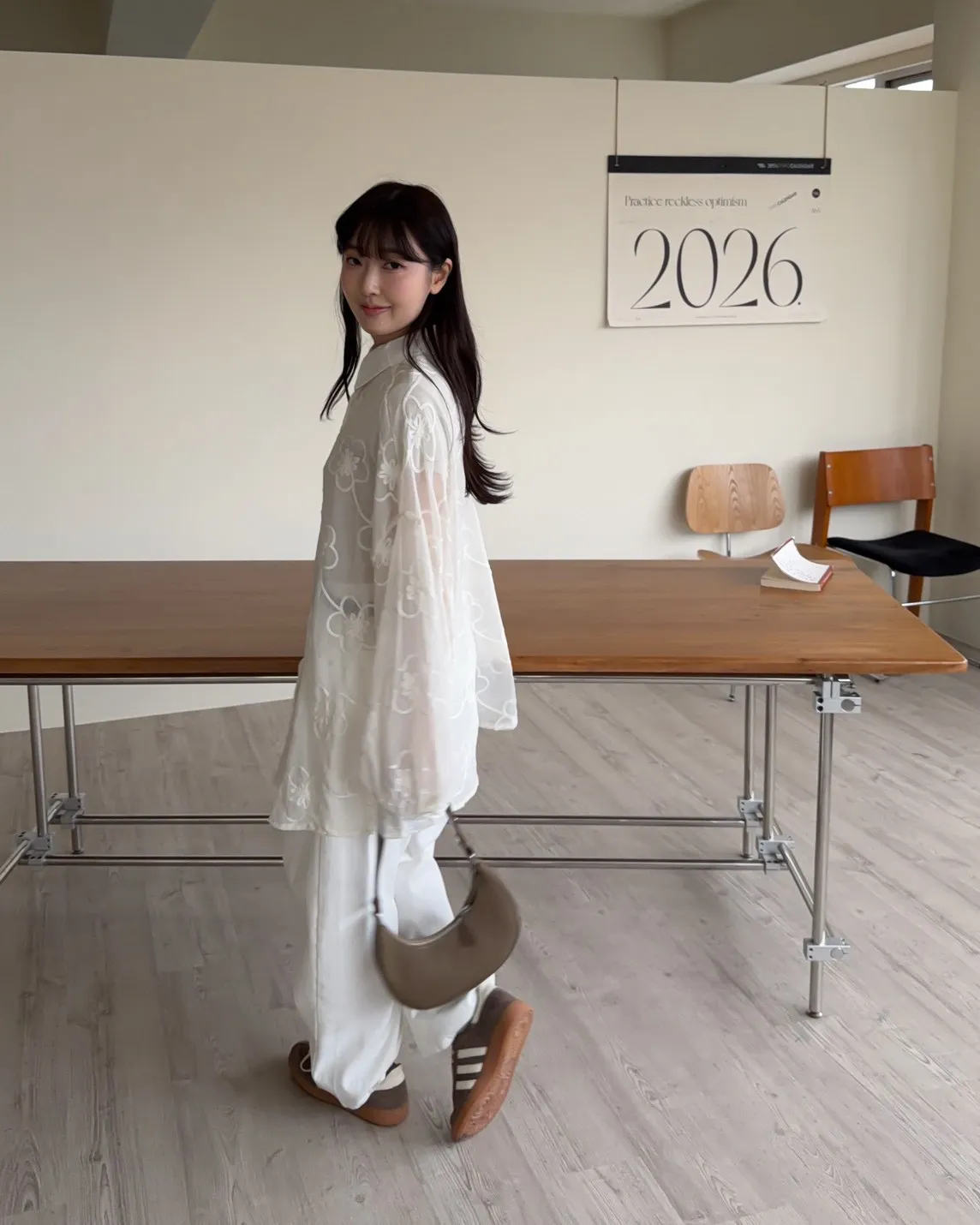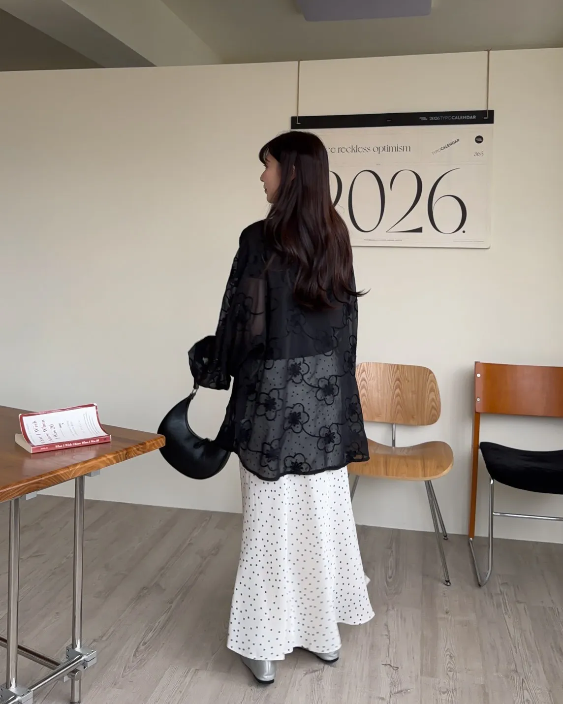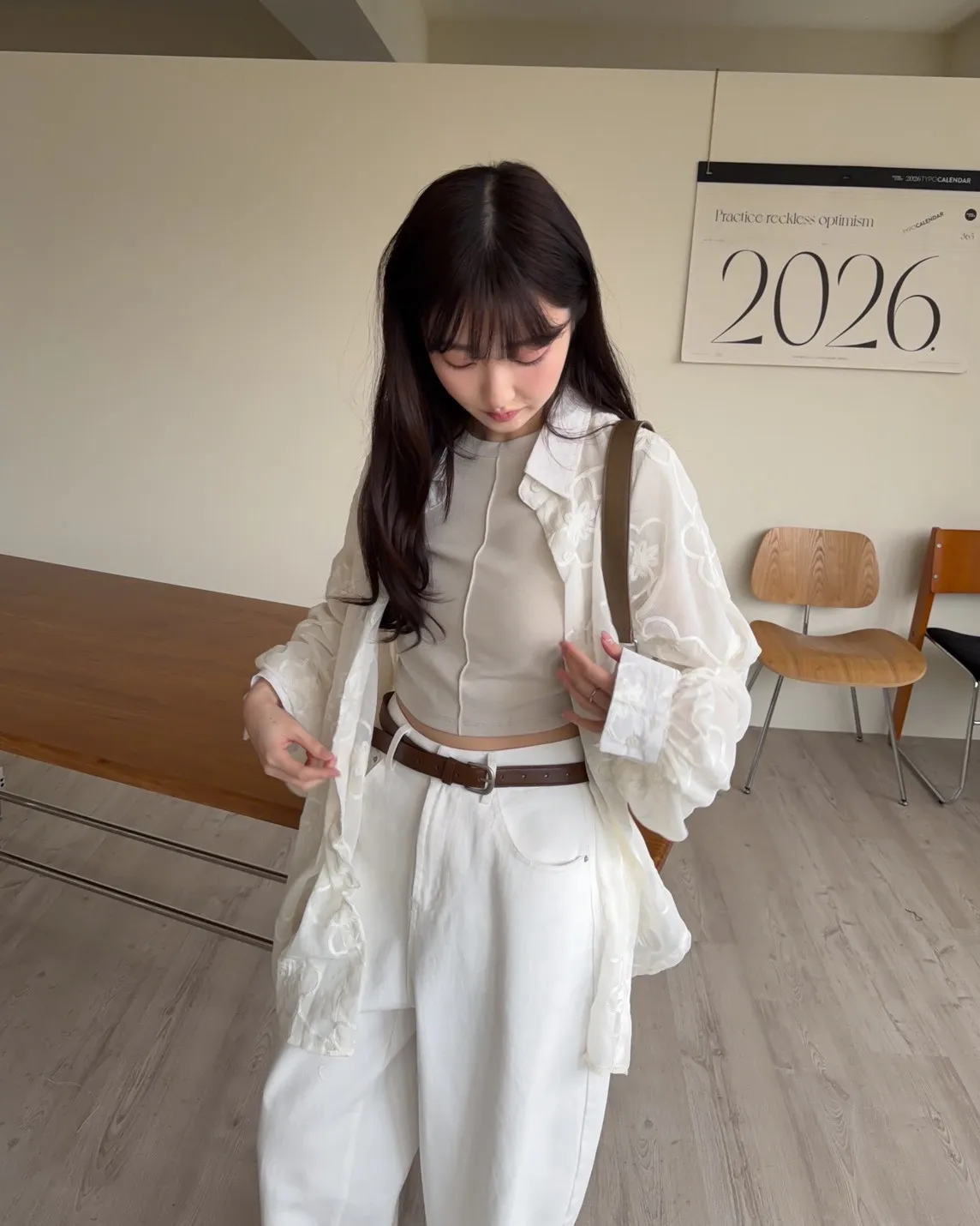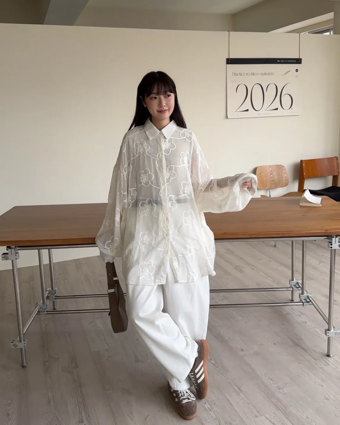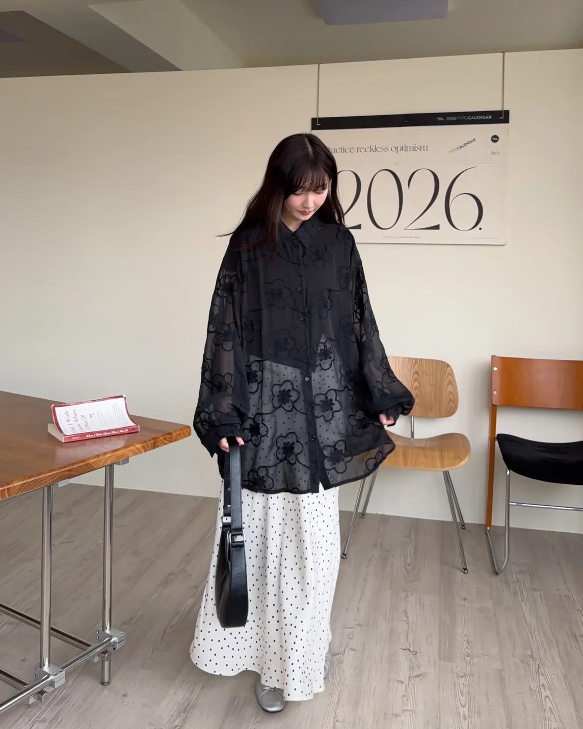B0010花朵刺繡長版透紗襯衫(米白/黑)