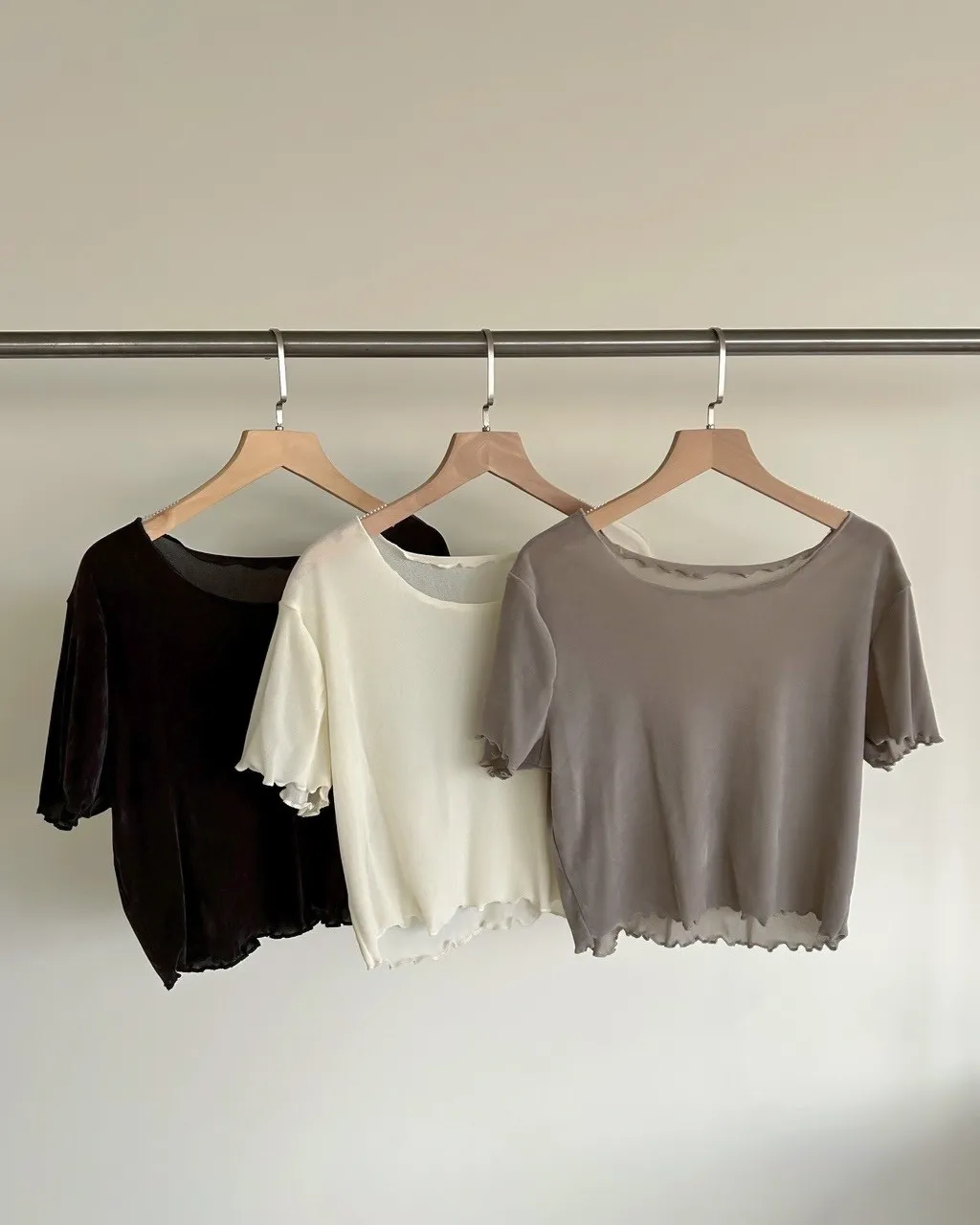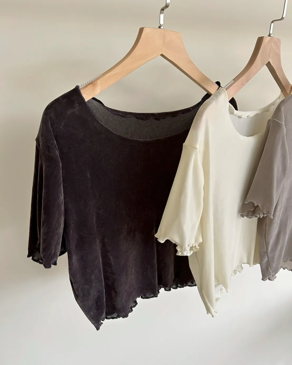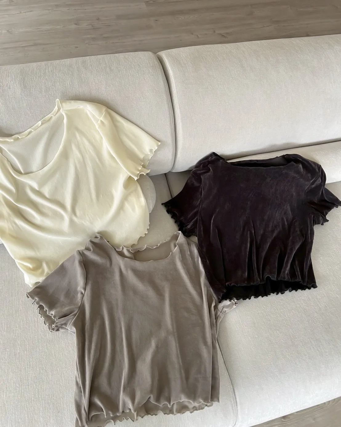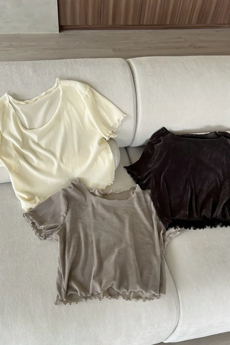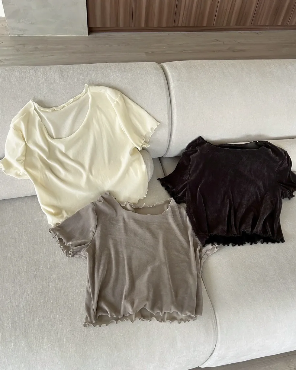 B0024蜜桃絨捲邊微光澤短T(米/奶灰/深灰)