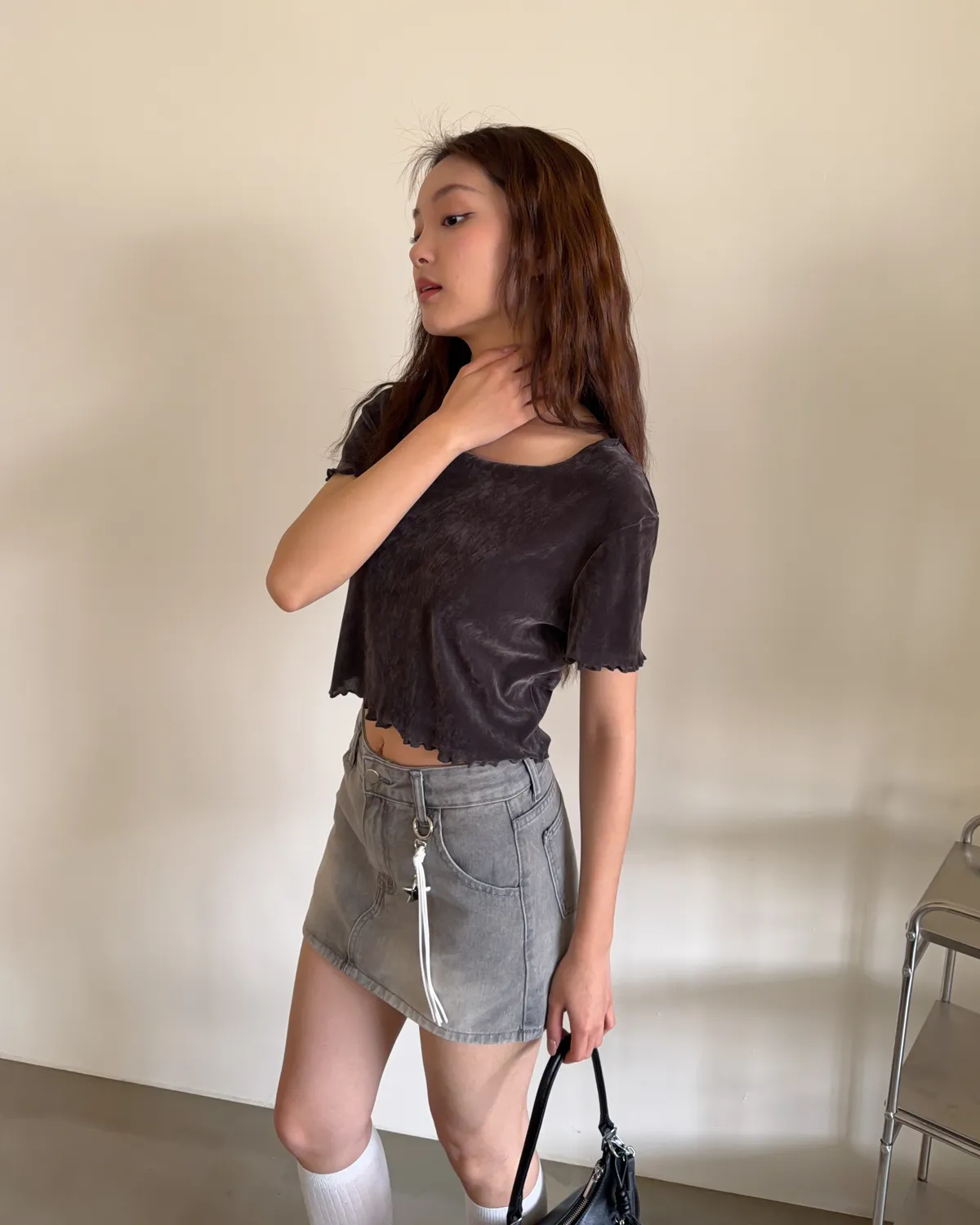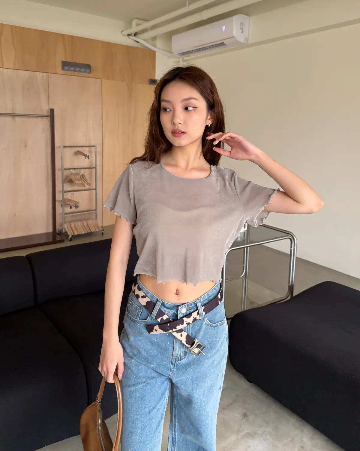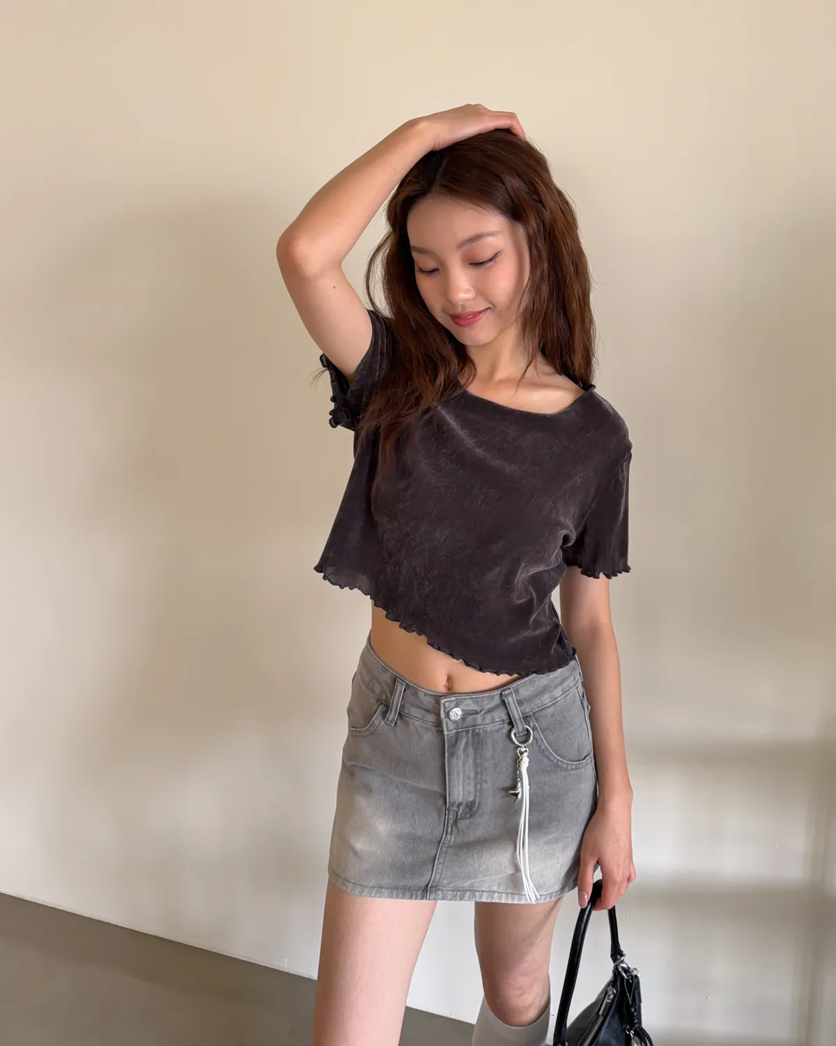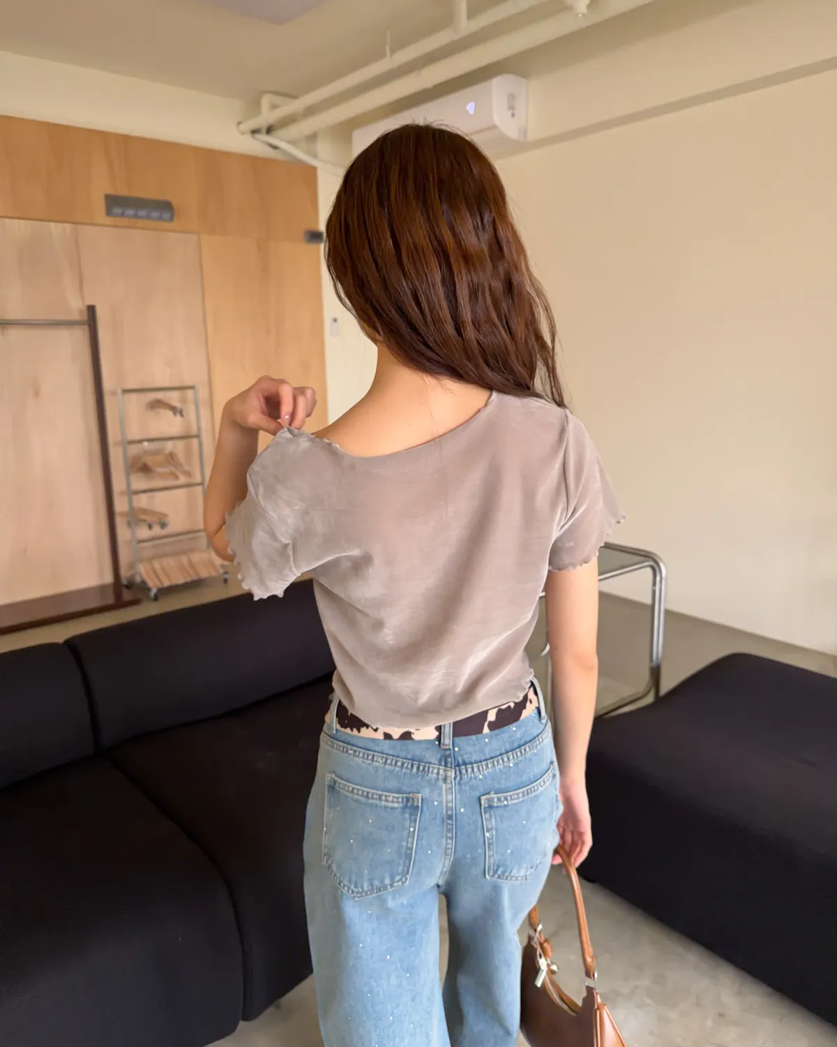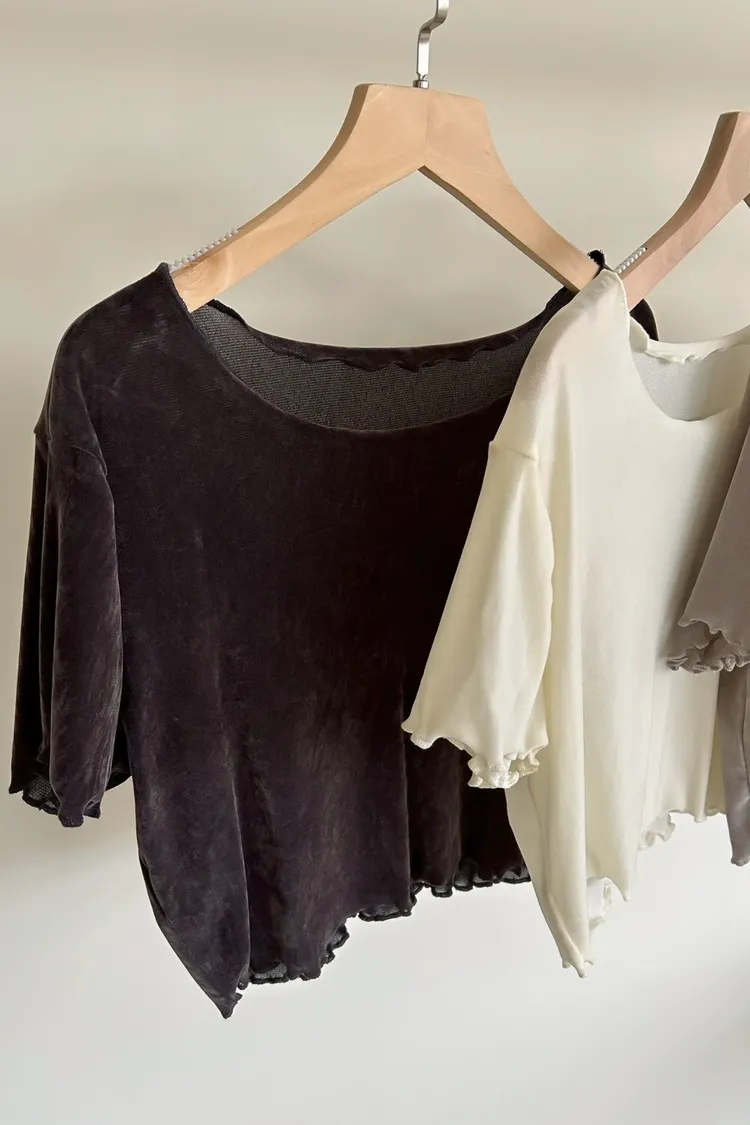 B0024蜜桃絨捲邊微光澤短T(米/奶灰/深灰)