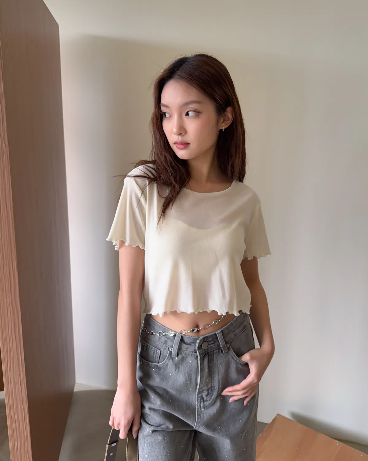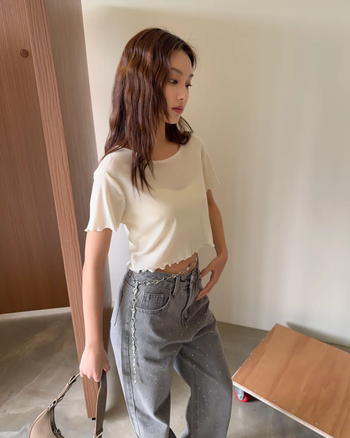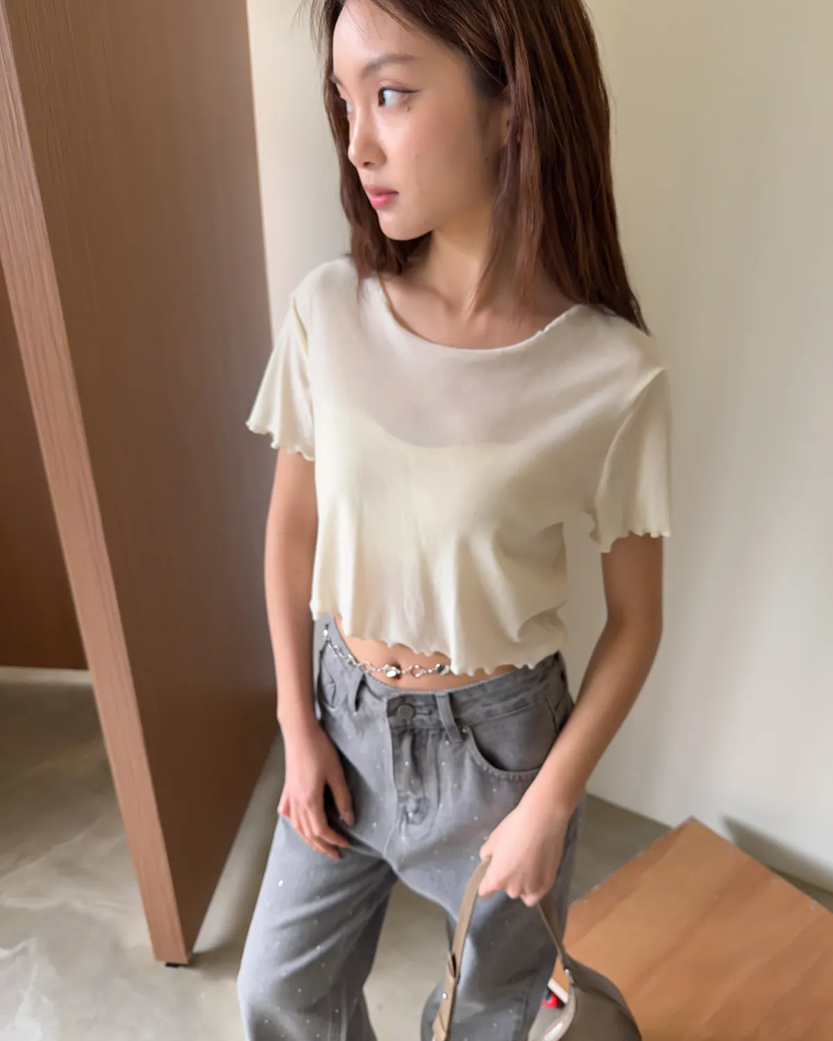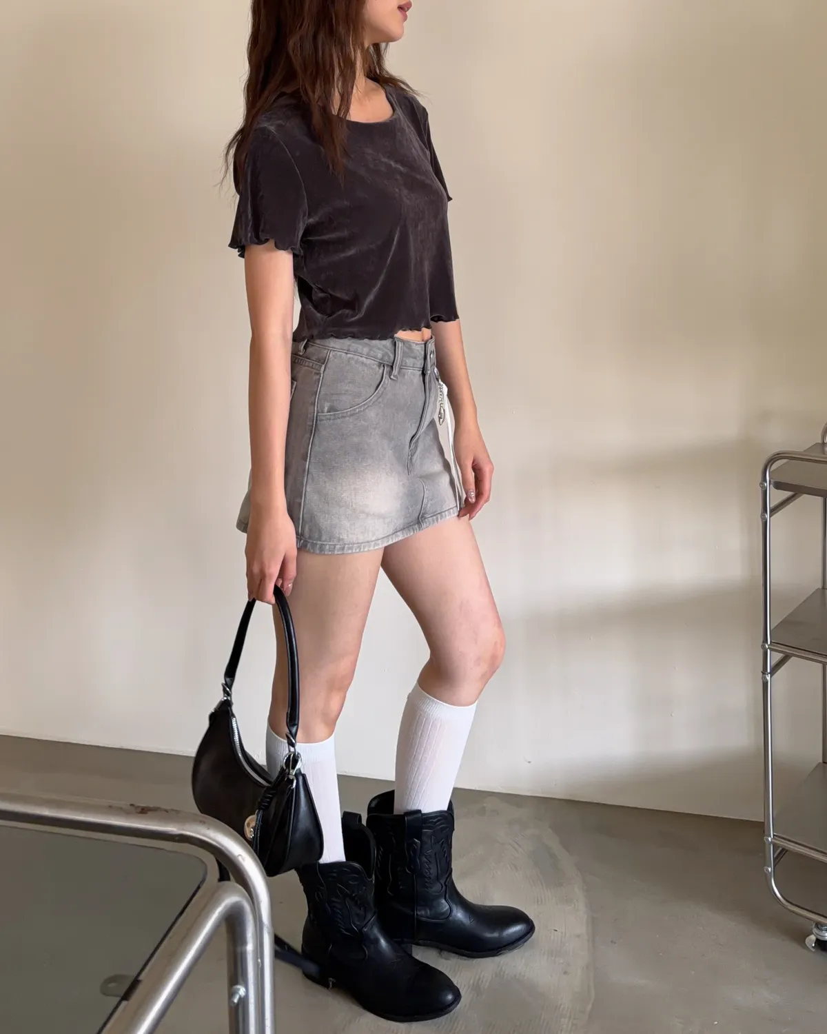 B0024蜜桃絨捲邊微光澤短T(米/奶灰/深灰)