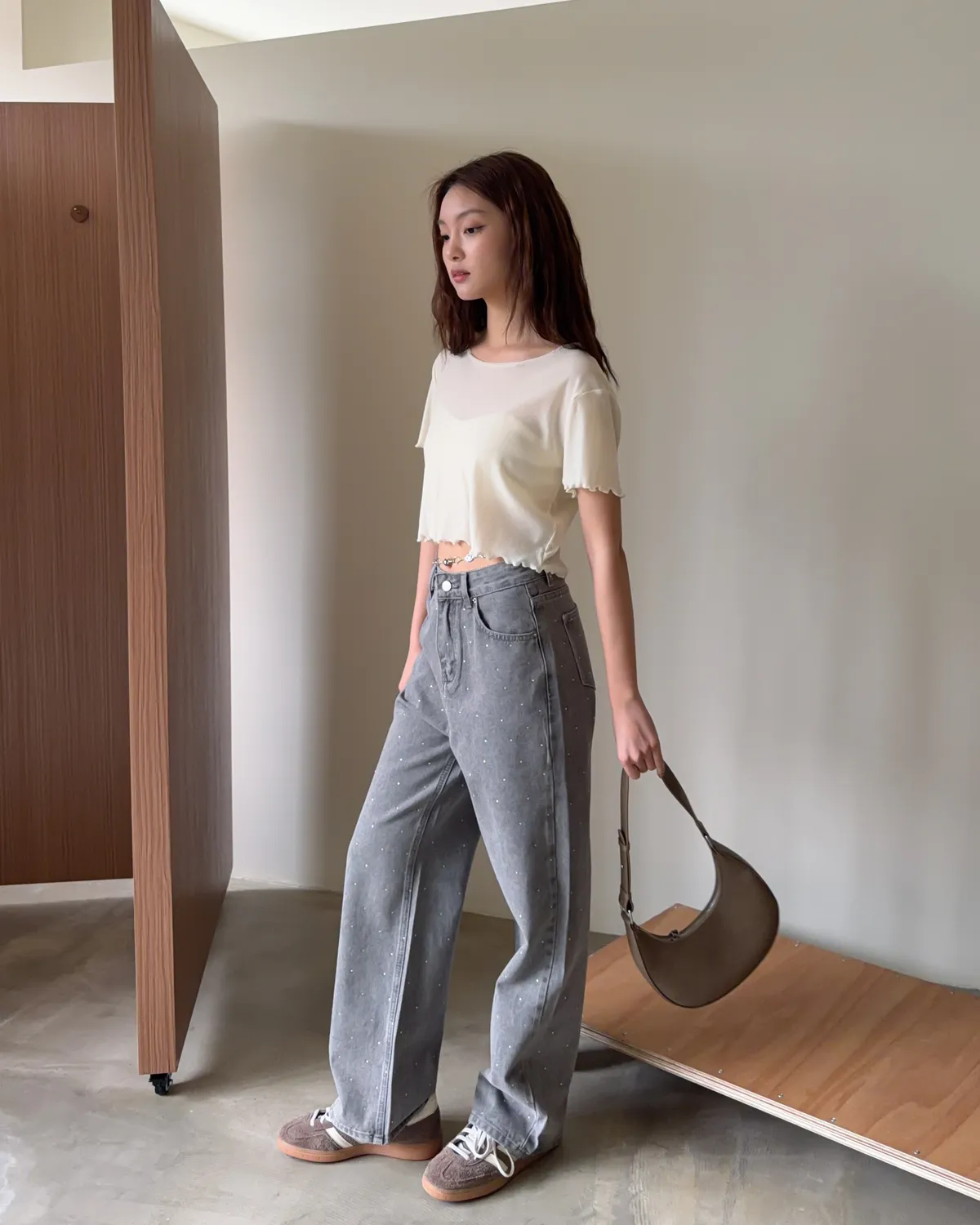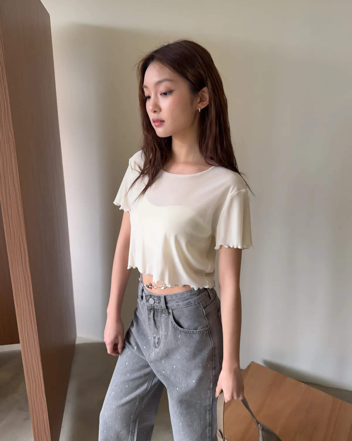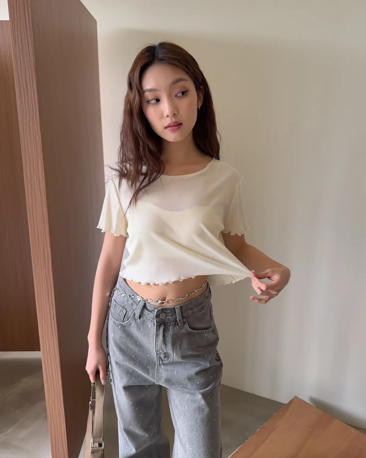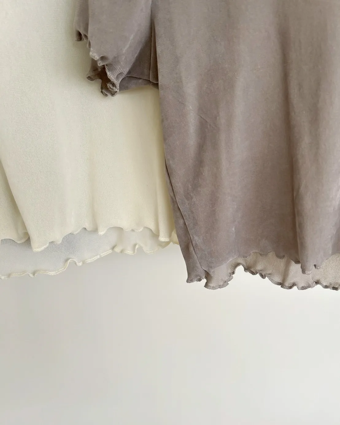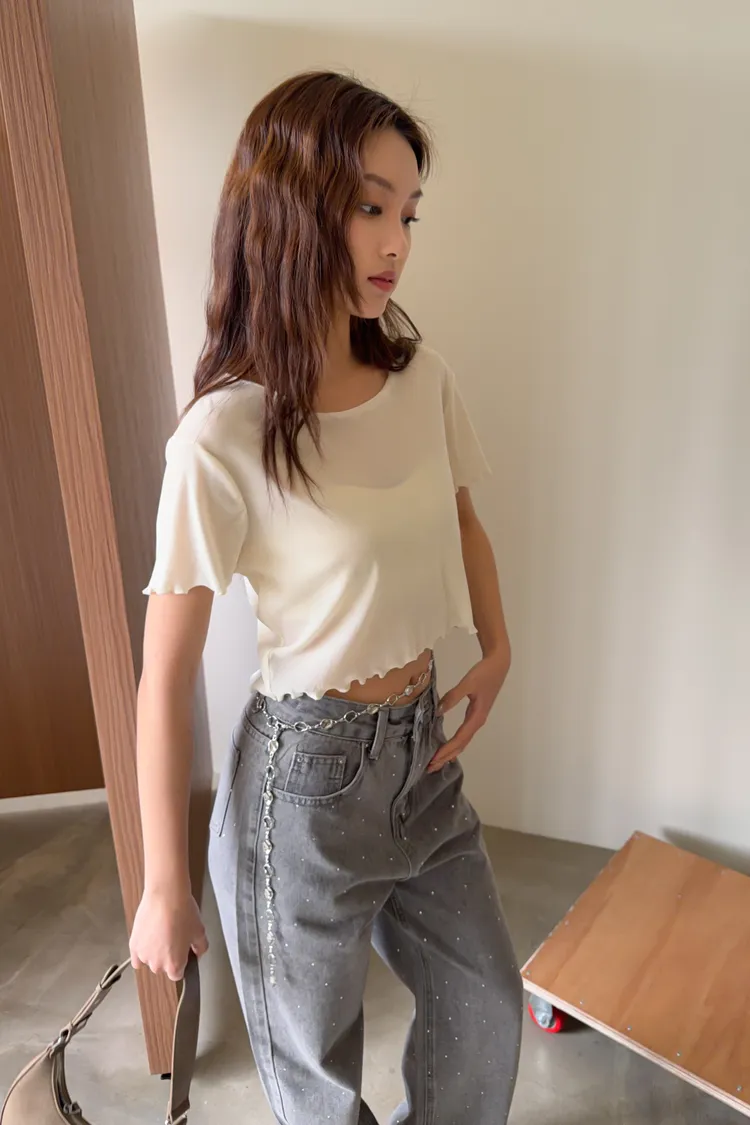 B0024蜜桃絨捲邊微光澤短T(米/奶灰/深灰)