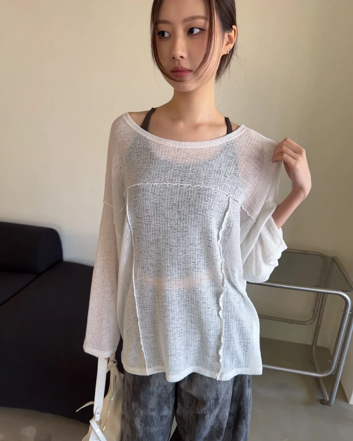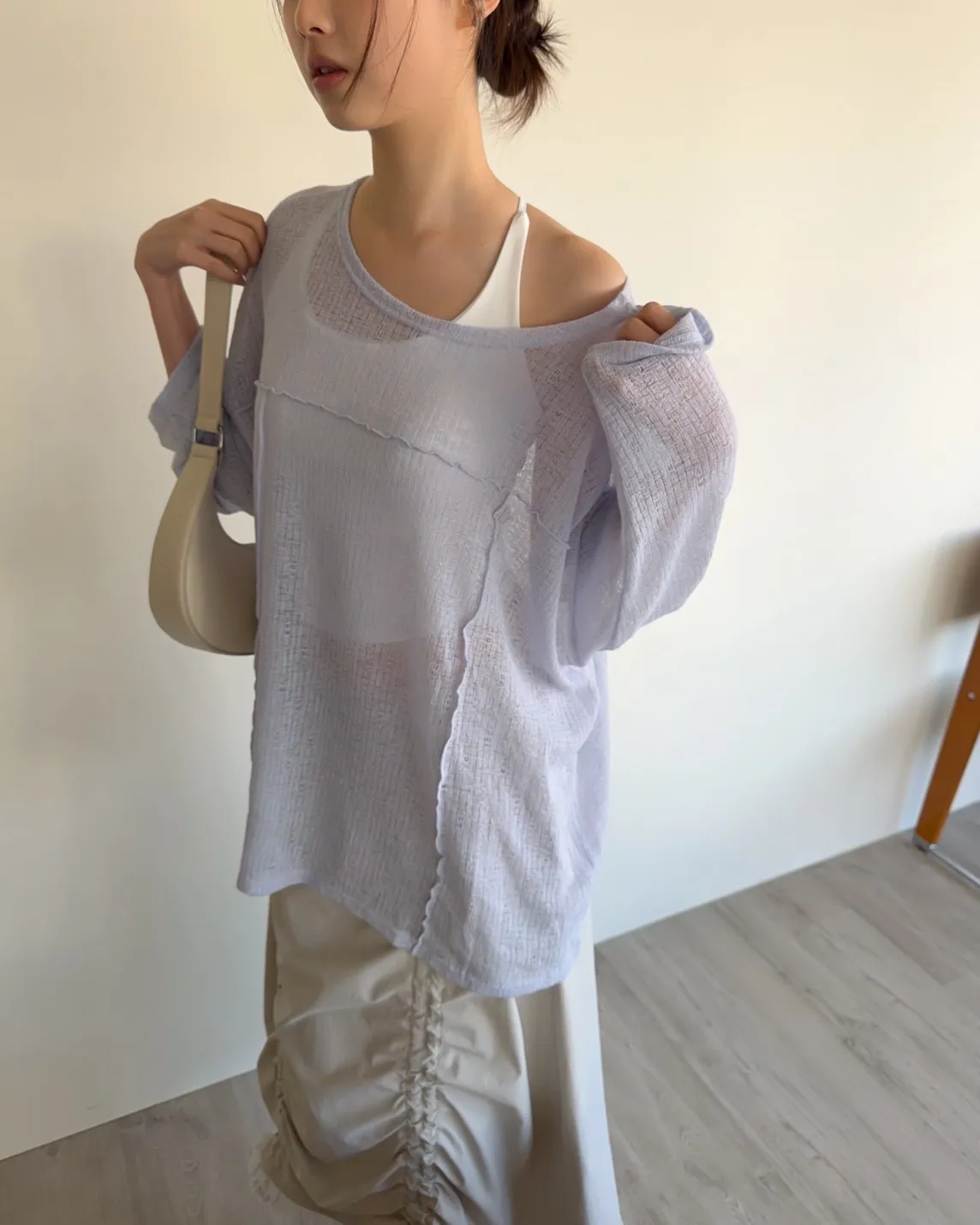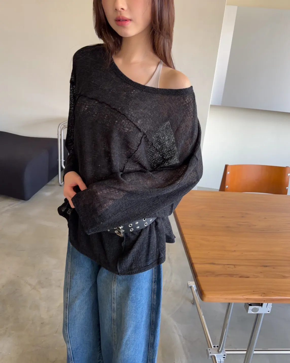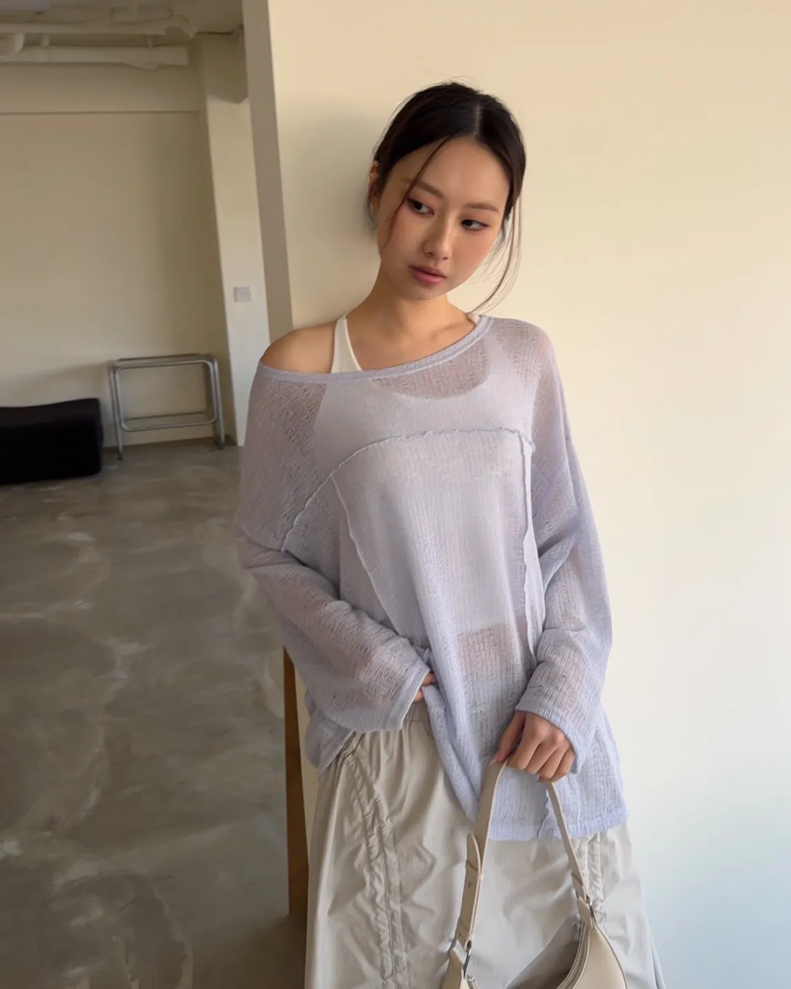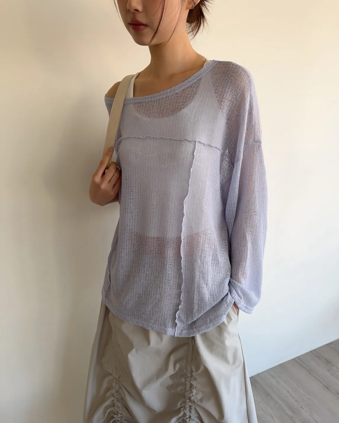 彈性領口 可以斜肩/一字領 薄透針織 立體QQ車線 寬鬆落肩