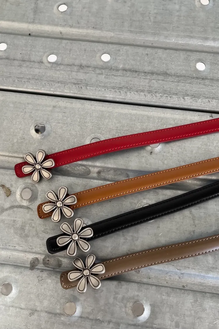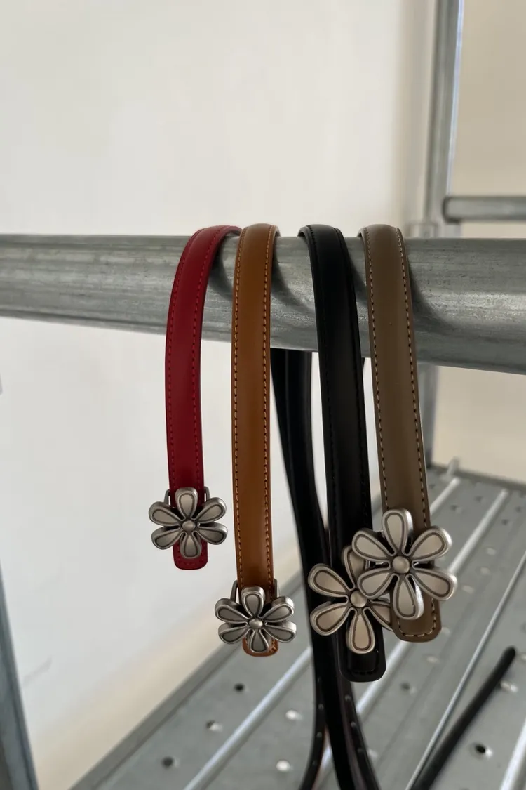 U0074復古金屬花朵扣細皮帶(焦糖/咖啡/紅/黑)