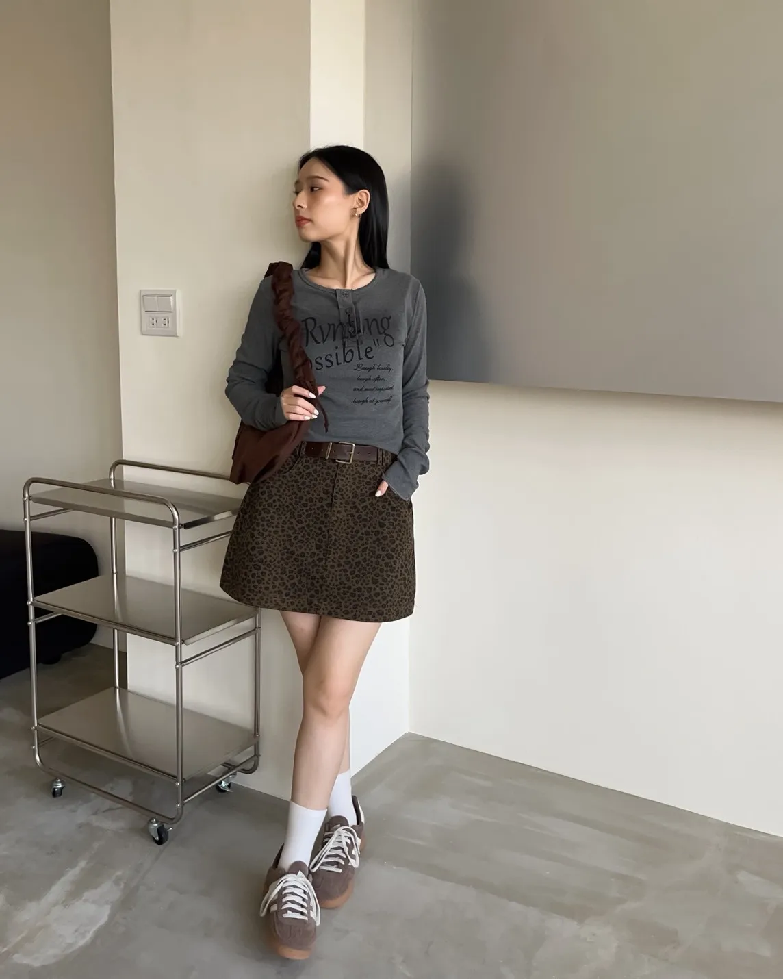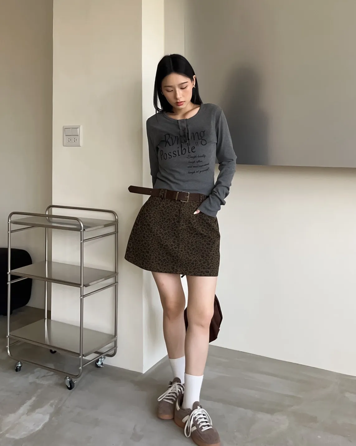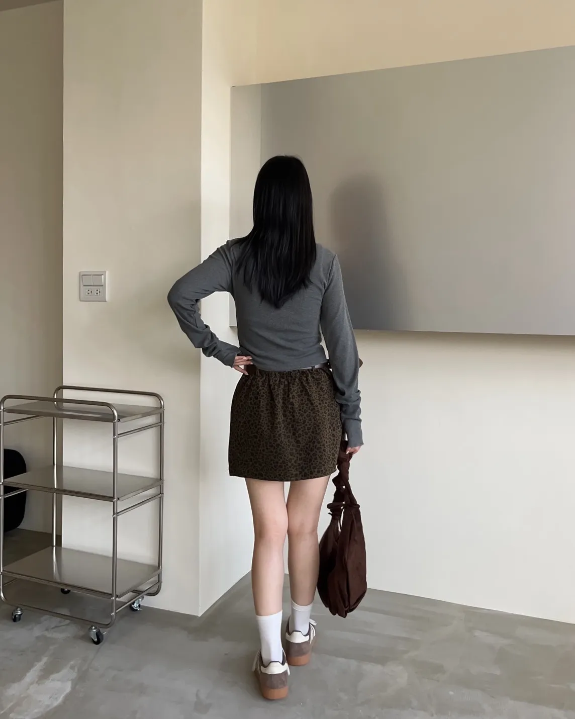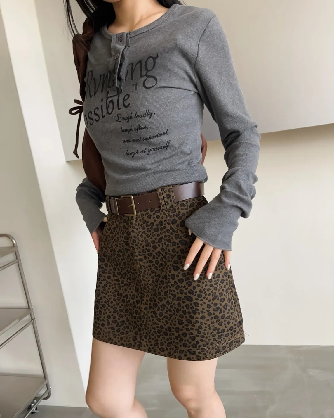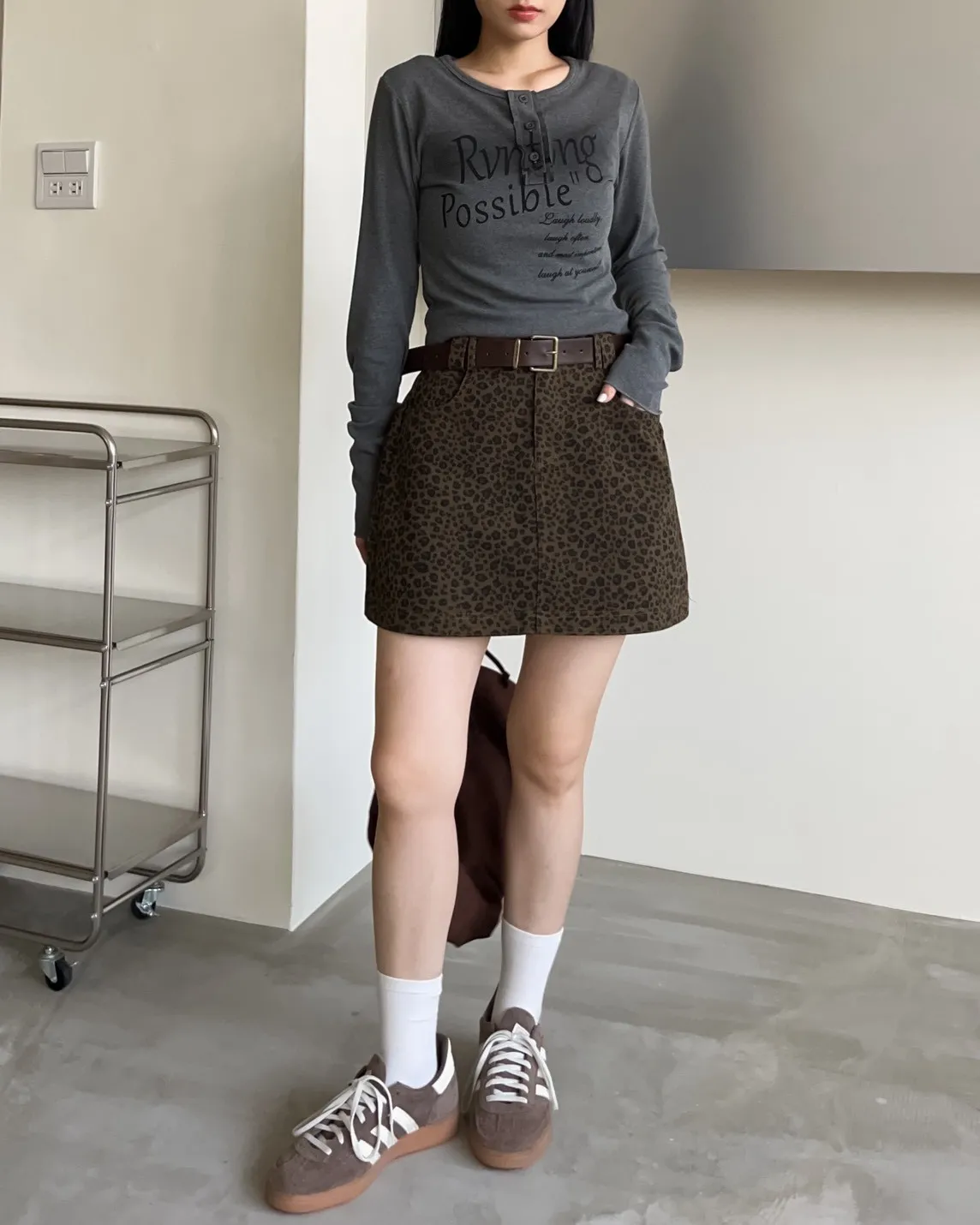 V0053(附皮帶)復古の豹紋短裙(灰/咖啡)