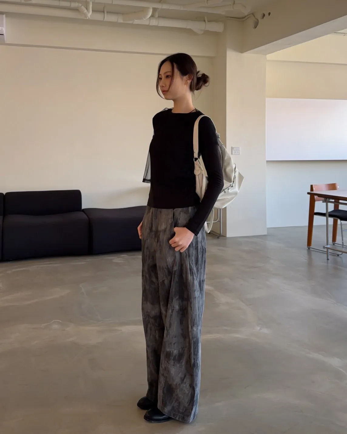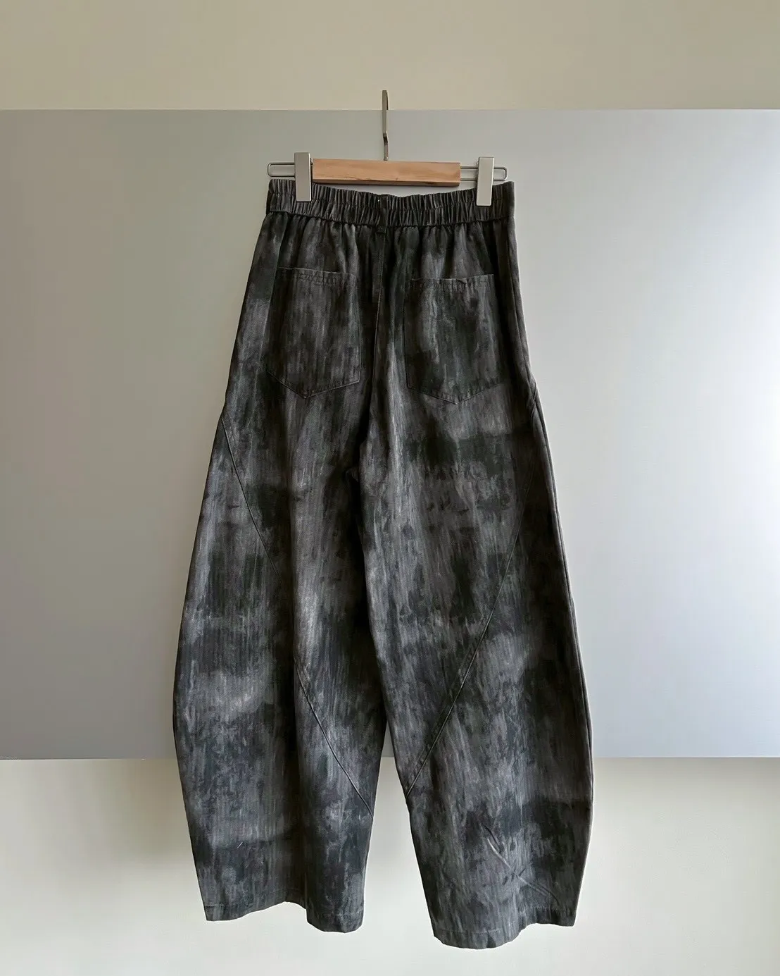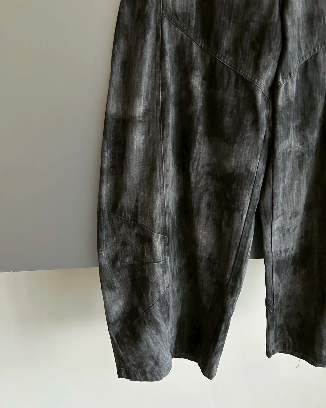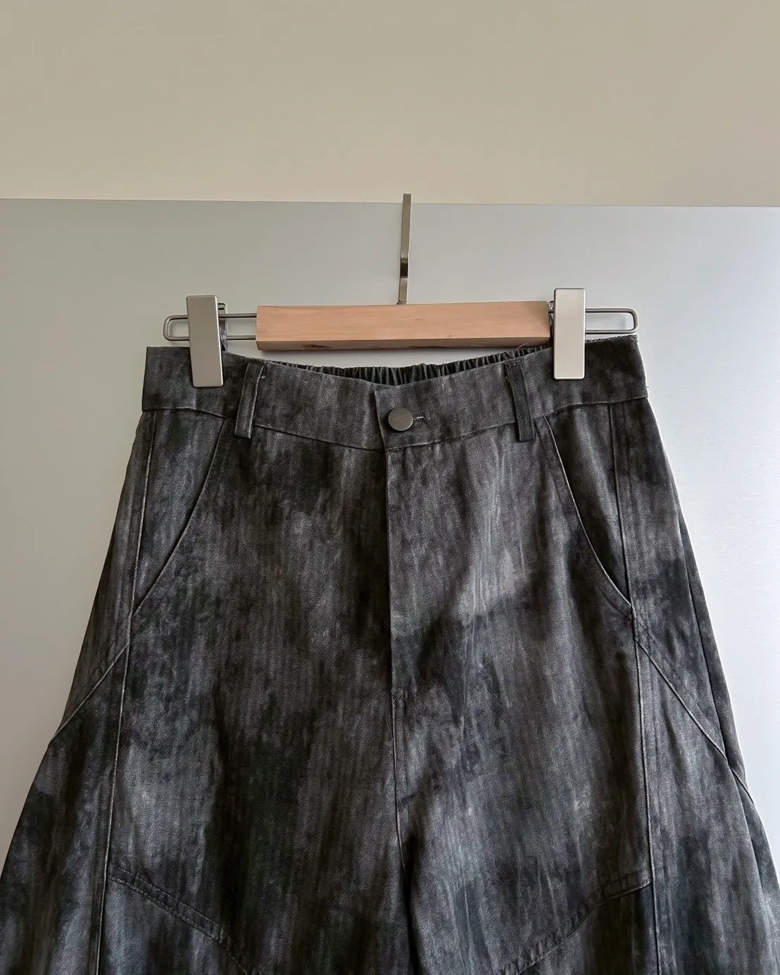 後鬆緊 建議尺寸S-小L 兩側口袋 粉刷感墨彩暈染 車線設計 彎刀版型 布料本身無彈性