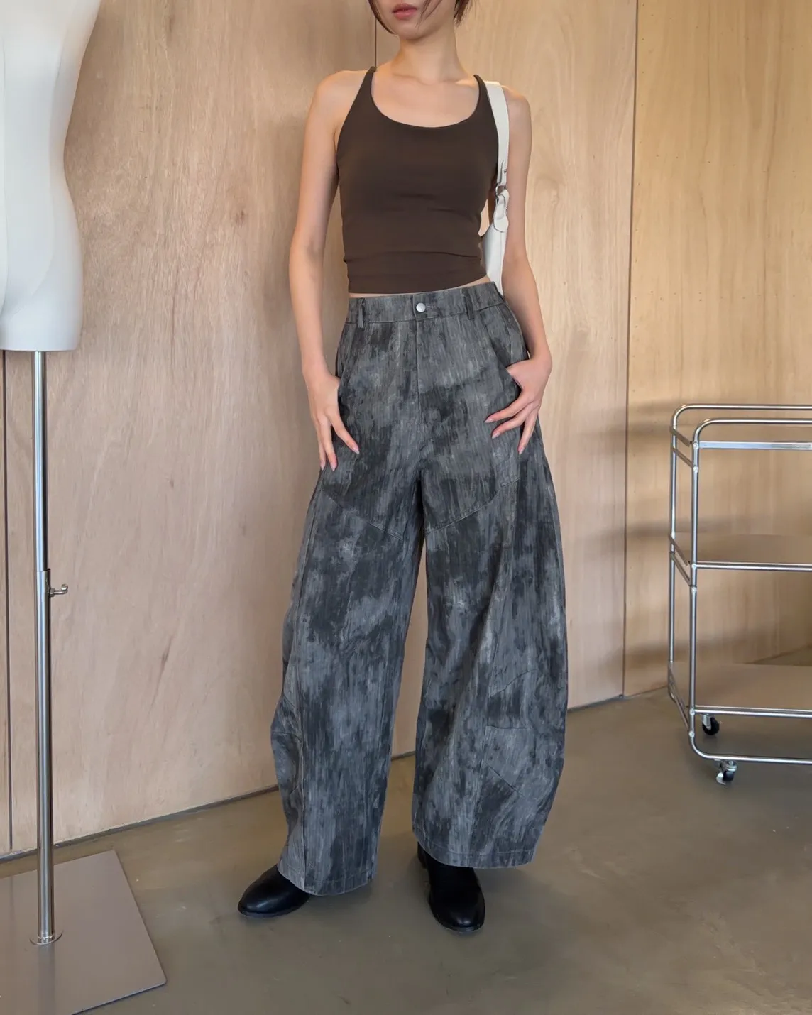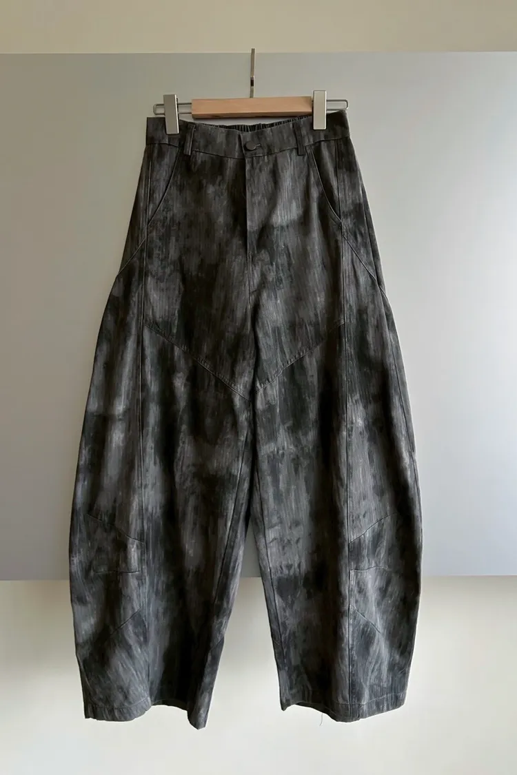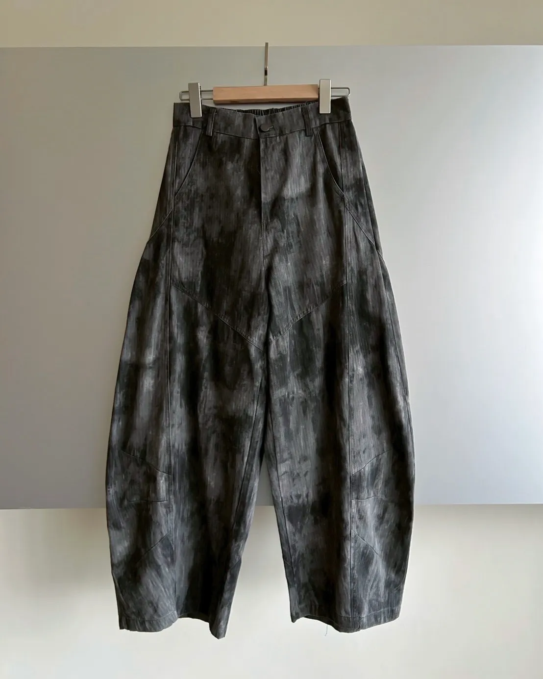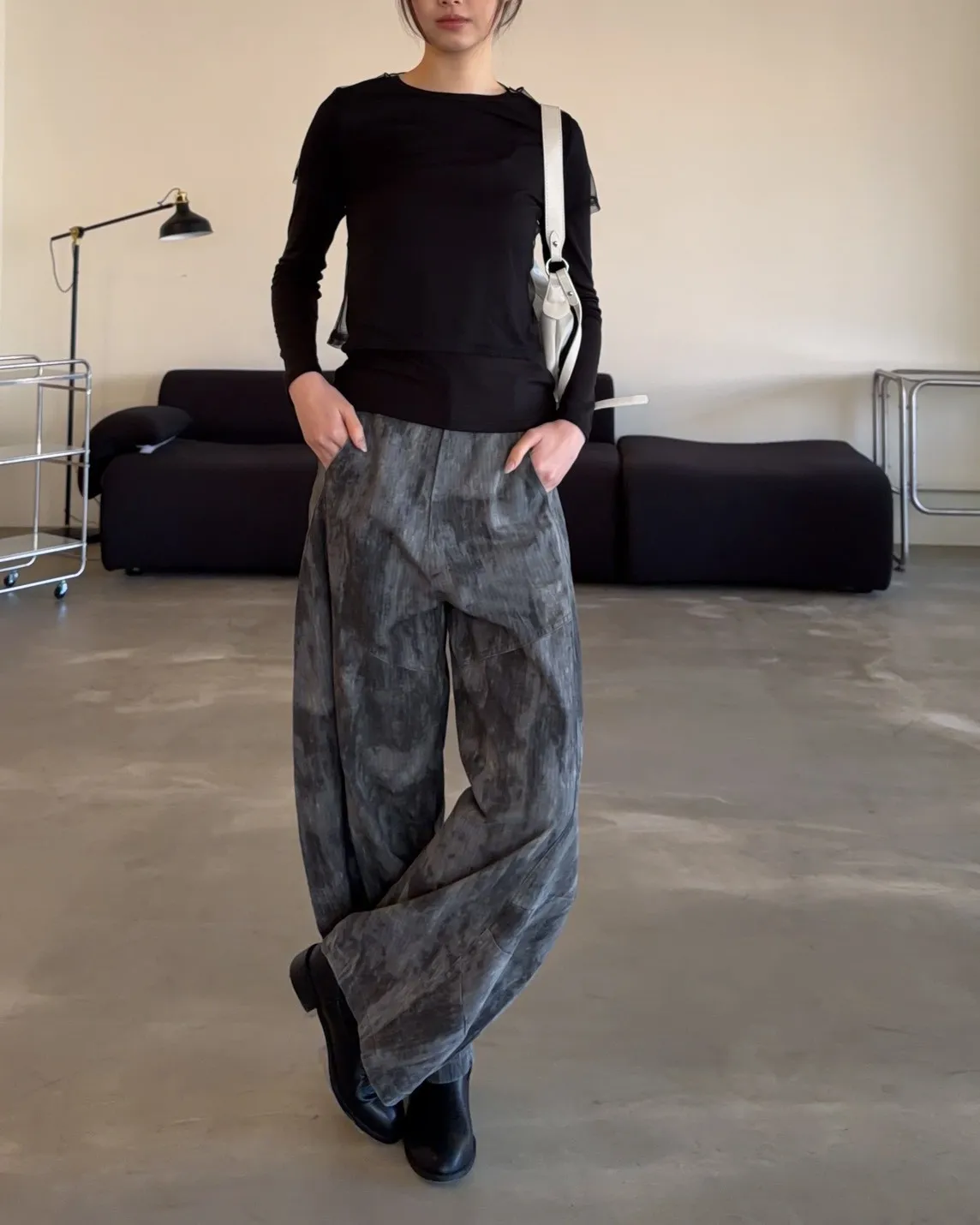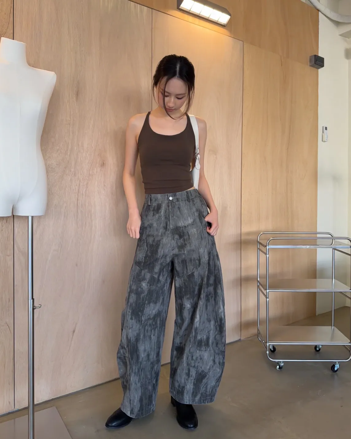後鬆緊 建議尺寸S-小L 兩側口袋 粉刷感墨彩暈染 車線設計 彎刀版型 布料本身無彈性