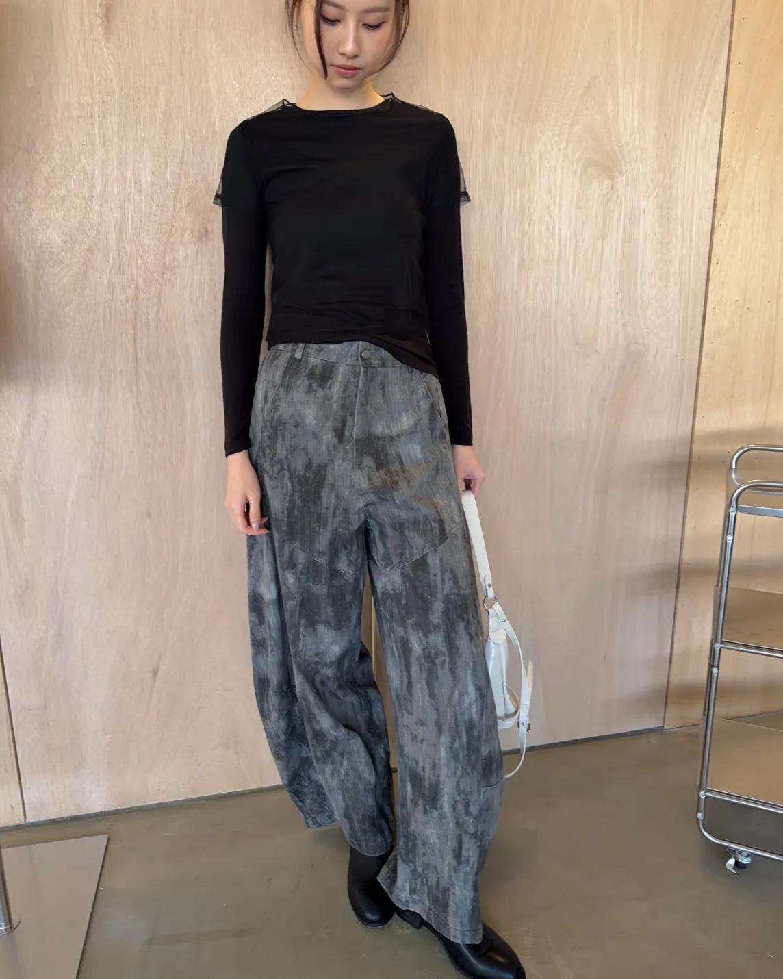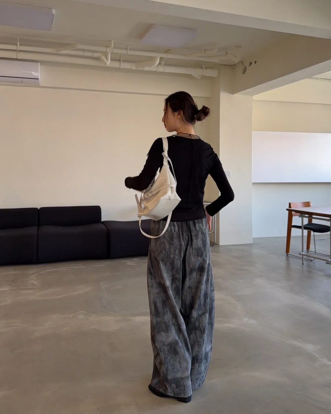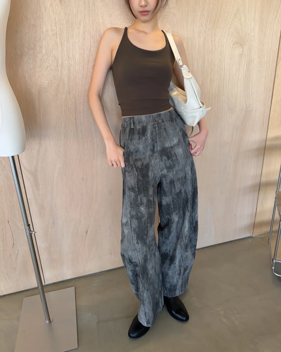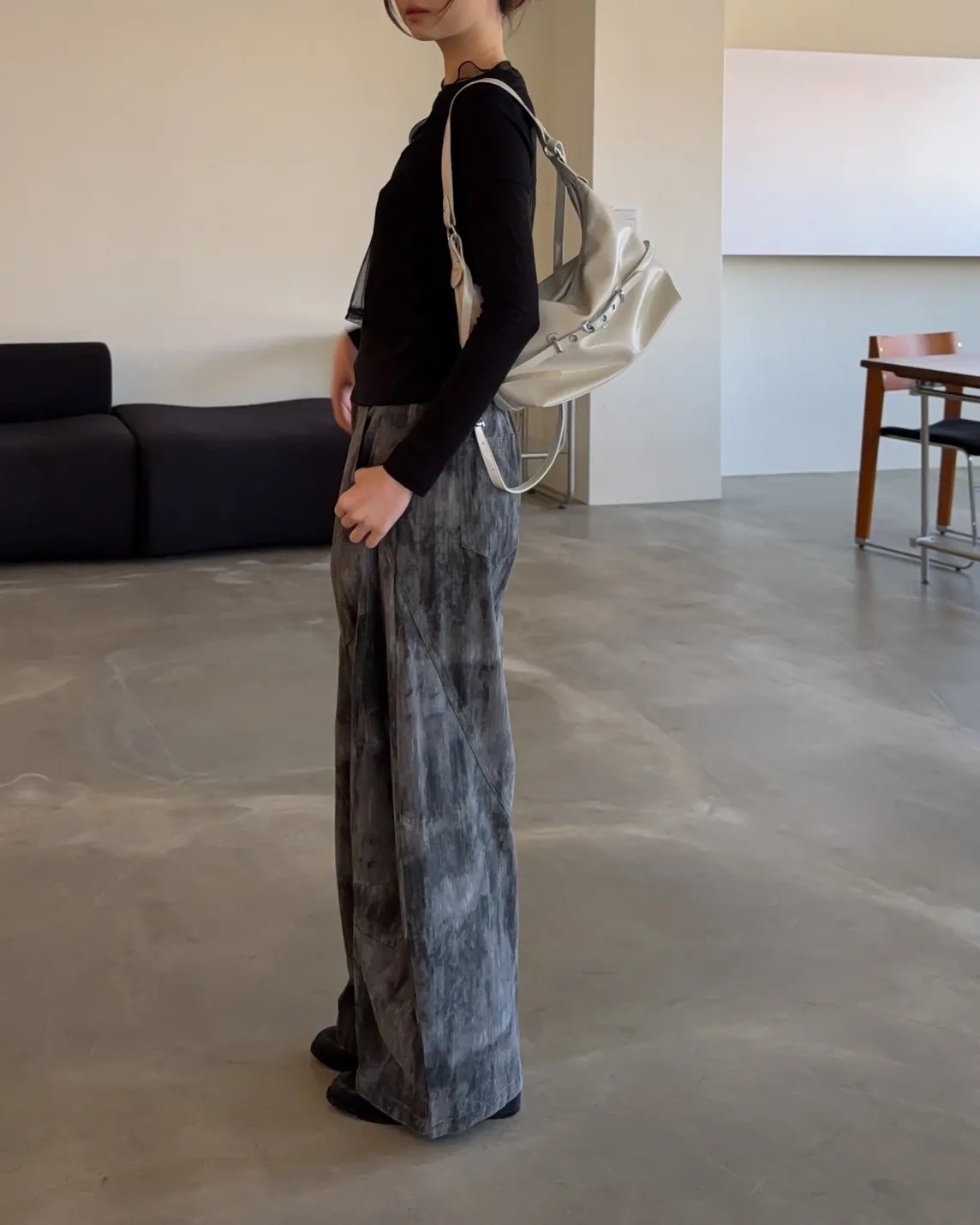 後鬆緊 建議尺寸S-小L 兩側口袋 粉刷感墨彩暈染 車線設計 彎刀版型 布料本身無彈性