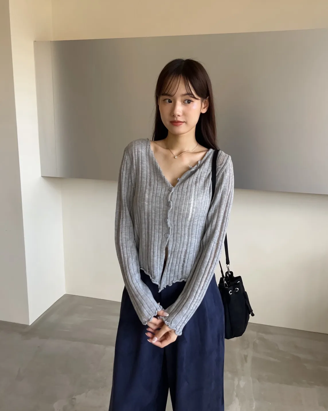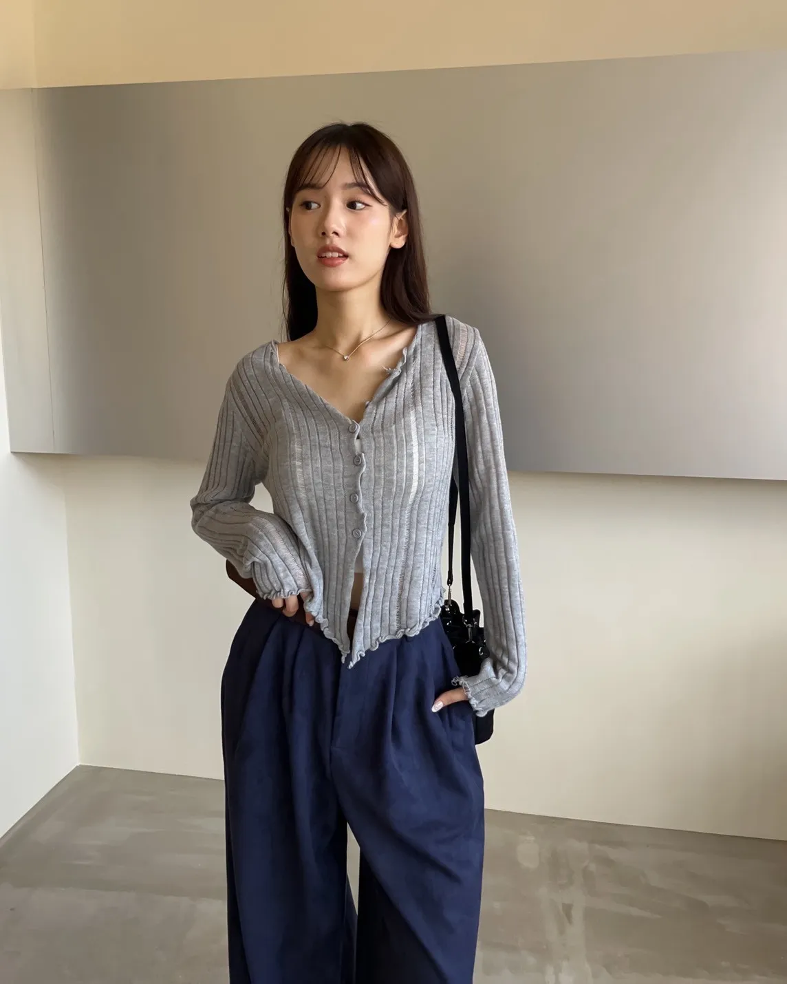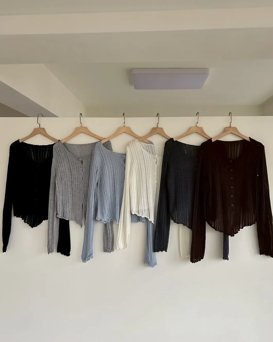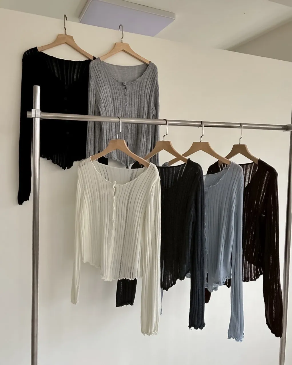 V0065(六色)鏤空排釦捲邊薄針衣(米/咖啡/藍/淺灰/深灰/黑)