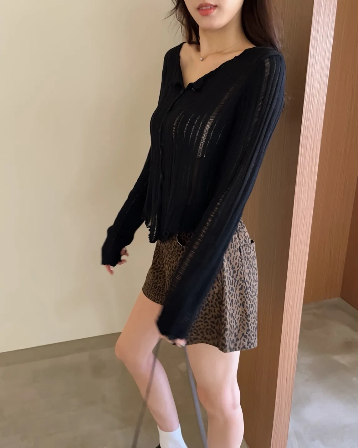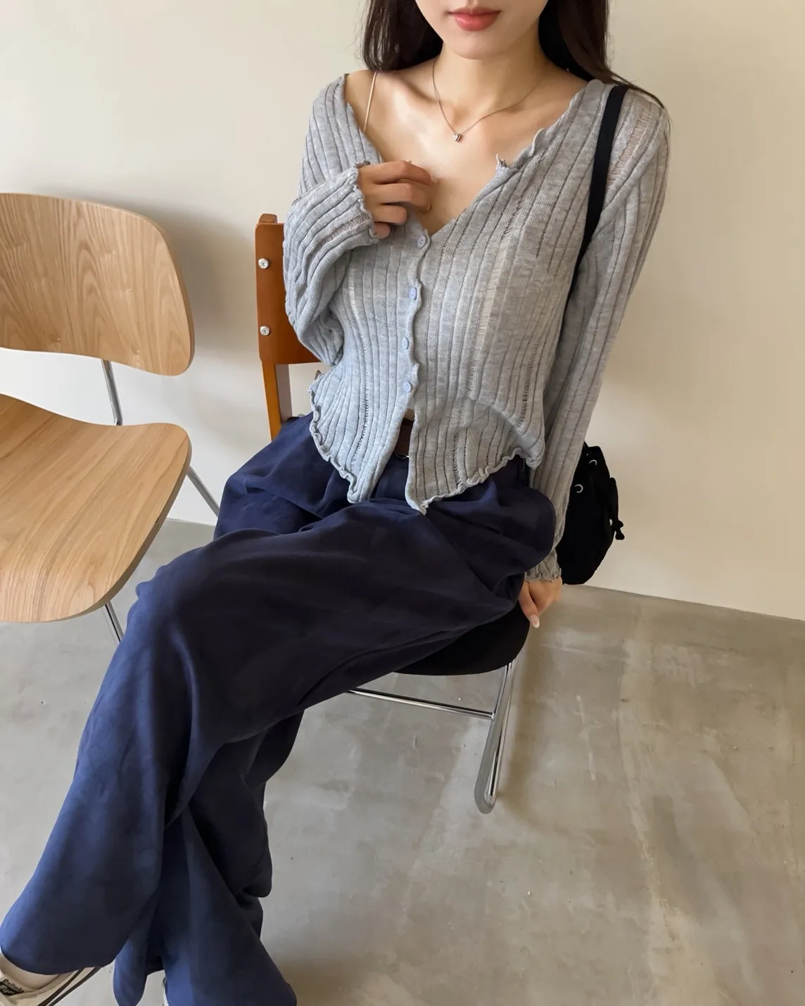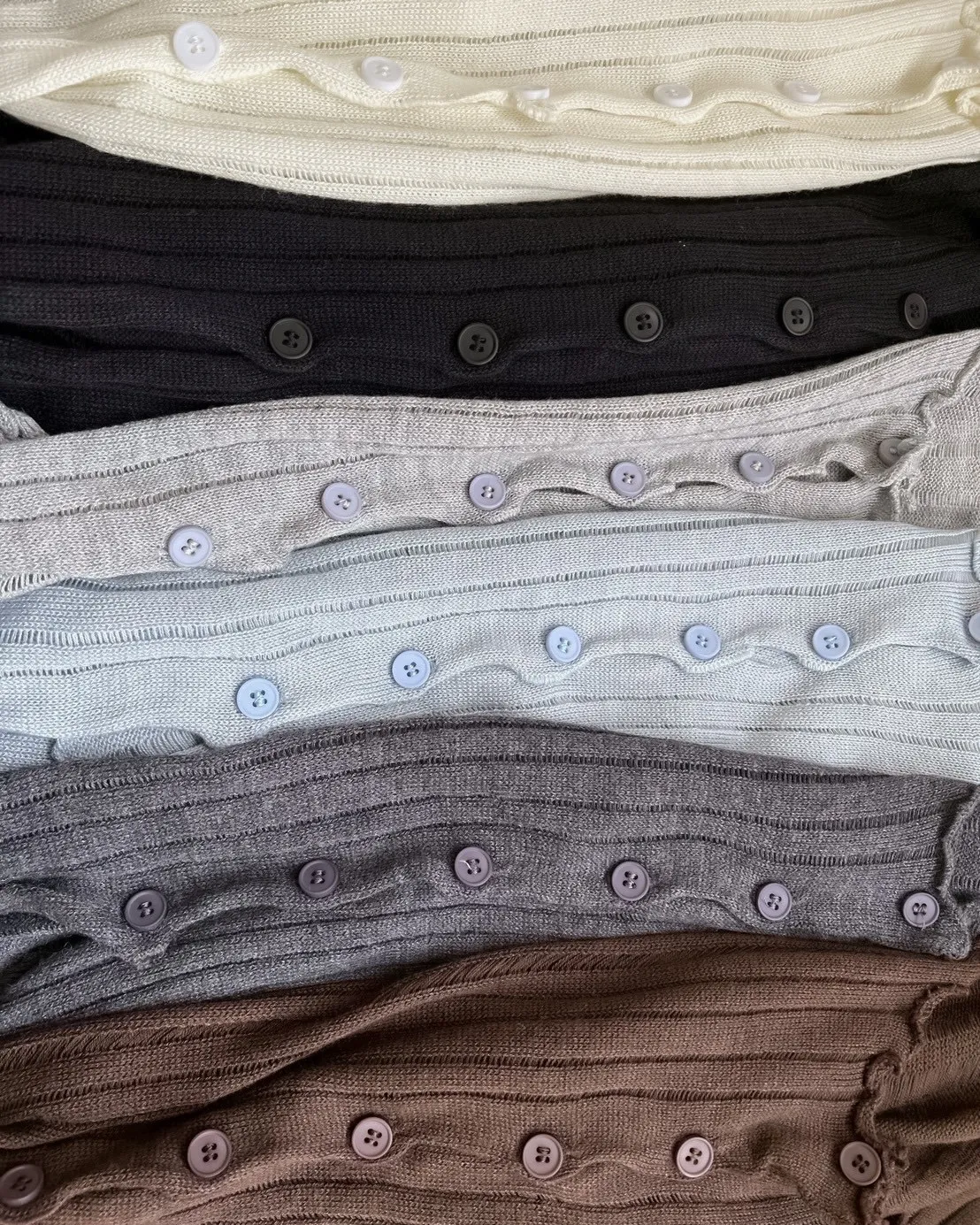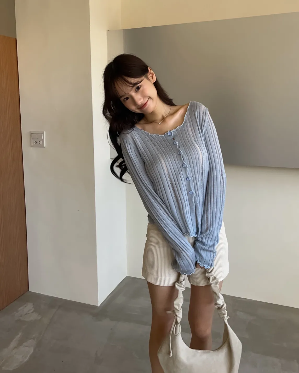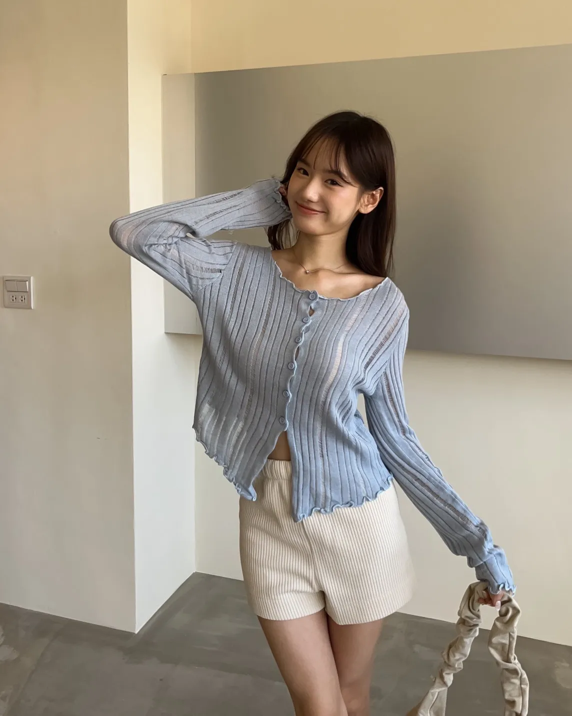 V0065(六色)鏤空排釦捲邊薄針衣(米/咖啡/藍/淺灰/深灰/黑)