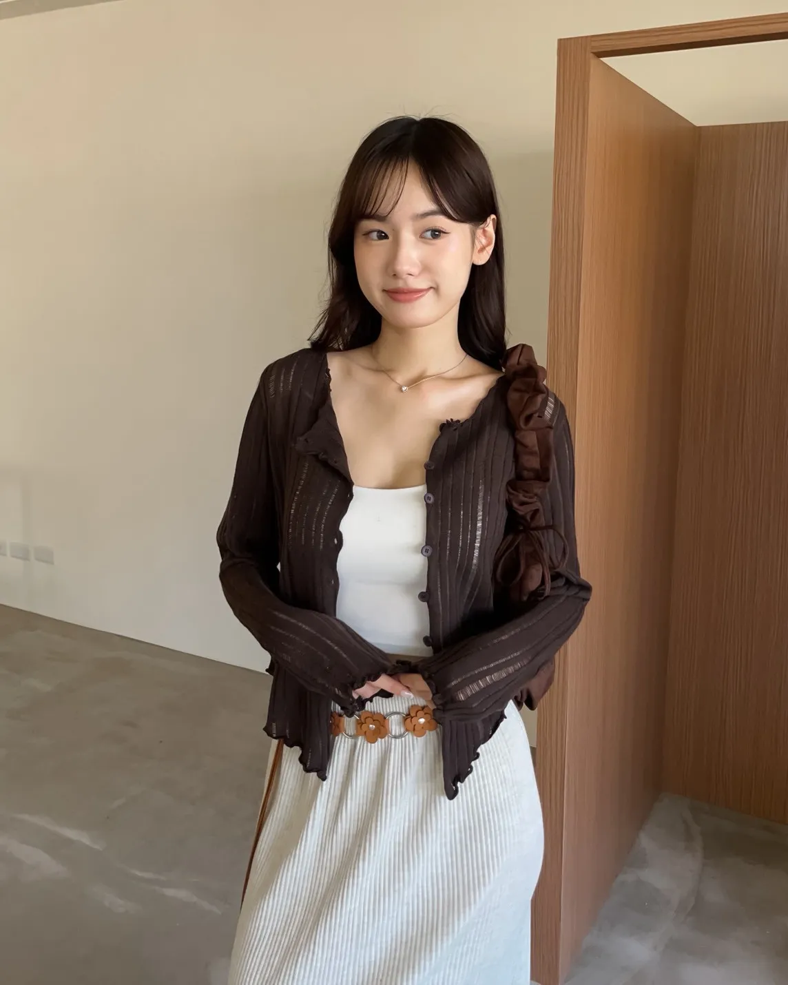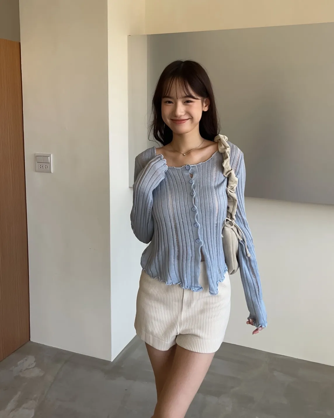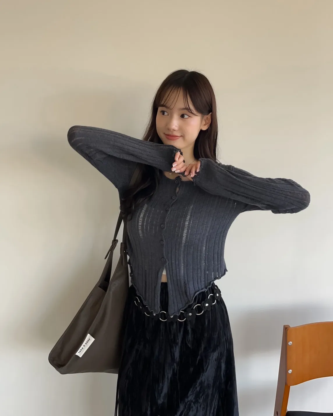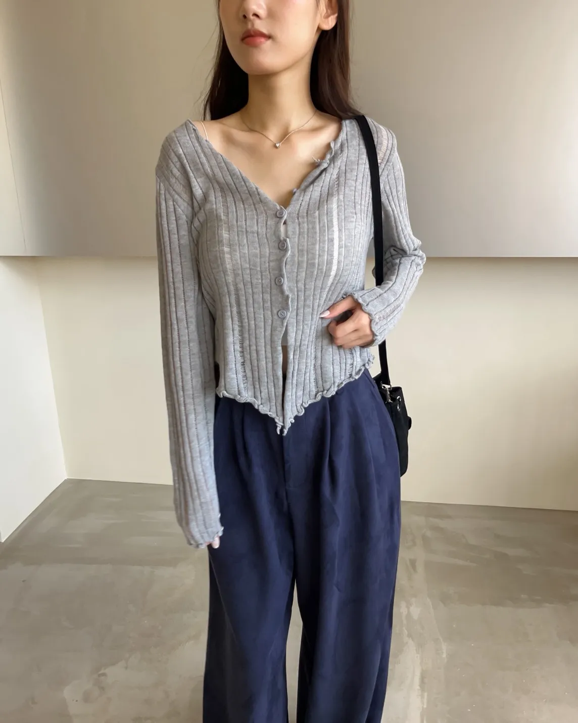V0065(六色)鏤空排釦捲邊薄針衣(米/咖啡/藍/淺灰/深灰/黑)