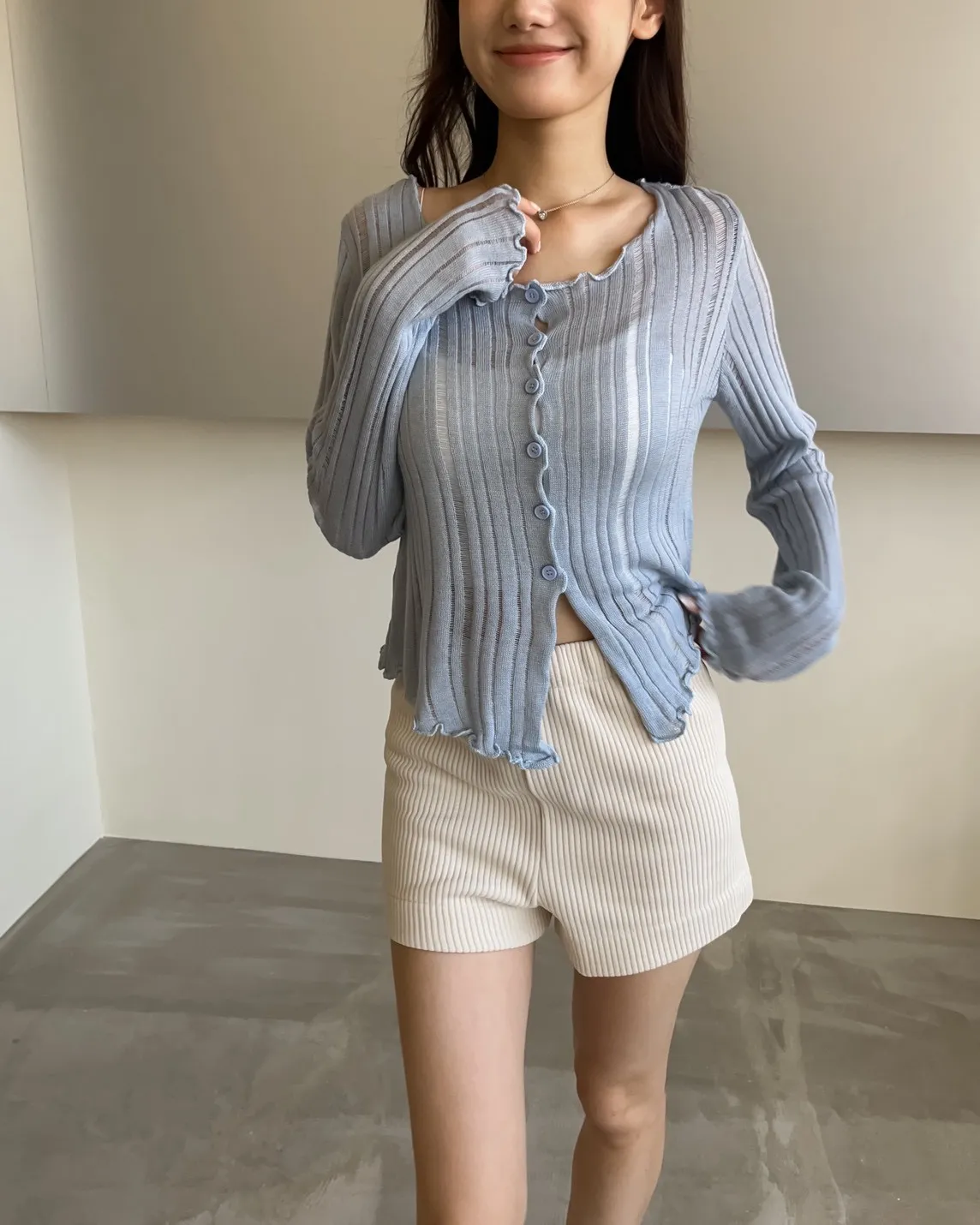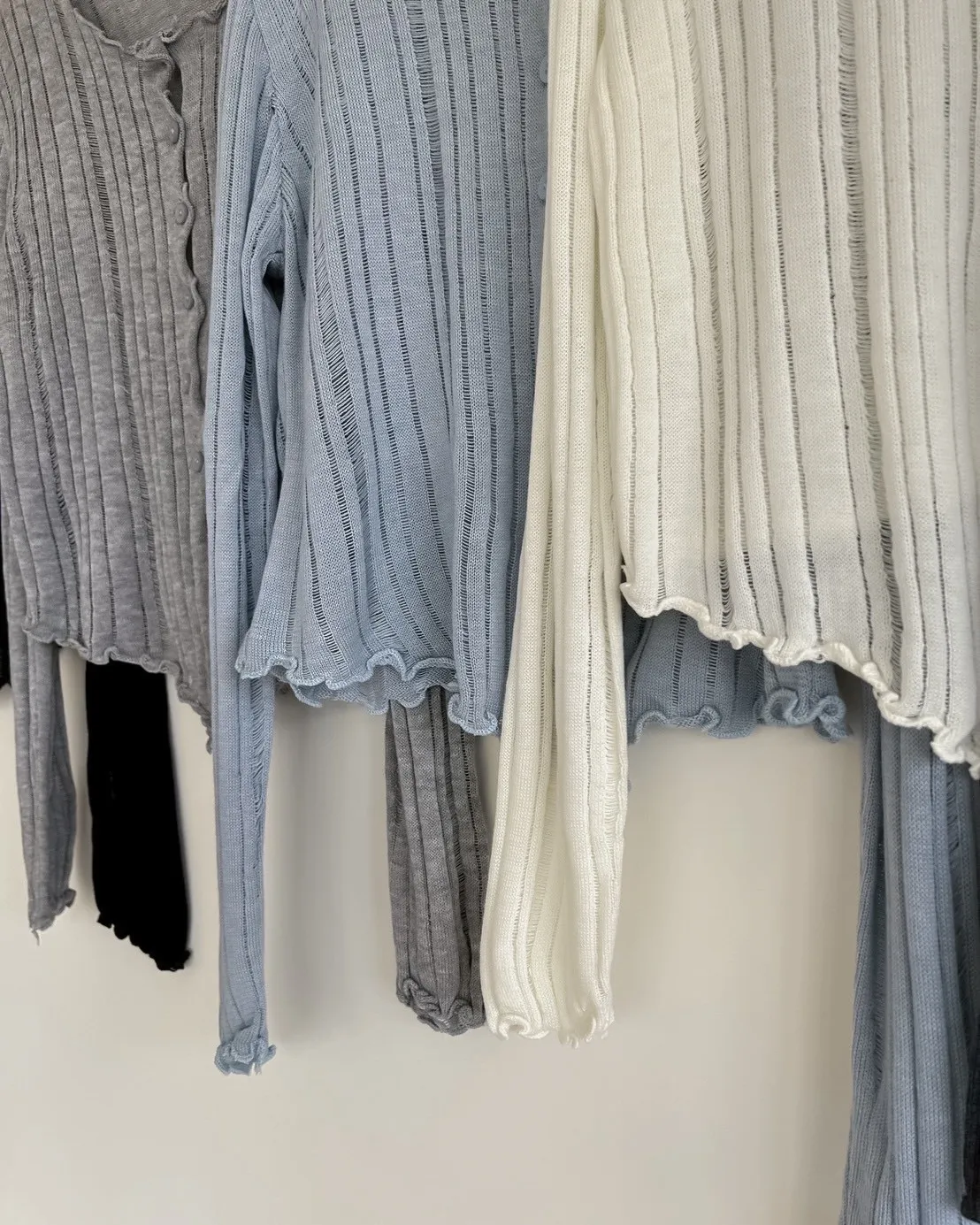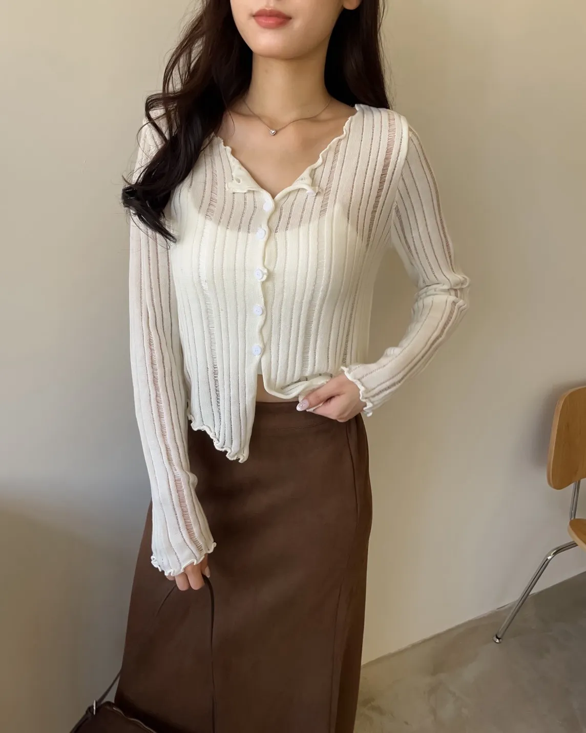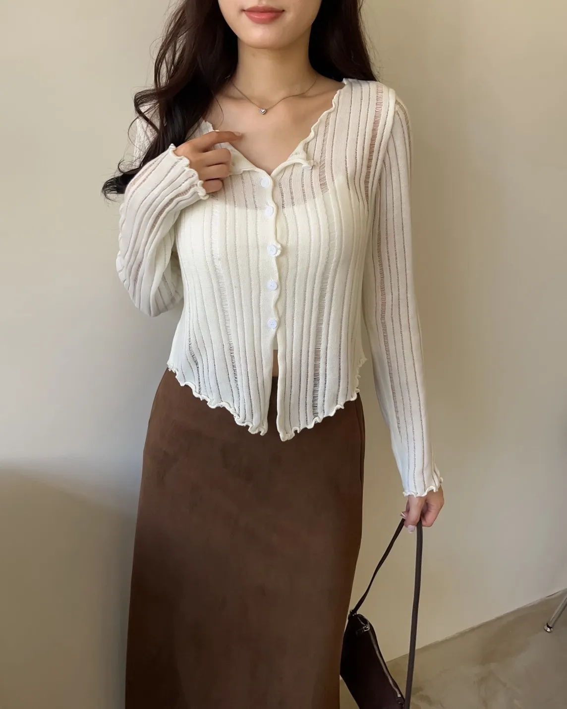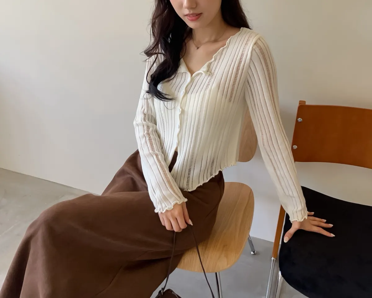 直紋鏤空 捲捲邊 同色系鈕扣 下擺V型開岔 薄針織