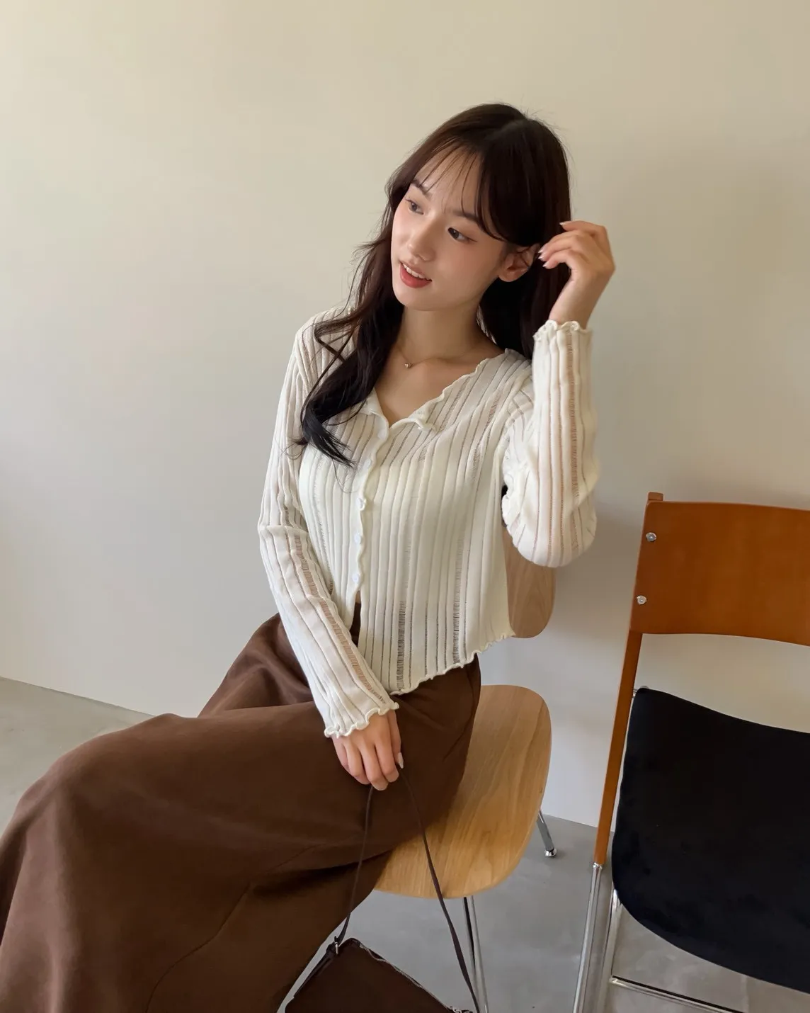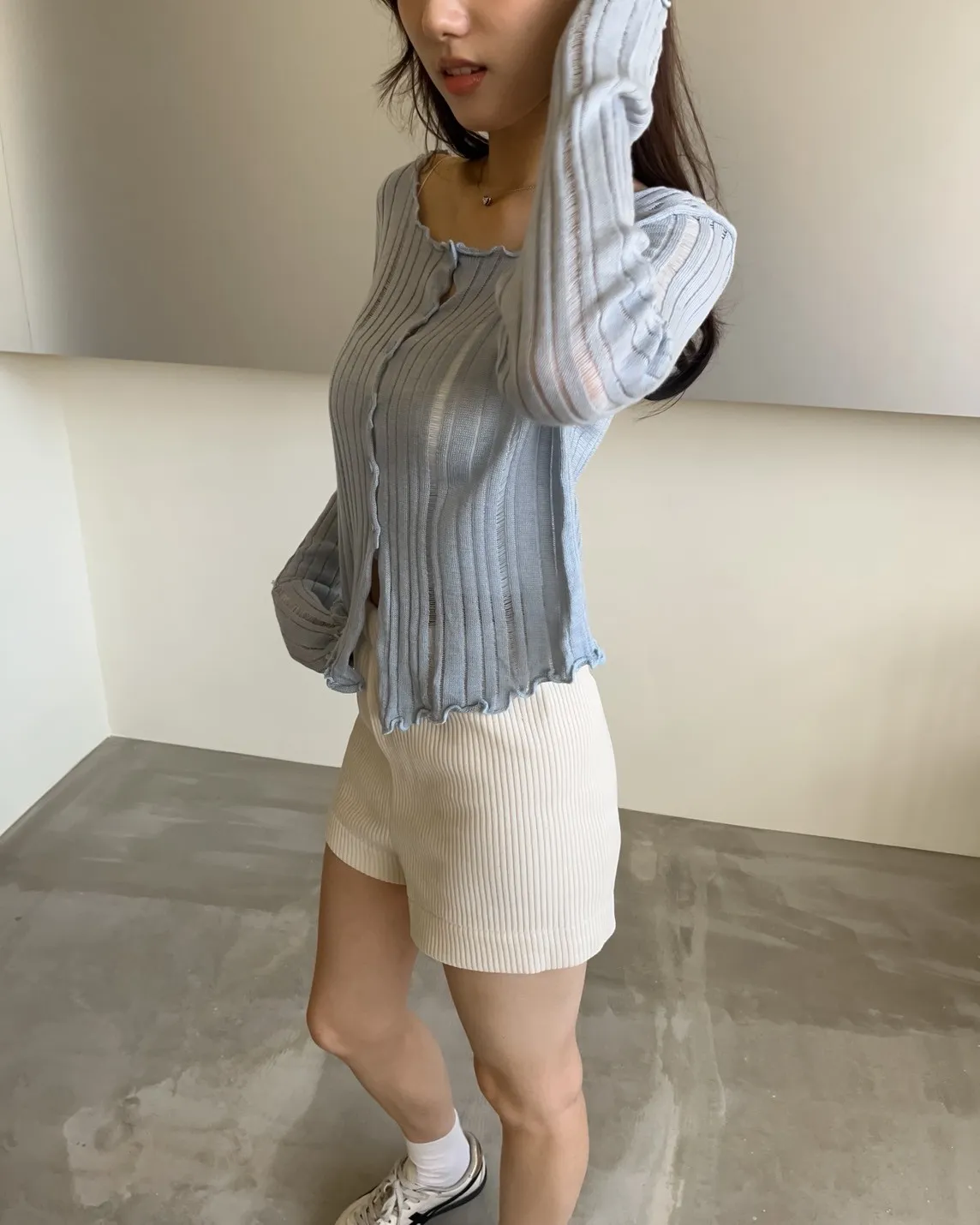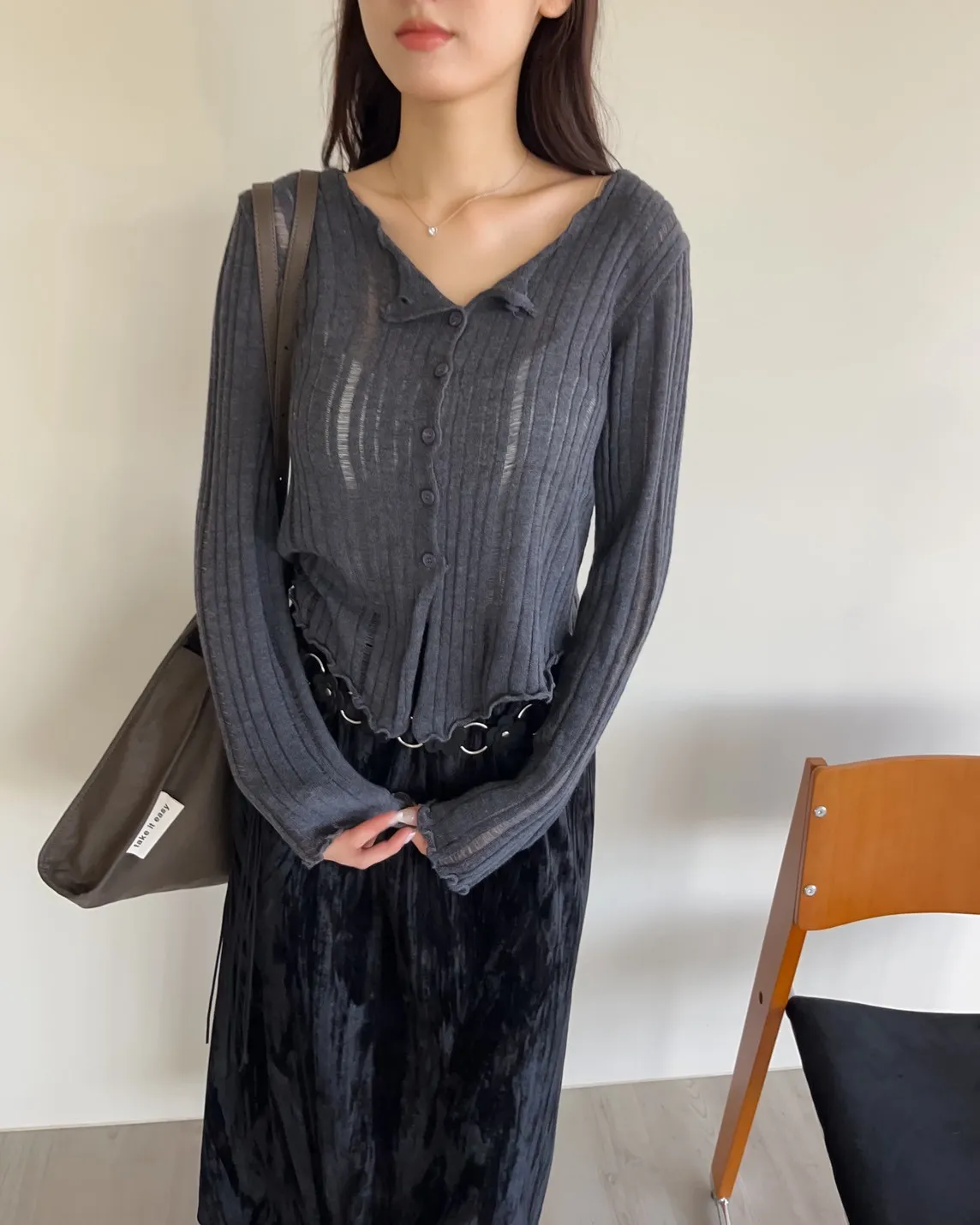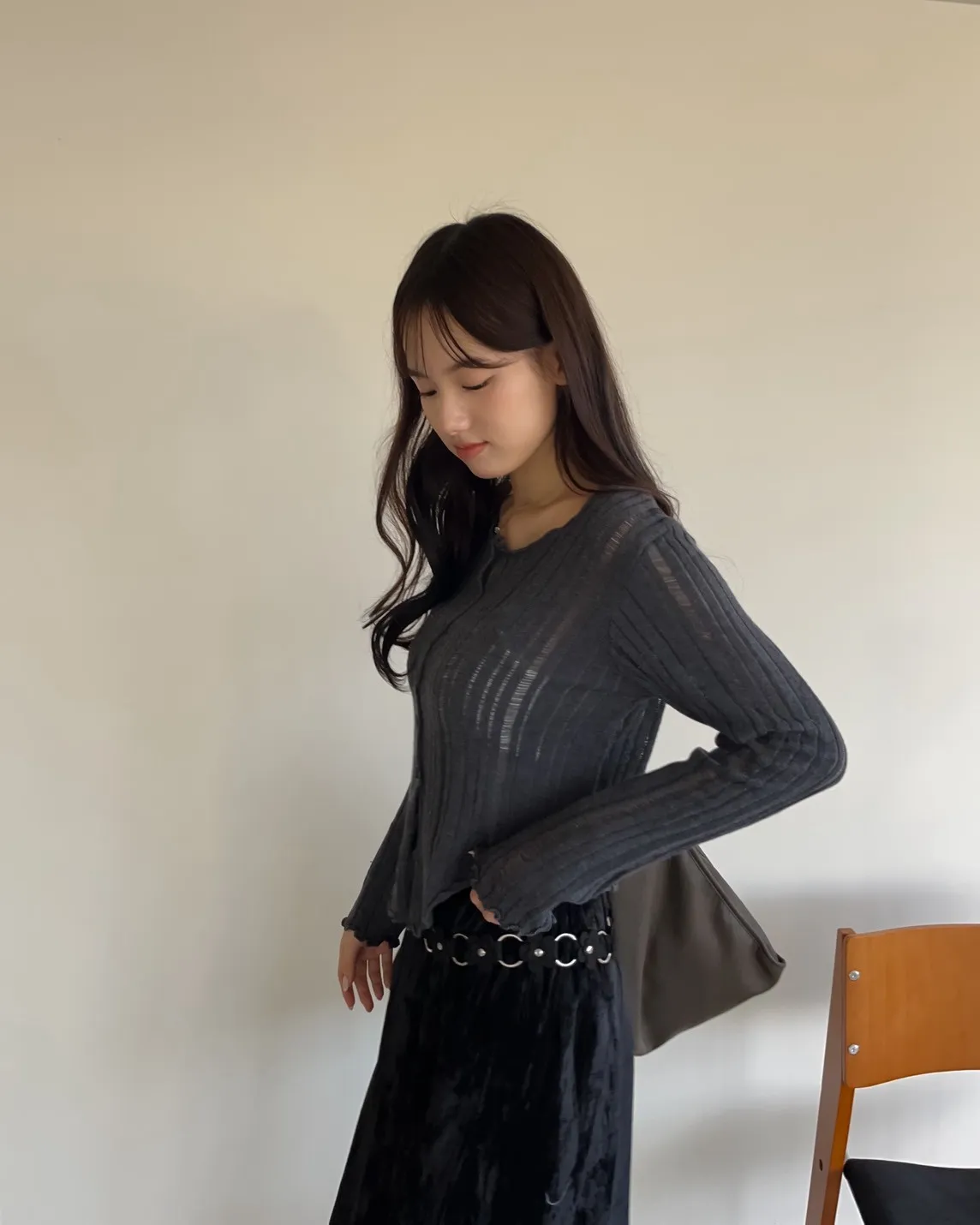 直紋鏤空 捲捲邊 同色系鈕扣 下擺V型開岔 薄針織