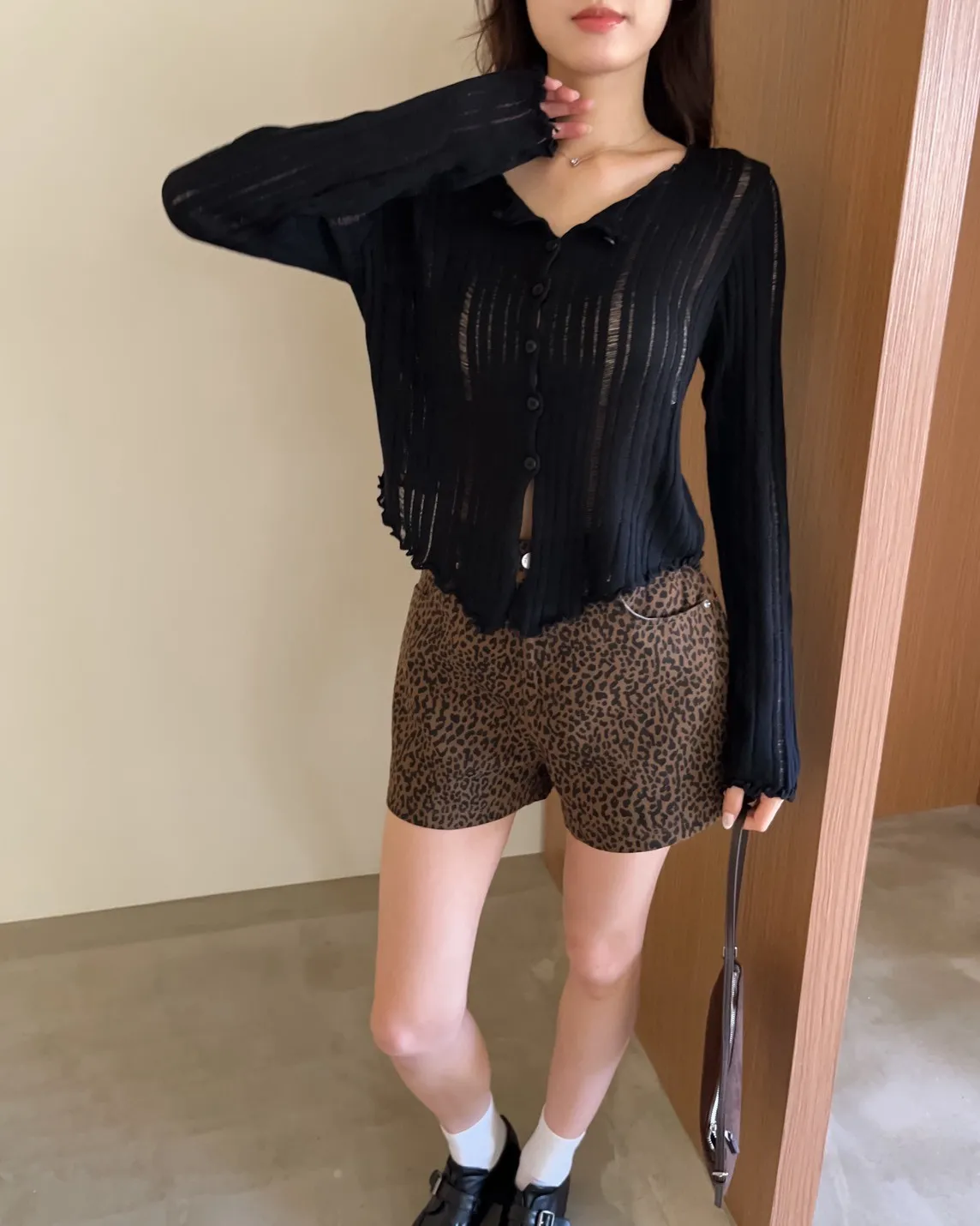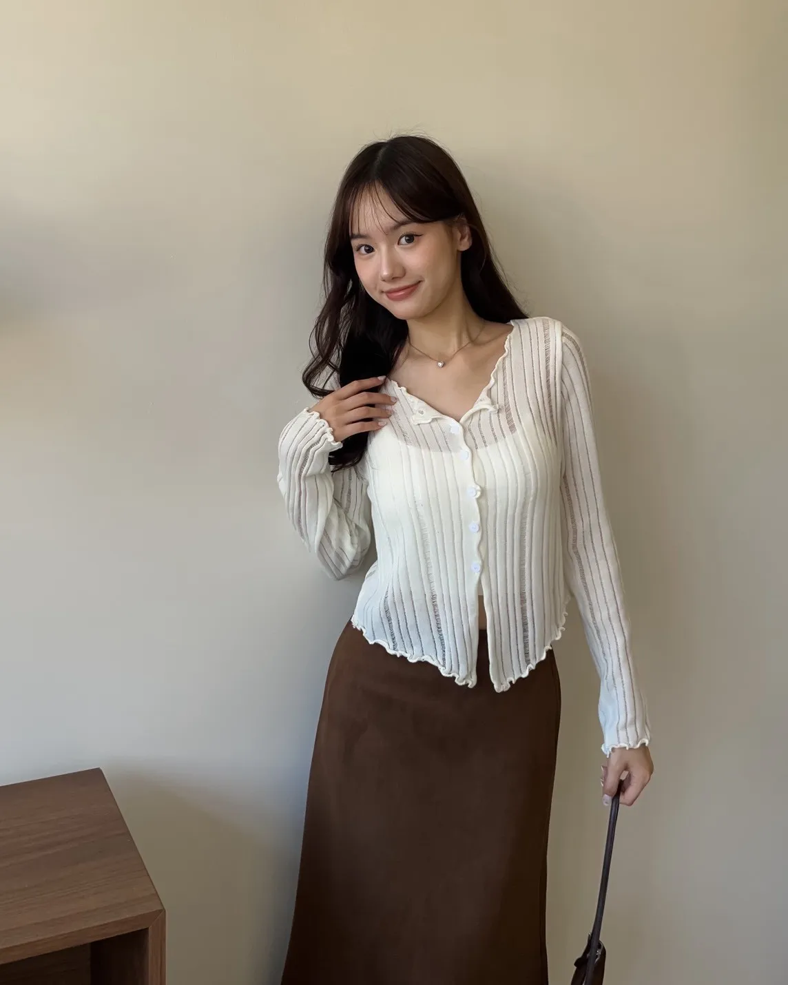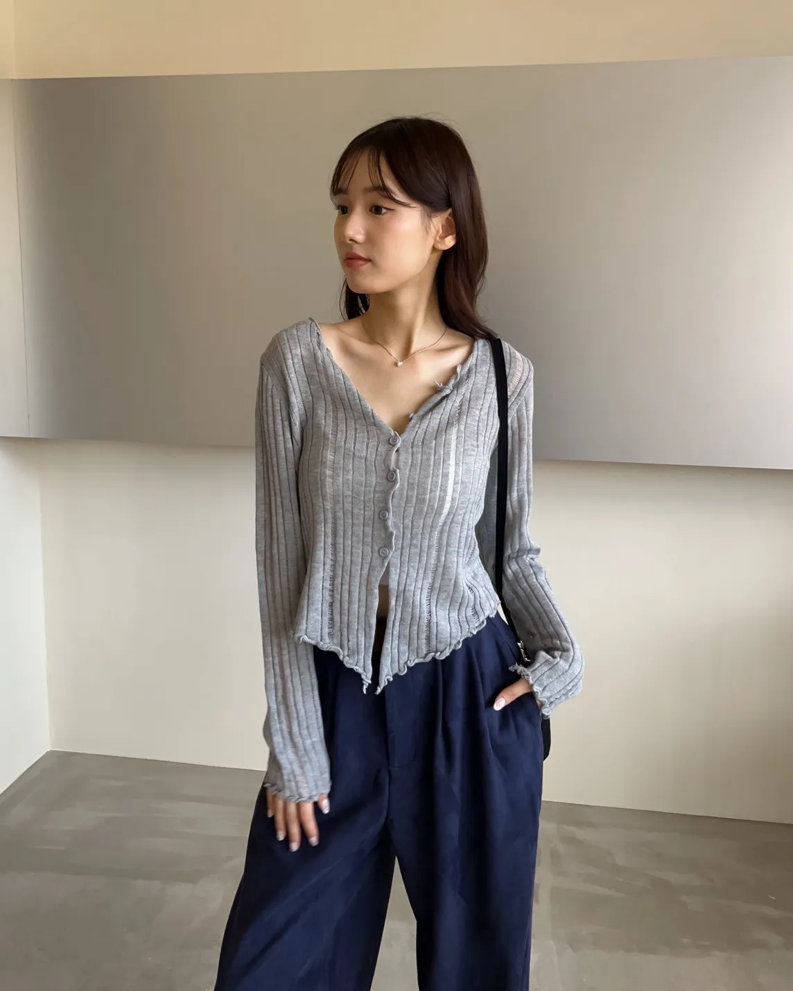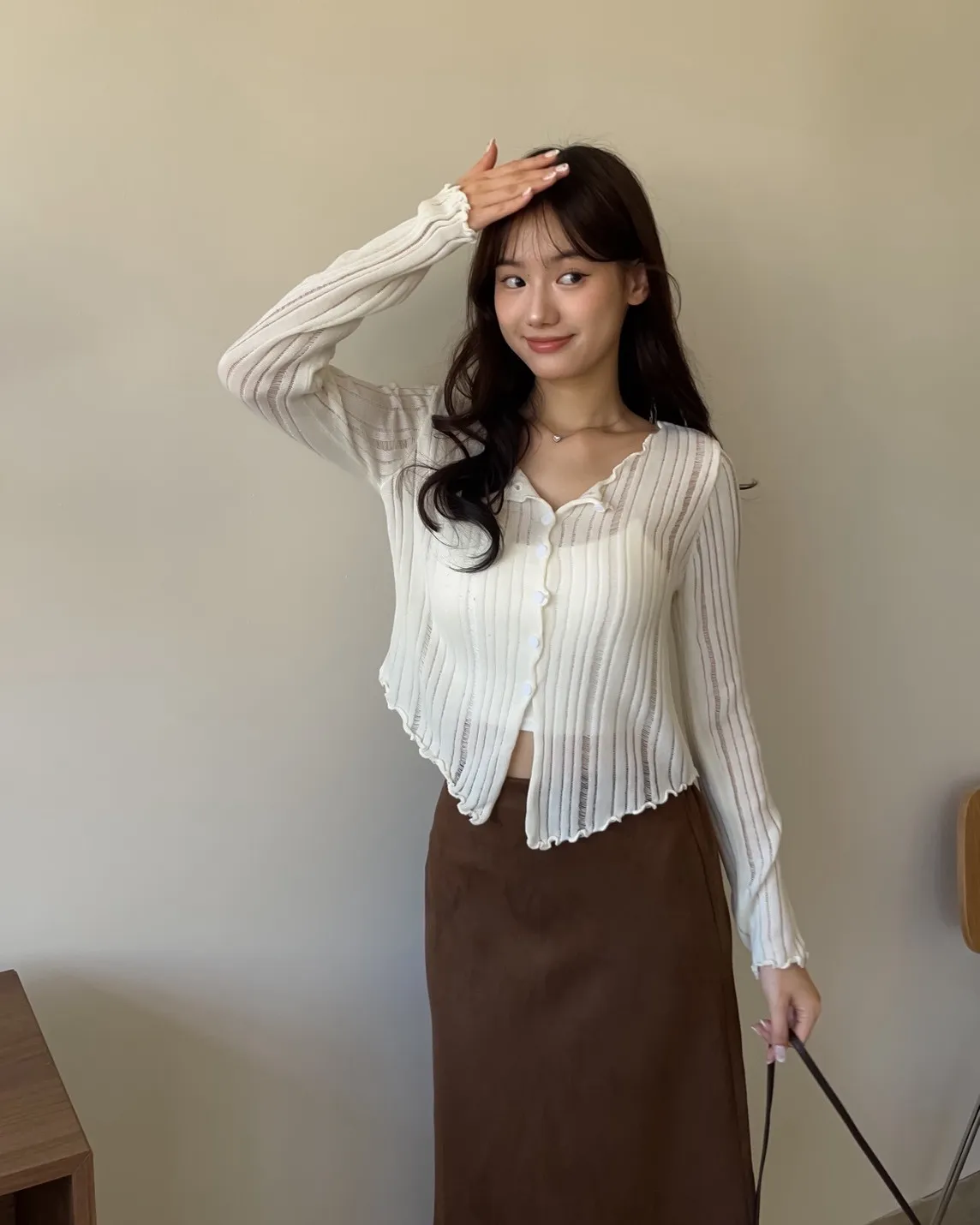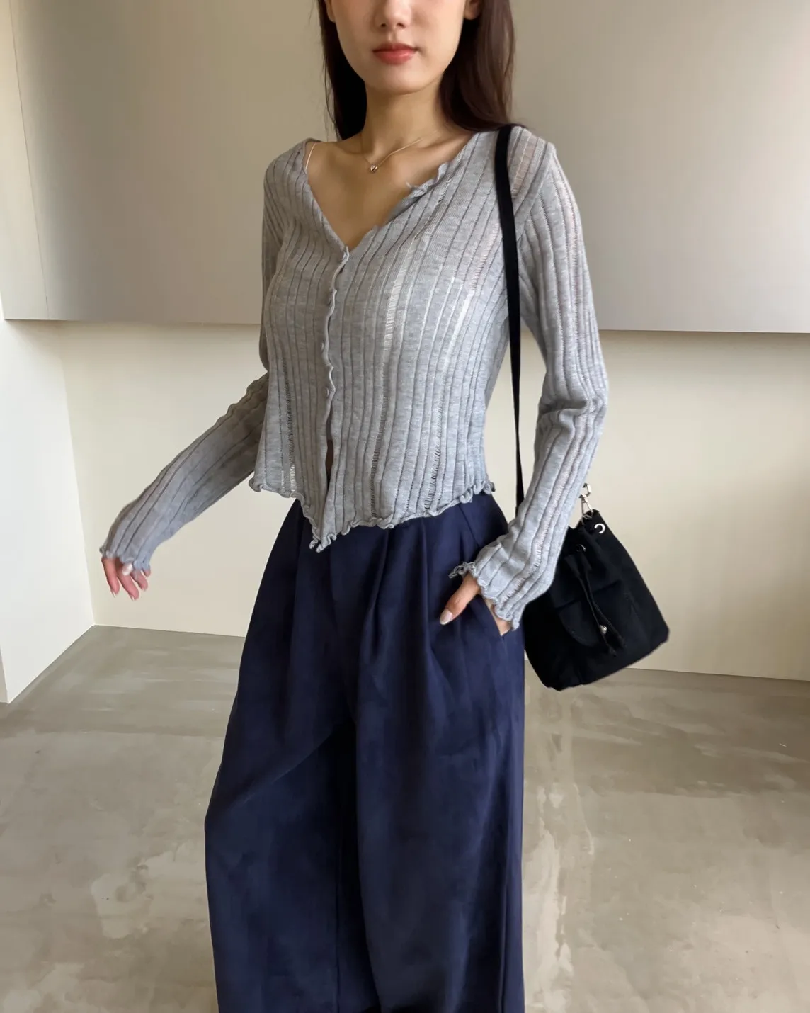 直紋鏤空 捲捲邊 同色系鈕扣 下擺V型開岔 薄針織