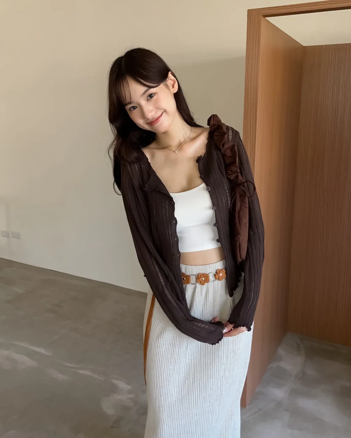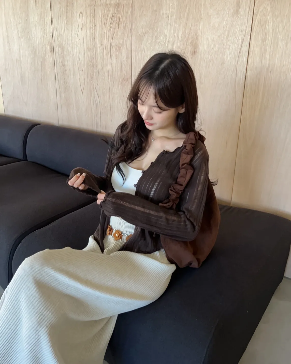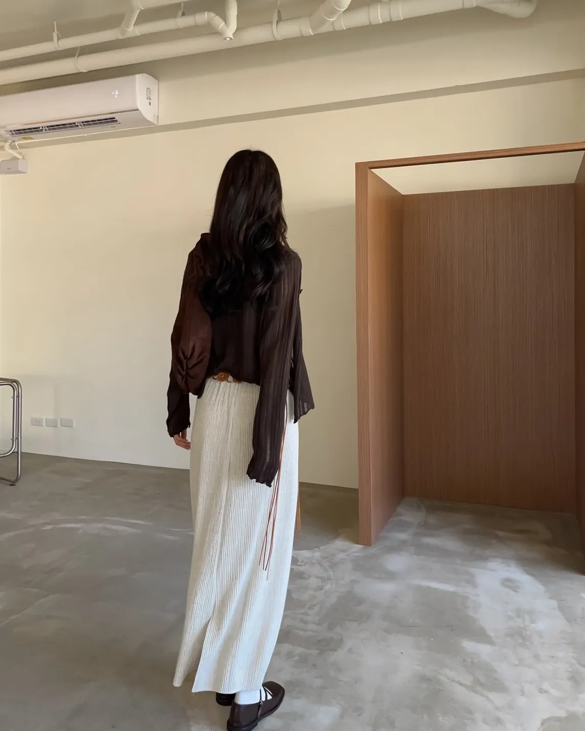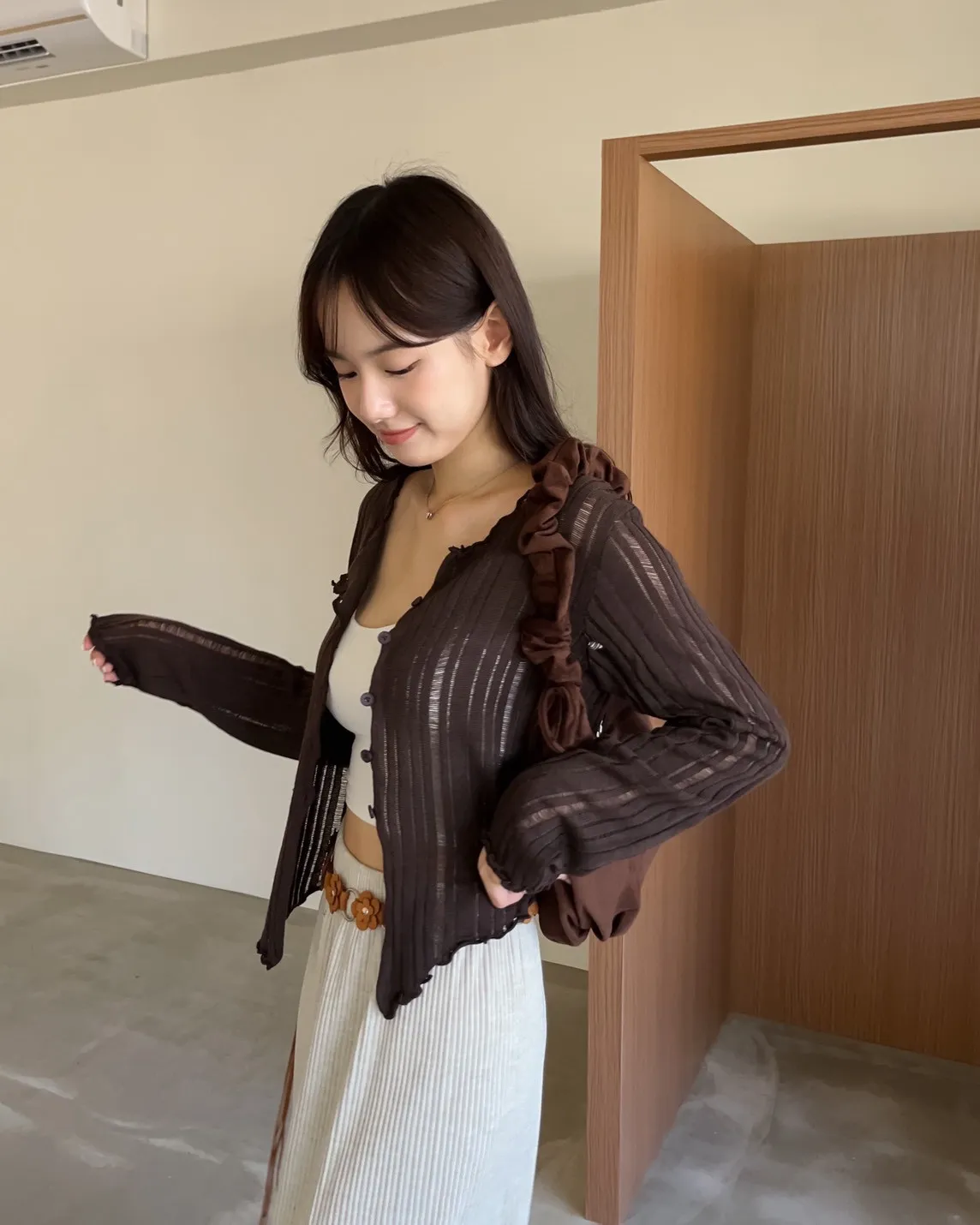直紋鏤空 捲捲邊 同色系鈕扣 下擺V型開岔 薄針織