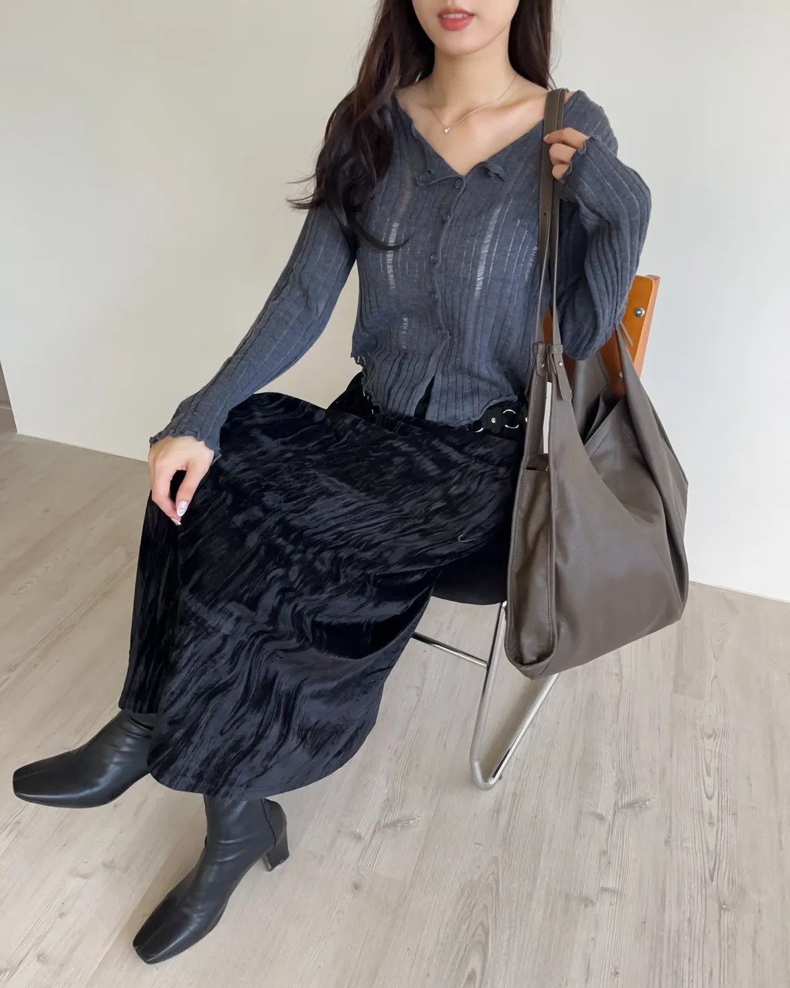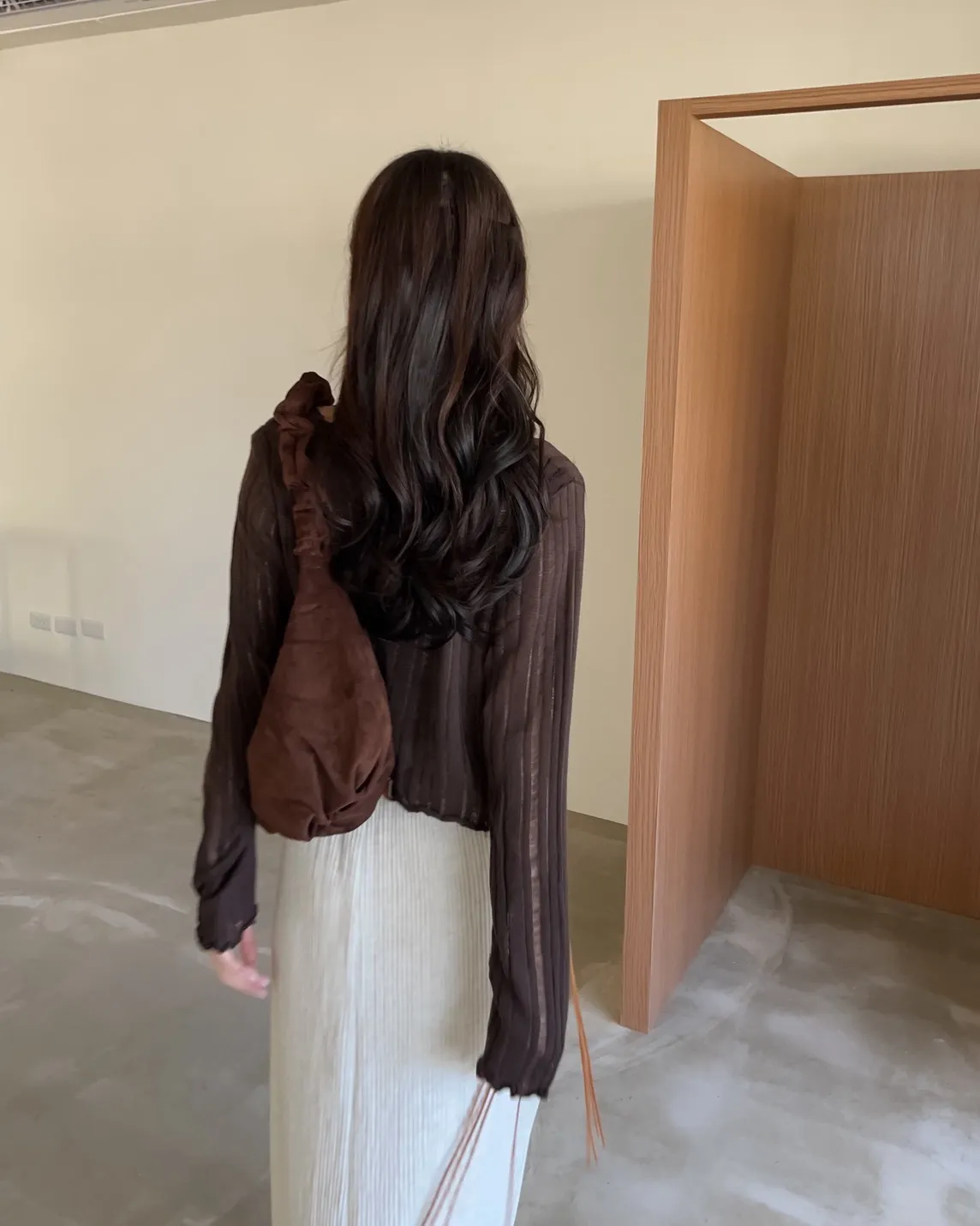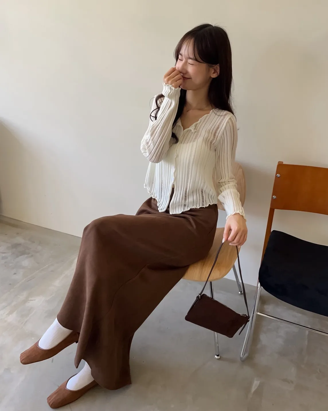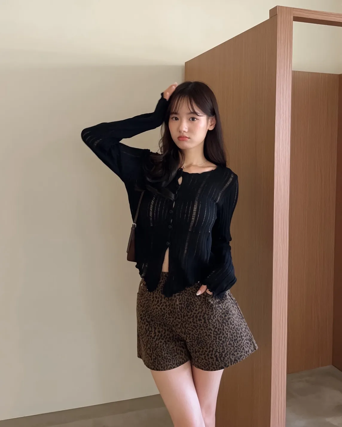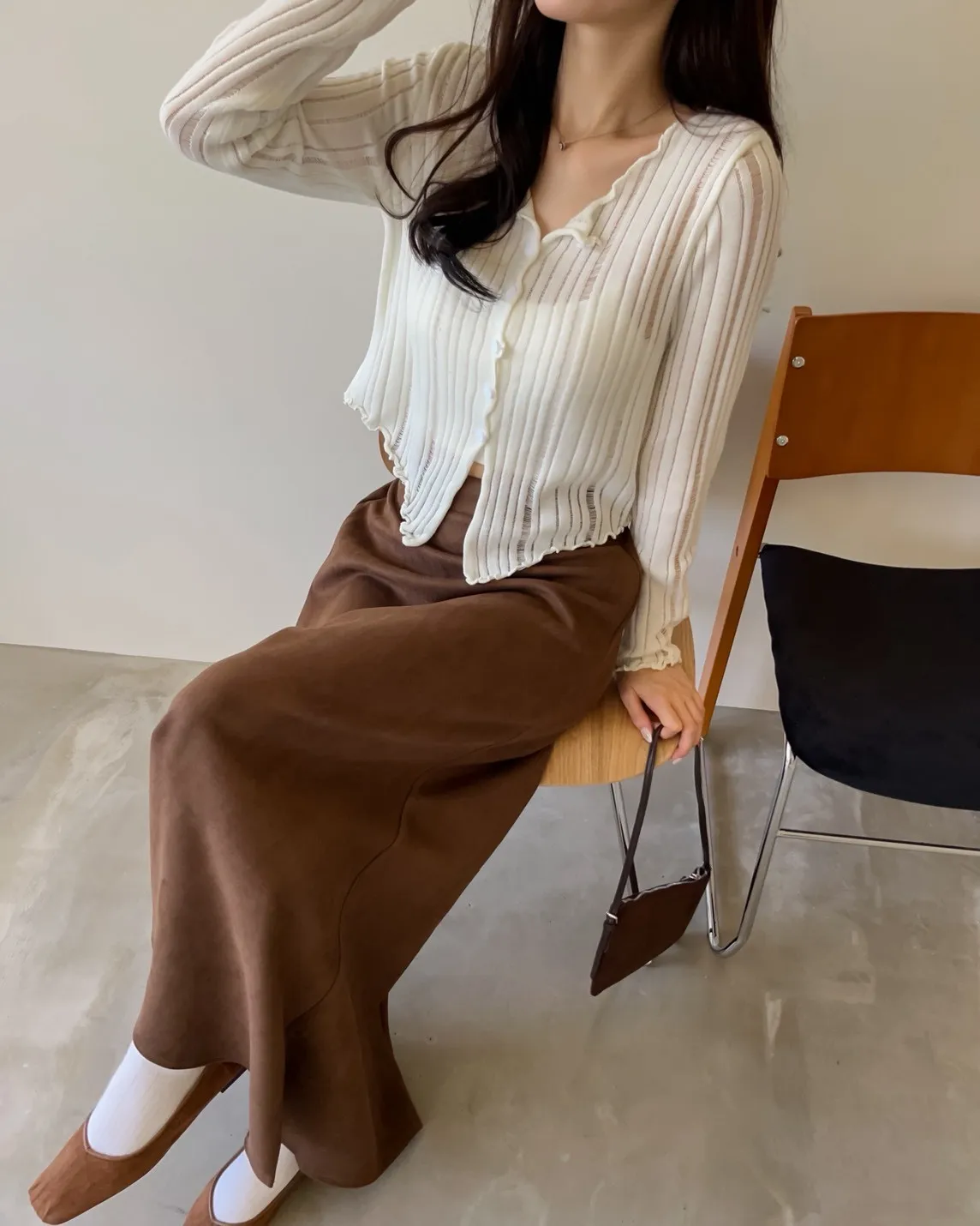 直紋鏤空 捲捲邊 同色系鈕扣 下擺V型開岔 薄針織