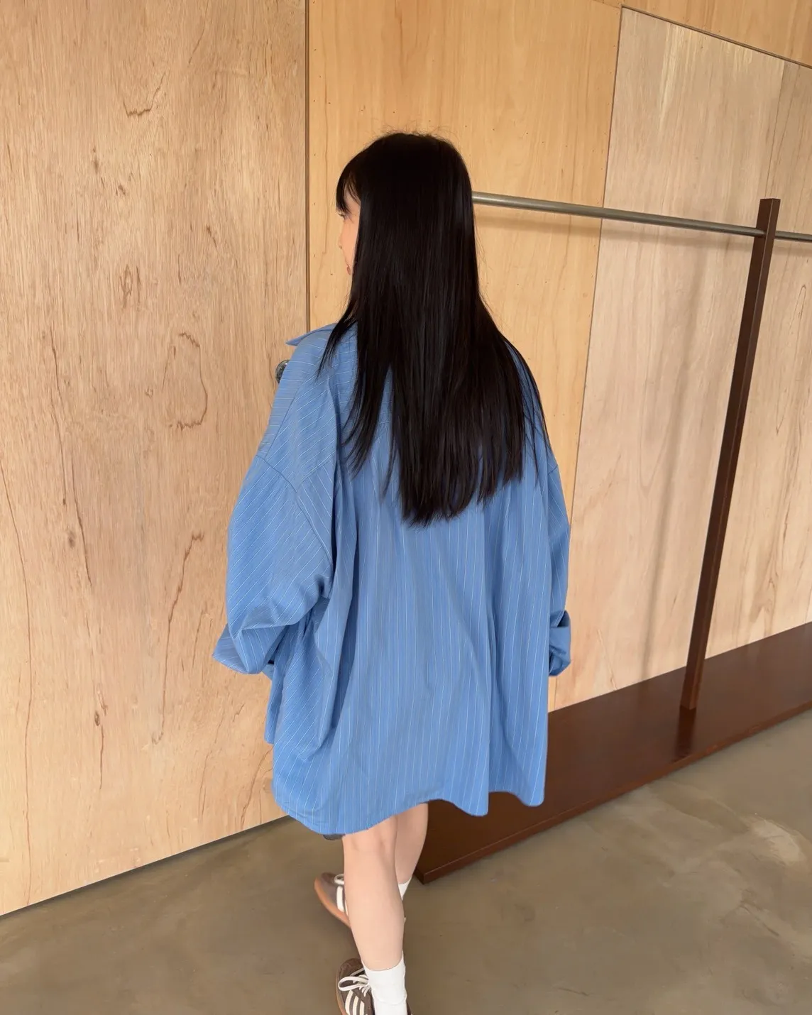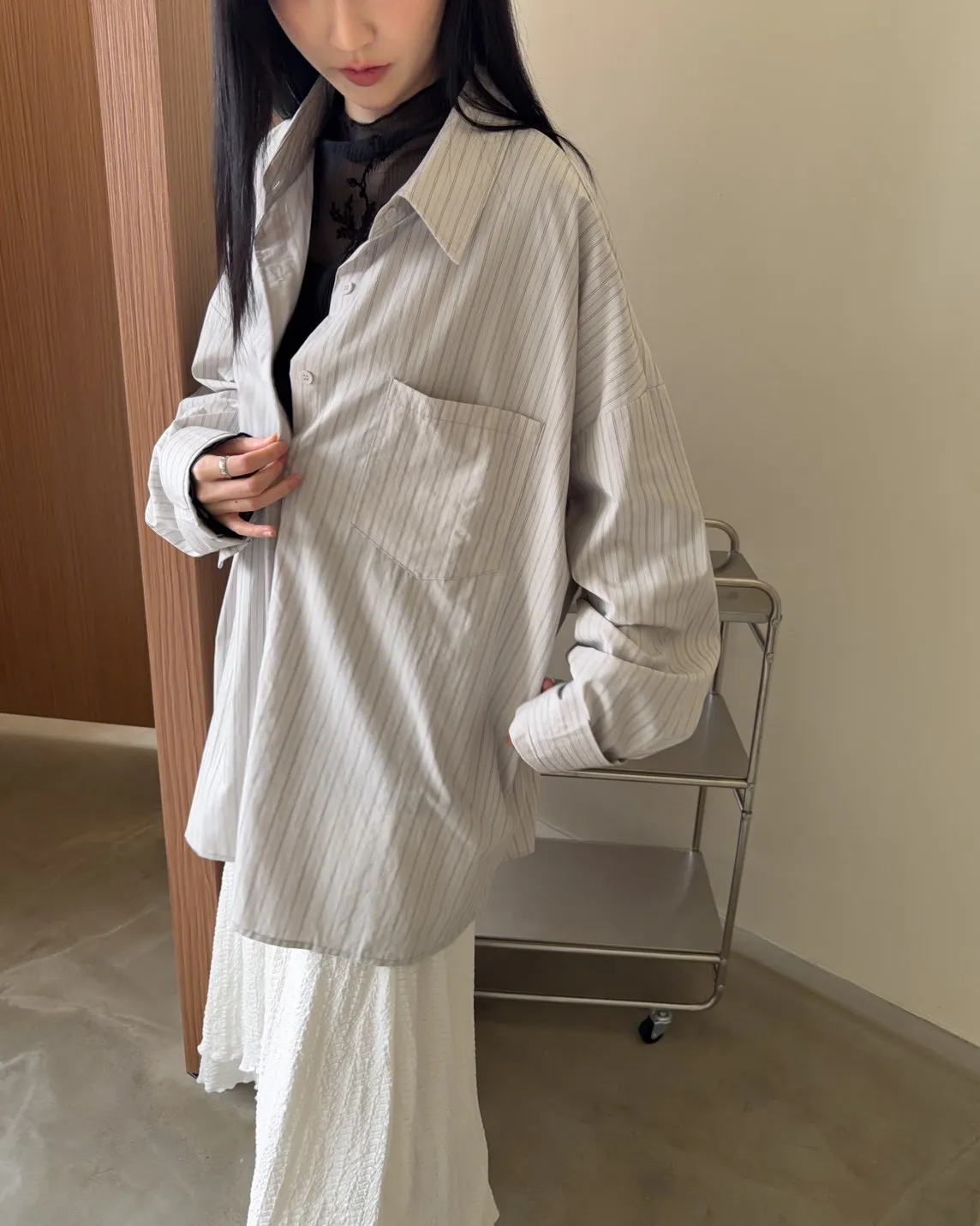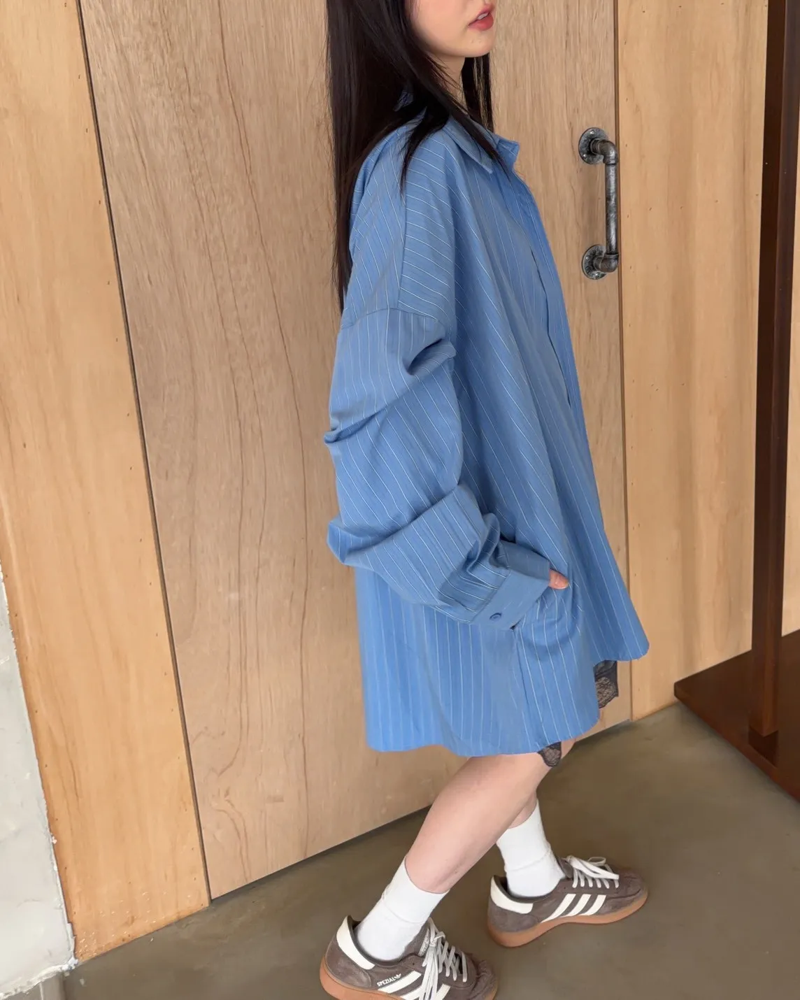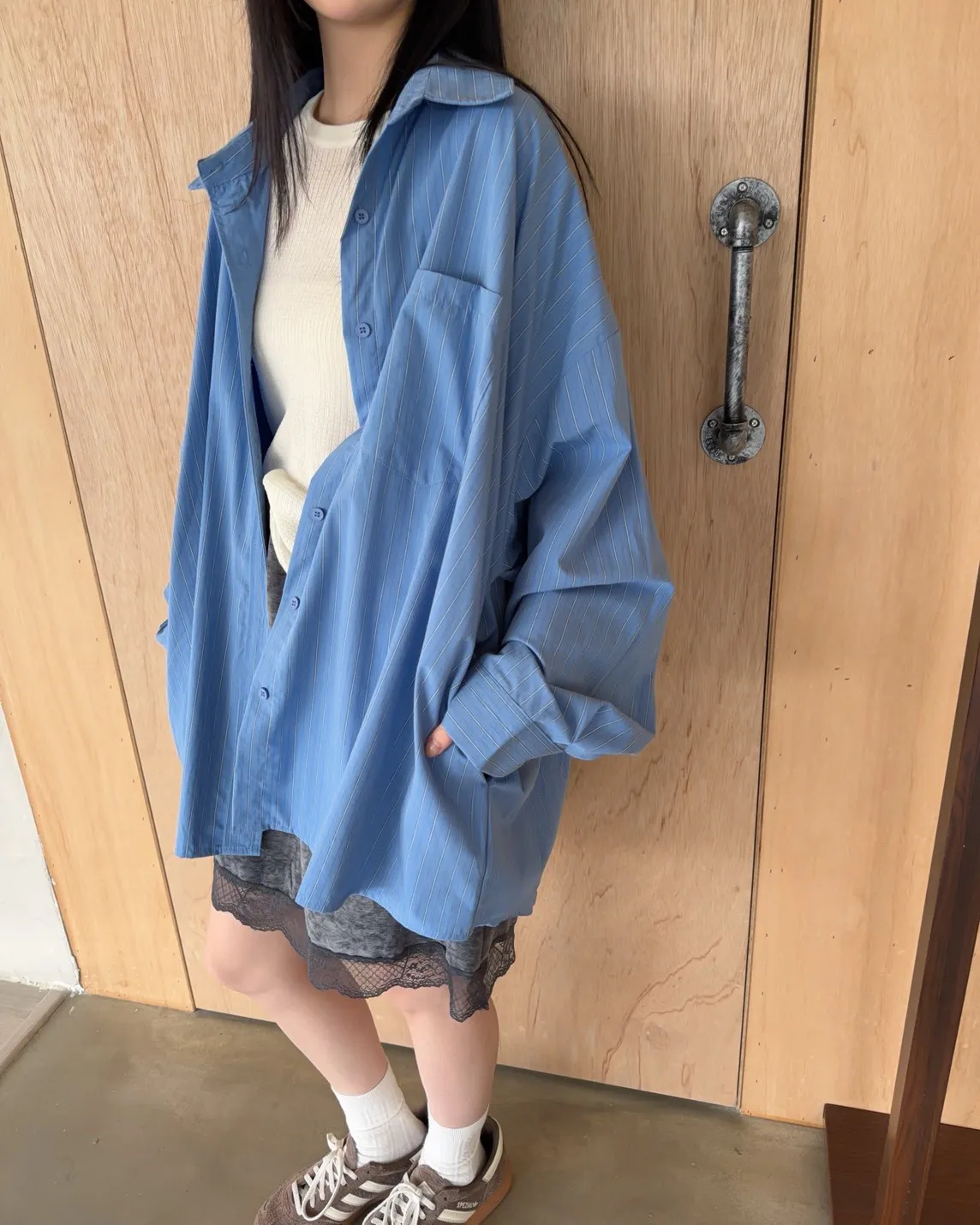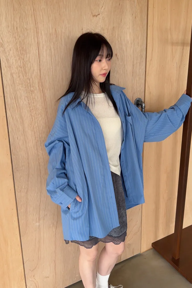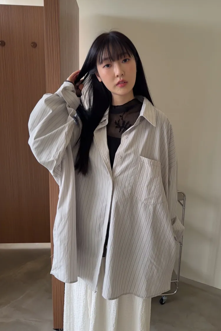 寬鬆落肩 直條紋 兩側口袋 前短後長